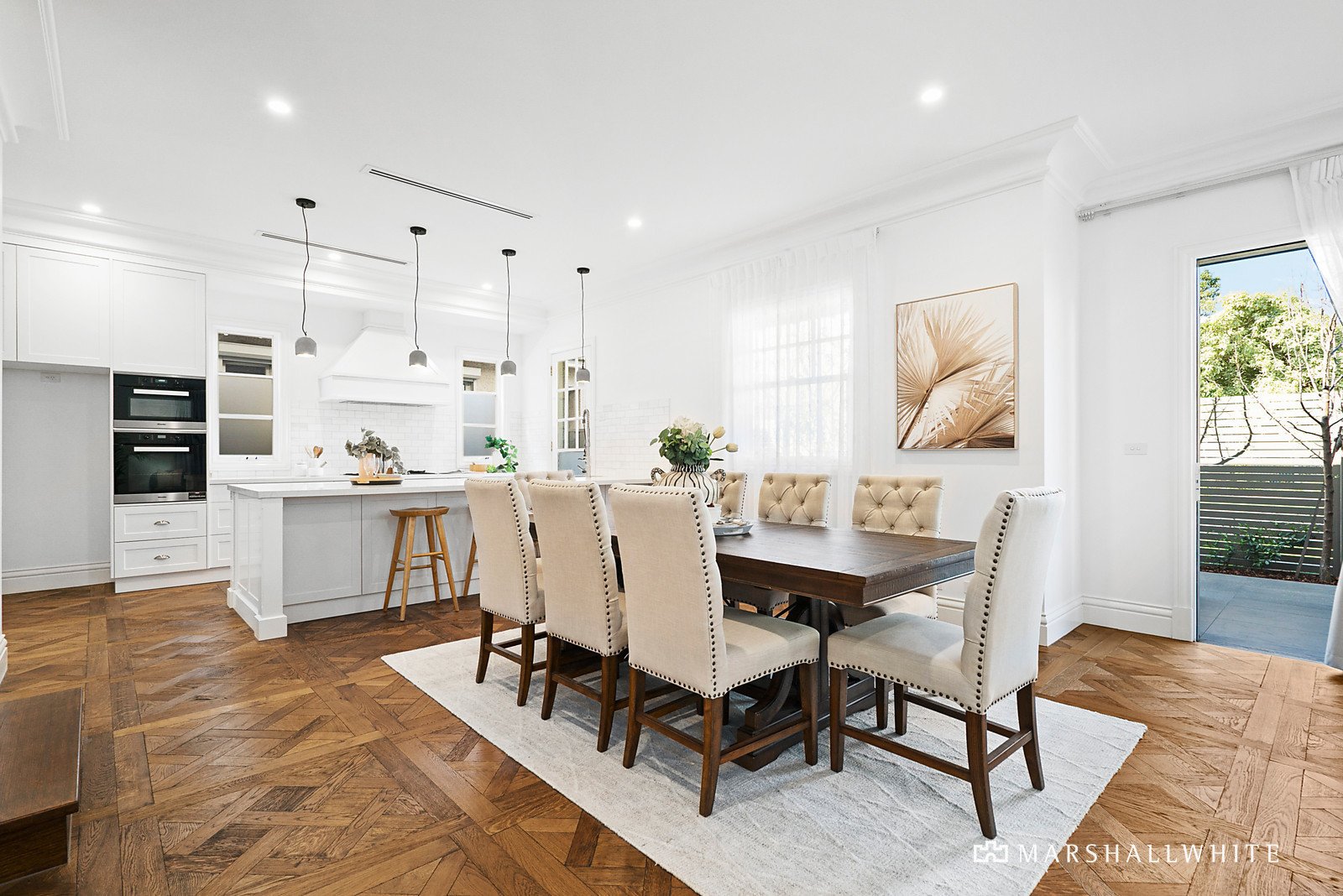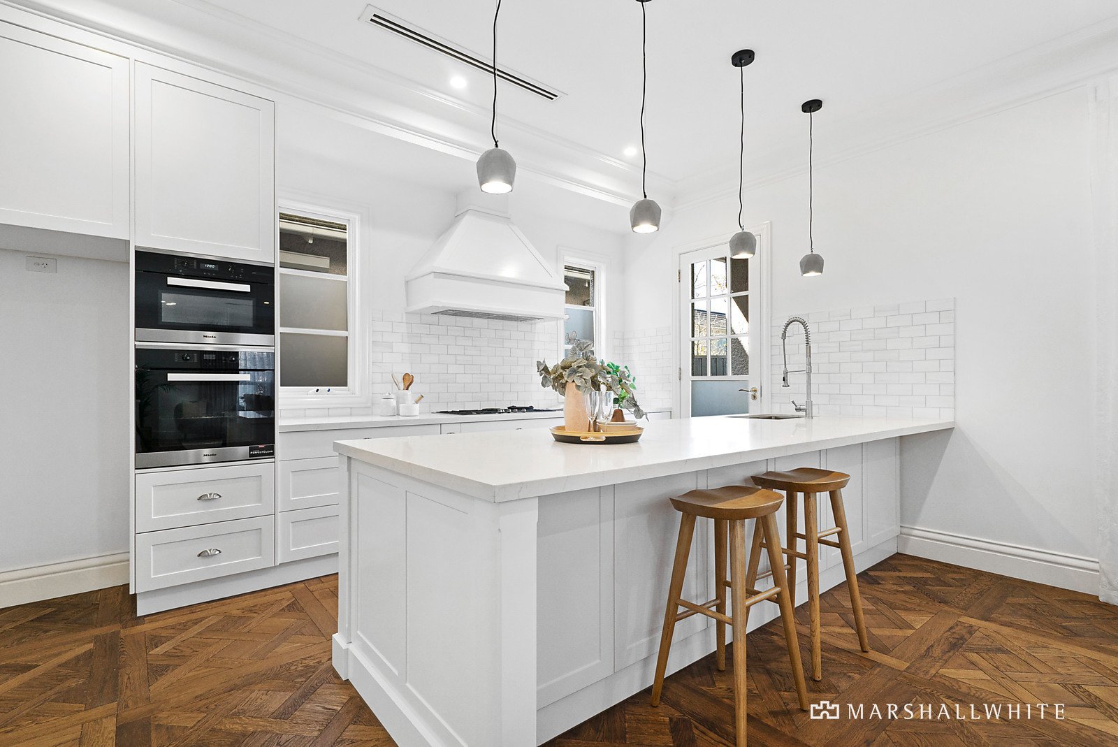 Imposing ornate double doors at the entrance reveal a broad reception hall featuring intricate Petit Versailles oak parquetry and high ceilings. The parquetry continues through to the expansive open plan living and dining room opening out to a private northeast facing covered entertaining terrace with BBQ kitchen. The Hampton's inspired gourmet kitchen is lavishly appointed with stone benches and Dolomite marble splashbacks, Miele appliances and a fully equipped butler's pantry. Opulent in scale and finish, the main bedroom with designer ensuite, bath and walk in robe sets a benchmark in luxury that is matched upstairs by three additional bedrooms with stylish ensuites and walk in robes, a large retreat, storeroom and balcony with expansive city views. On the basement level, there is a sensational home theatre with wet bar, powder-room, gym area and spacious double garage.
