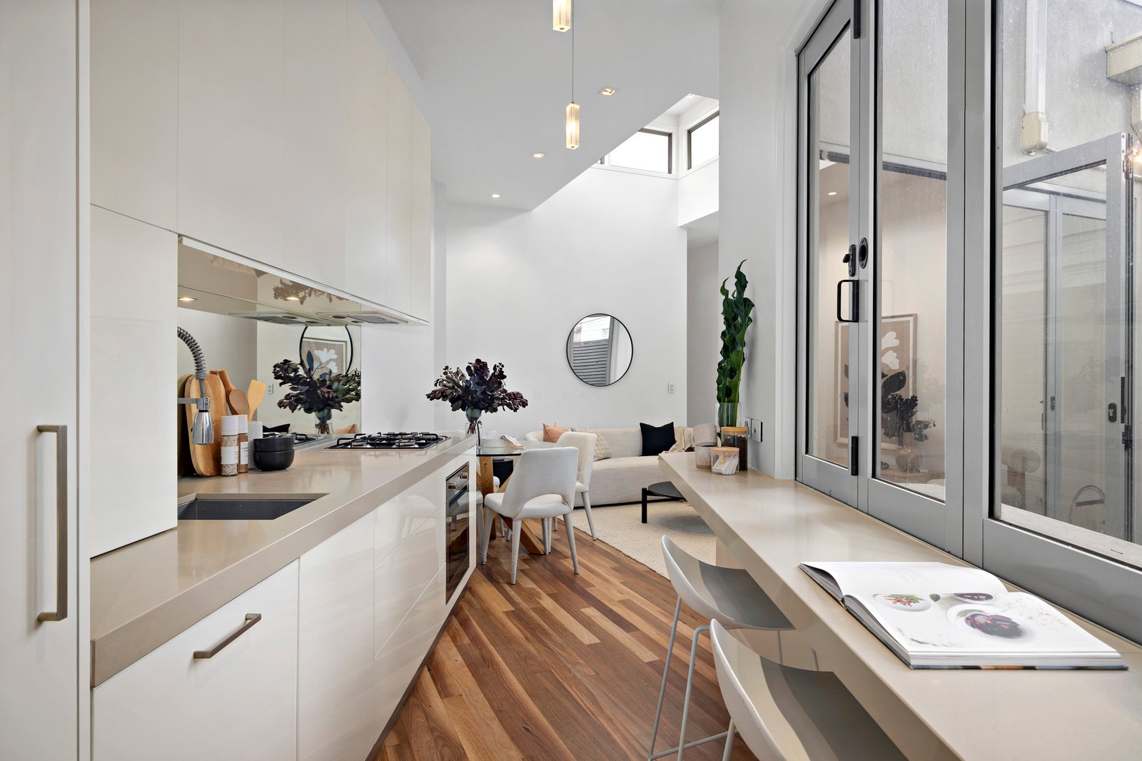 Beautifully refined spaces are led by a sky-lit hallway, revealing a fresh indoor-outdoor vision through the living and dining rooms, which catch north-easterly sun and link to the rear courtyard. High-set ceilings with clerestory windows soar above, accentuating height and natural sunlight, while bi-fold doors and servery cafe windows extend the living and kitchen areas to the deck for flawless al-fresco entertaining. Sleek stone surfaces and European appliances, including an integrated fridge, storage, and laundry facilities, maintain the streamlined aesthetic, cleverly reflecting the outdoors through mirrored splashbacks, whilst two stylish bedrooms have each been updated with built-in robes, sharing the naturally bright, central bathroom.