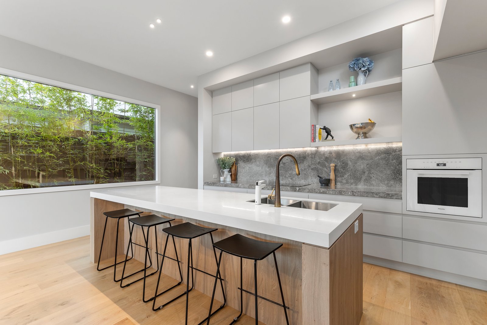 A picturesque block-fronted exterior with a black and white marble tiled verandah sets the tone for interiors featuring high ceilings and an inspired palette of oak floors and joinery, exotic marble and stone surfaces and striking Byzantine and Signorino design tiles. The wide hallway with original fretwork flows through to a versatile retreat or home office and the spectacular open plan living and dining room with an Italian Rose Quartz marble hearth gas log fire and cocktail bar. The sublime gourmet kitchen is impeccably appointed with Silver Galaxy Dolomite and Himac benches, Miele appliances including integrated fridge/freezer, antique bronze tapware and a Billi tap. Corner opening full height glass sliders open the living space to the stunning northeast facing private landscaped garden with undercover bluestone terrace and BBQ, the perfect venue for al fresco dining. The lavish main bedroom with a gorgeous designer en suite with skylight, bath and walk in robe and a second double bedroom with robes are downstairs while on the level above, there are two additional robed bedrooms and an opulent bathroom with full sized bath. All the bathrooms feature Silver Galaxy Dolomite and antique bronze tapware.