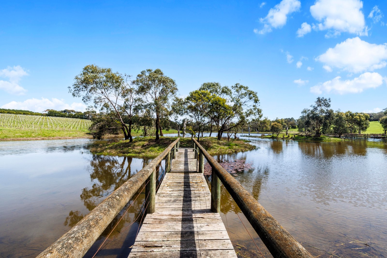 Privately set behind an automated gate, a winding driveway passes through lush rows of Chardonnay and Pinot Noir perfectly suited to the area’s unique terroir. Currently under contract and management to an acclaimed local winery, these vines provide a scenic source of passive income for at least the next three years. A bridge crosses the waters of a picturesque lake, with islands and bridges, that feeds into a creek gully. Lush and green, the undulating landscape incorporates a series of dams, cleared land, machinery sheds, and fenced paddocks. There is a three-bedroom two-bathroom timber manager’s cottage on site, with a large north westerly facing deck overlooking the lake and vineyards, the perfect spot to build a dream home. Functional and liveable for now, the solidly-built residence features high raked ceilings, a woodfire heater, split system heating/cooling, a study, and a well-equipped central kitchen. Set in front of a turning circle, there is also a double garage with internal access door, and a rear undercover alfresco zone.