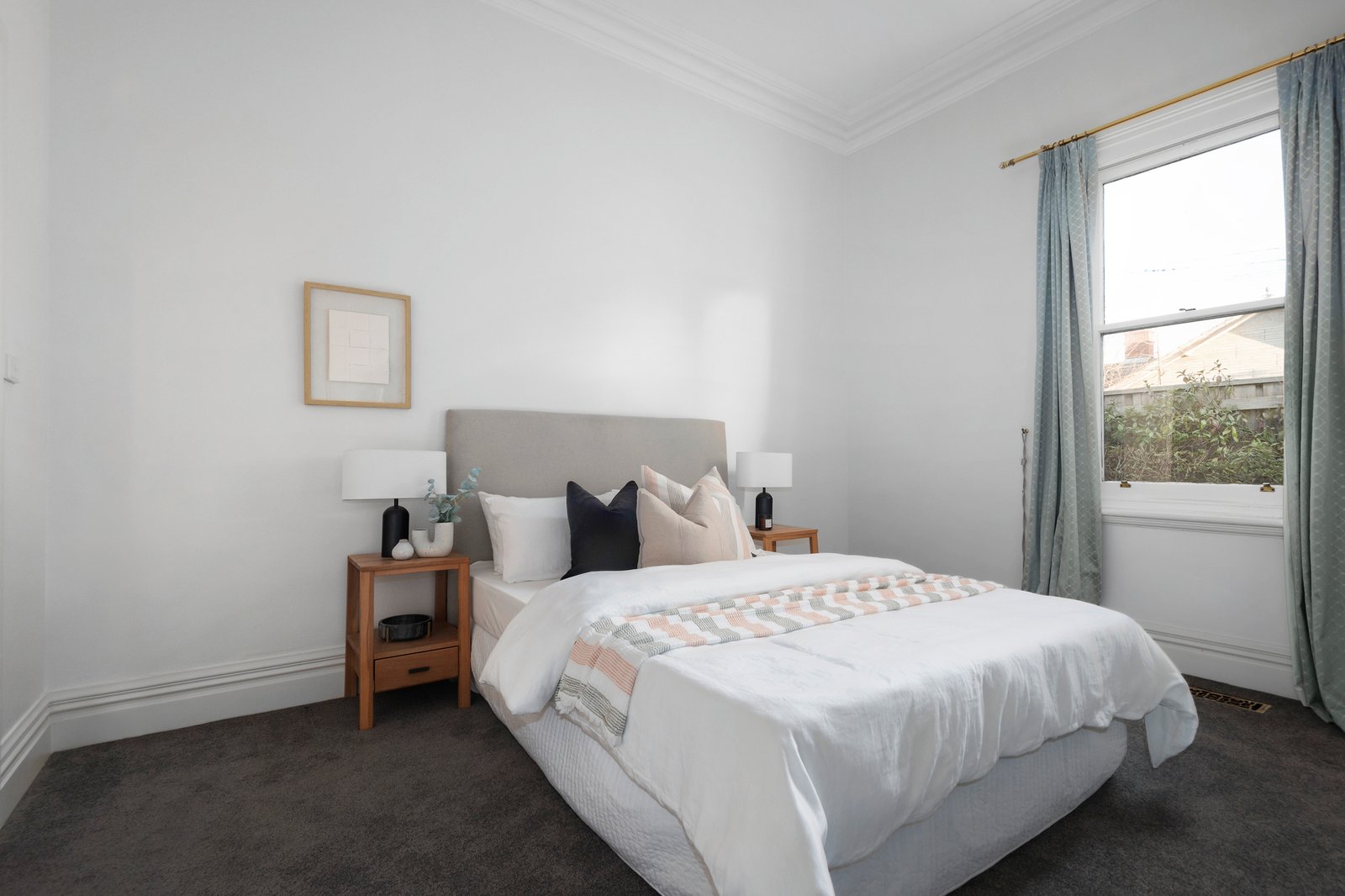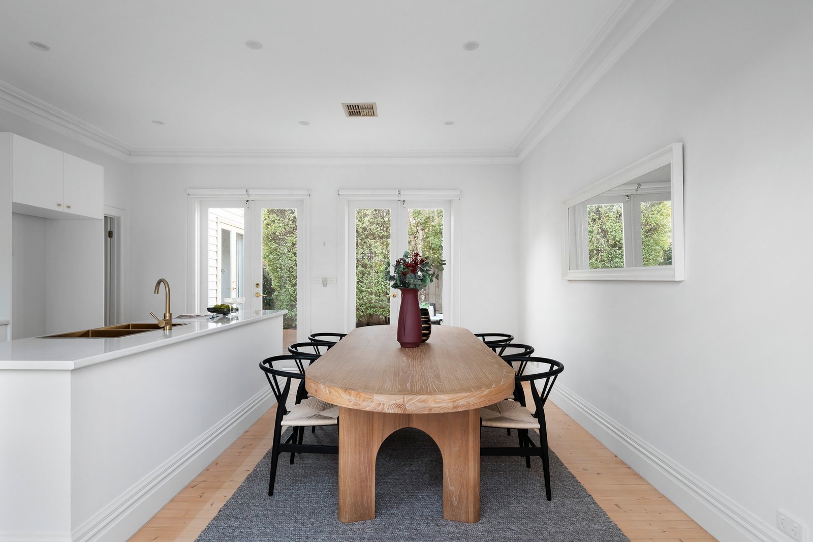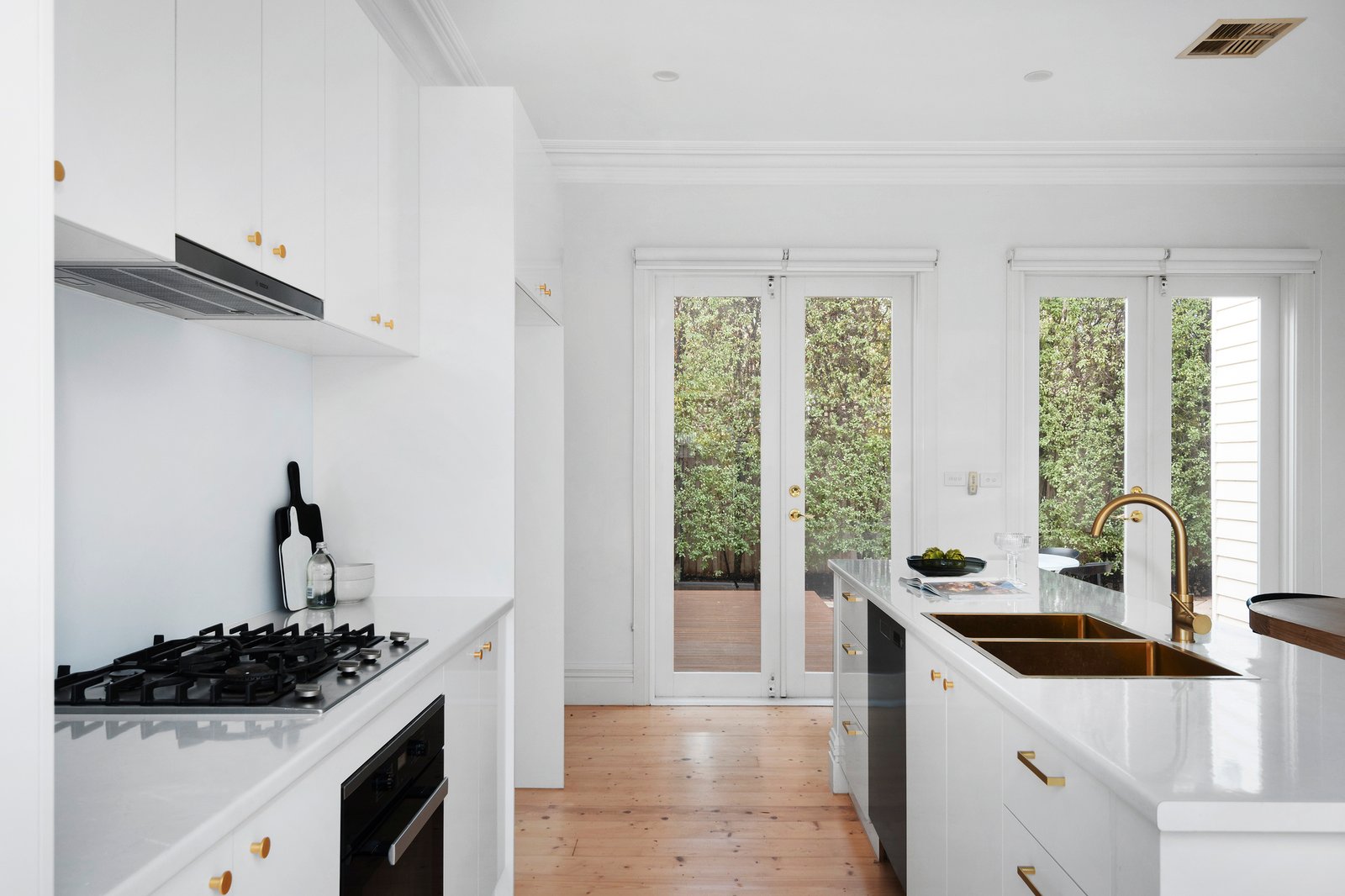 Pale Baltic pine floors accentuate the wonderful light-filled allure in the wide central hall, generous living room with an open fire and box window and the superb kitchen with a Miele oven and adjacent dining. A series of French doors open all the living spaces to a sunny north-facing deck and hedged private garden, a serene oasis for al fresco dining. The three double bedrooms all with fireplaces and ornate ceilings are complemented by a stylish bathroom with Euro-laundry.