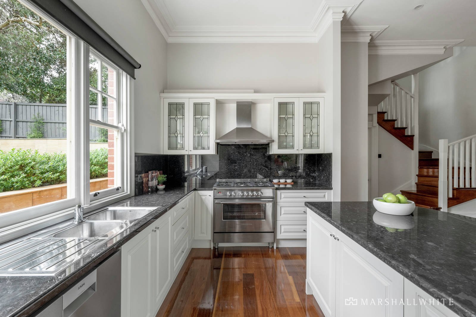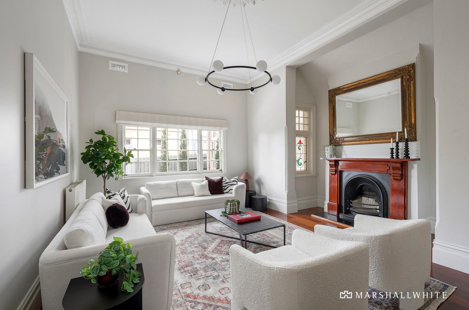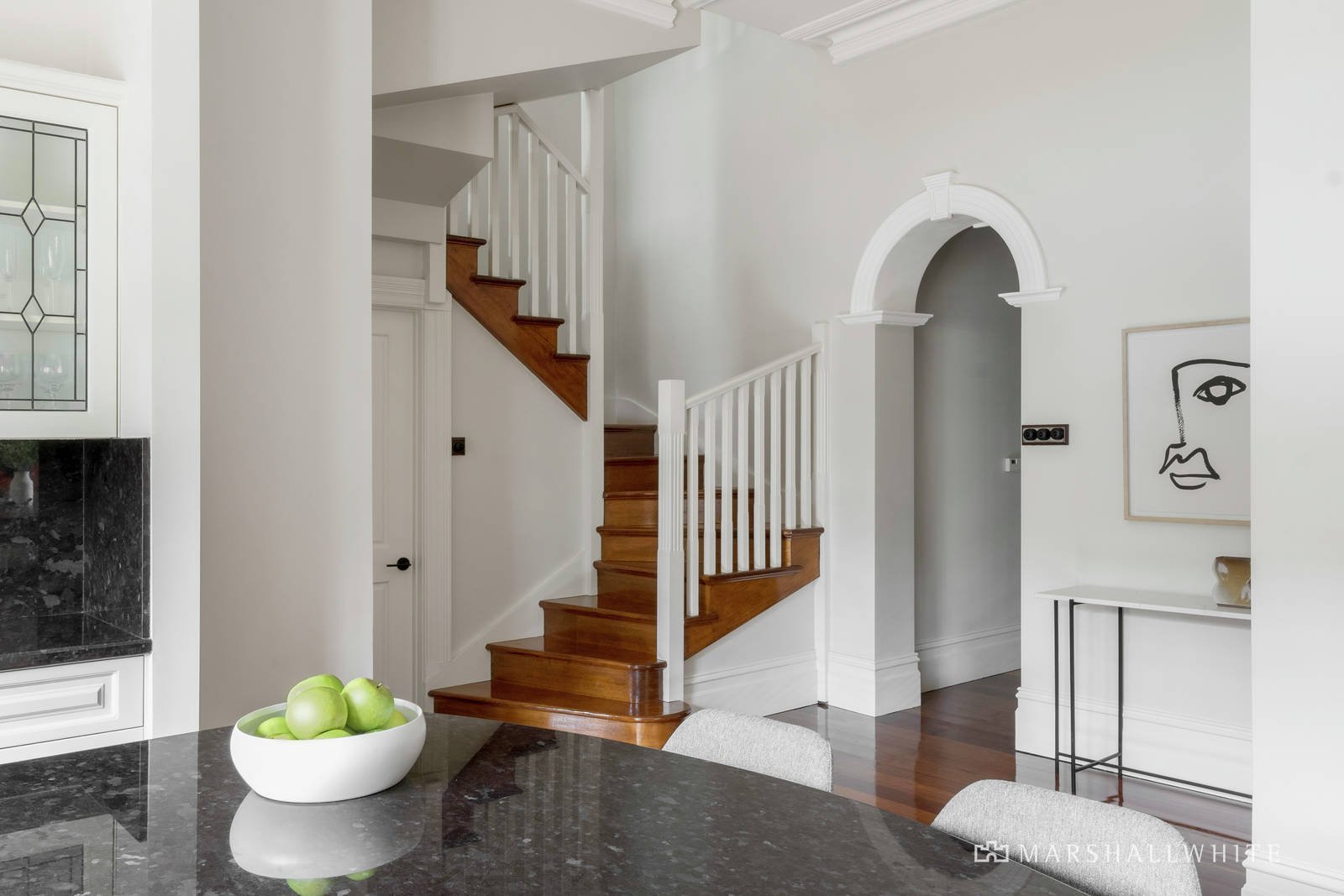 Elevated and set back on 962sqm, you are greeted by the grand return veranda, leading to the elegant formal entry hall with its stunning central arch. Soaring rose ceilings, open fireplaces and rich polished hardwood floors enhance the grace and refinement of the original era, before leading to the luxuriously renovated contemporary spaces and captivating north facing alfresco entertaining area, designer pool and manicured rear garden.