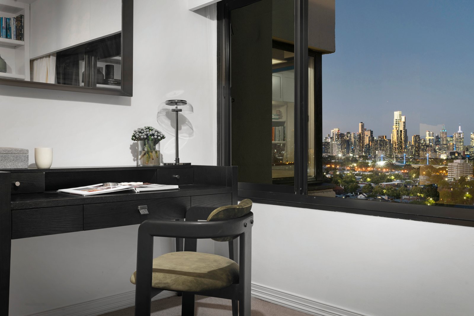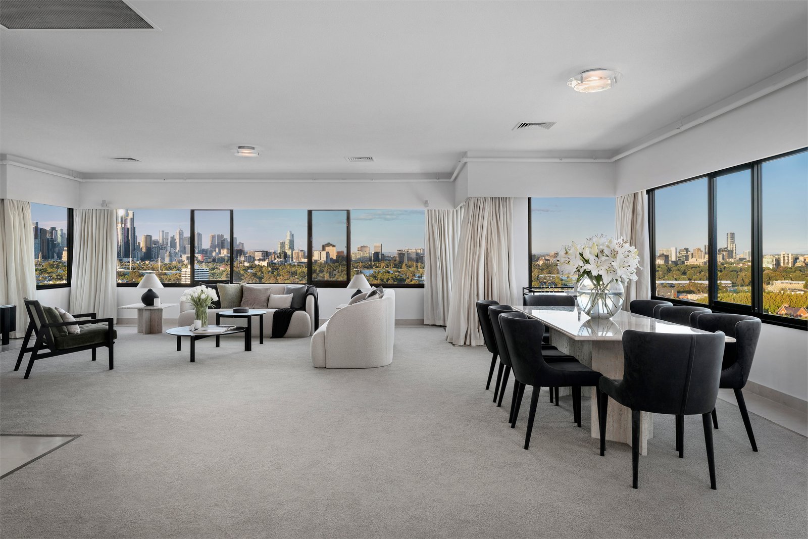 Set against a captivating canvas of the city skyline and Port Phillip Bay, it stands out as an authentic jewel, boasting two thoughtfully designed wings dedicated to relaxation and entertainment. The open-plan living and dining areas redefine everyday living, showcasing ample space and adaptability, centring around a sophisticated granite-bench kitchen with premium Smeg appliances and walk-in pantry.