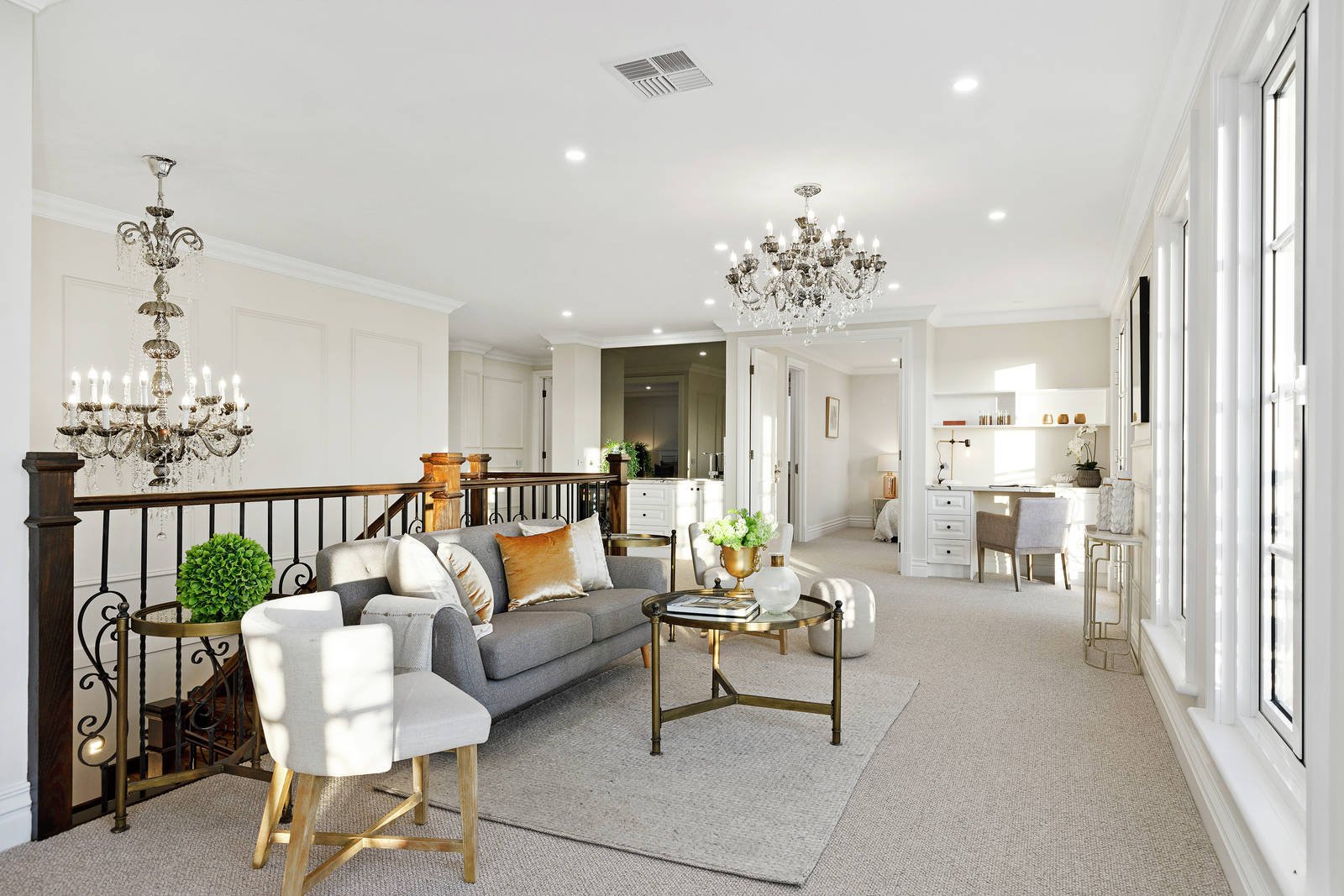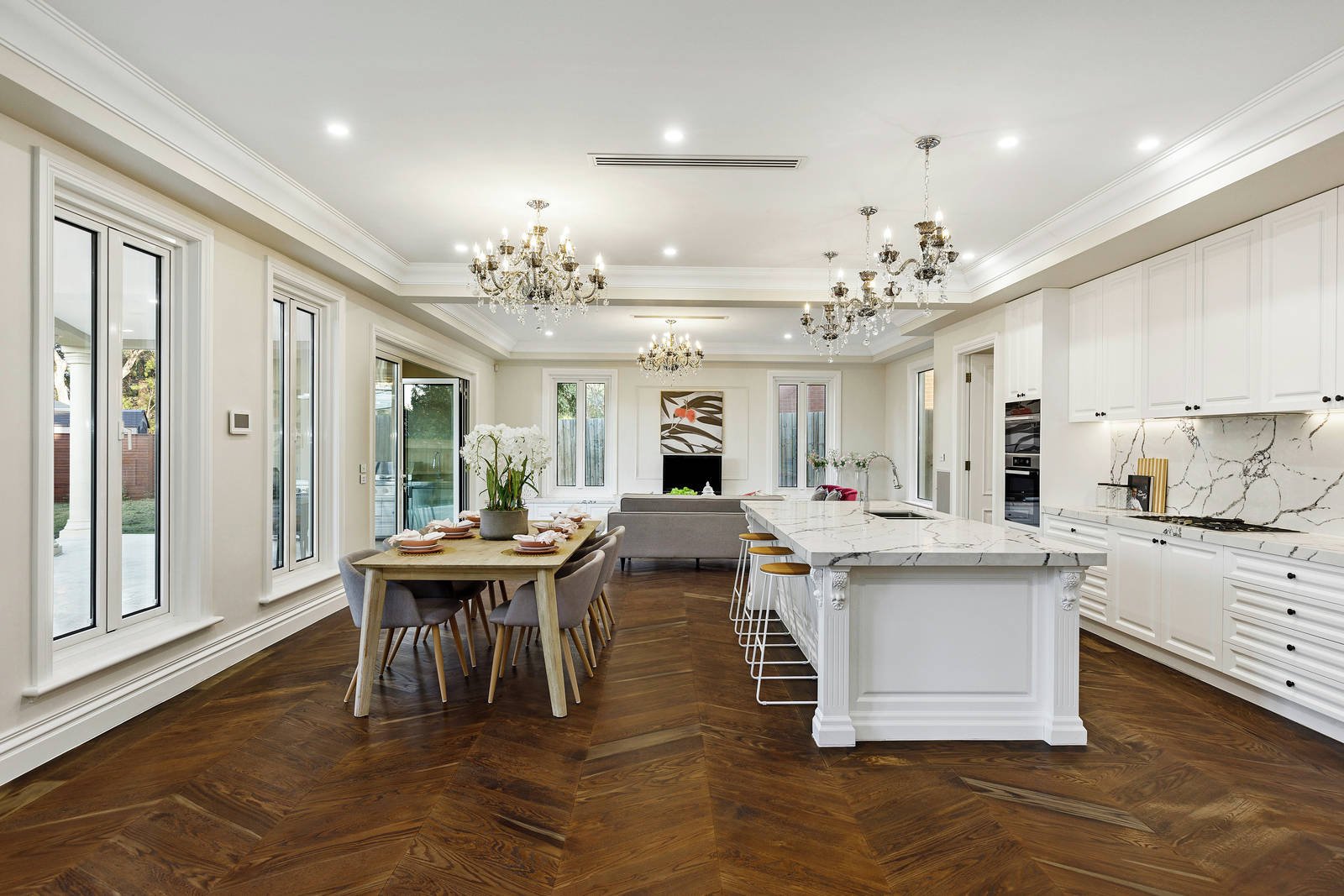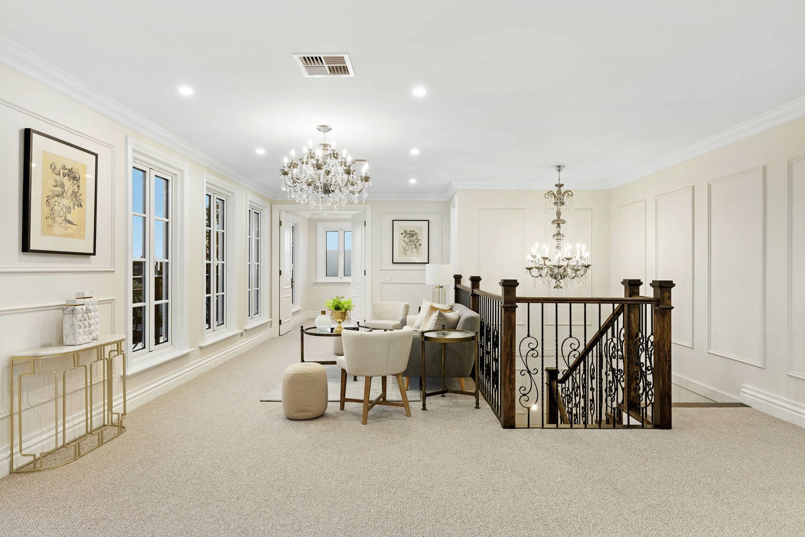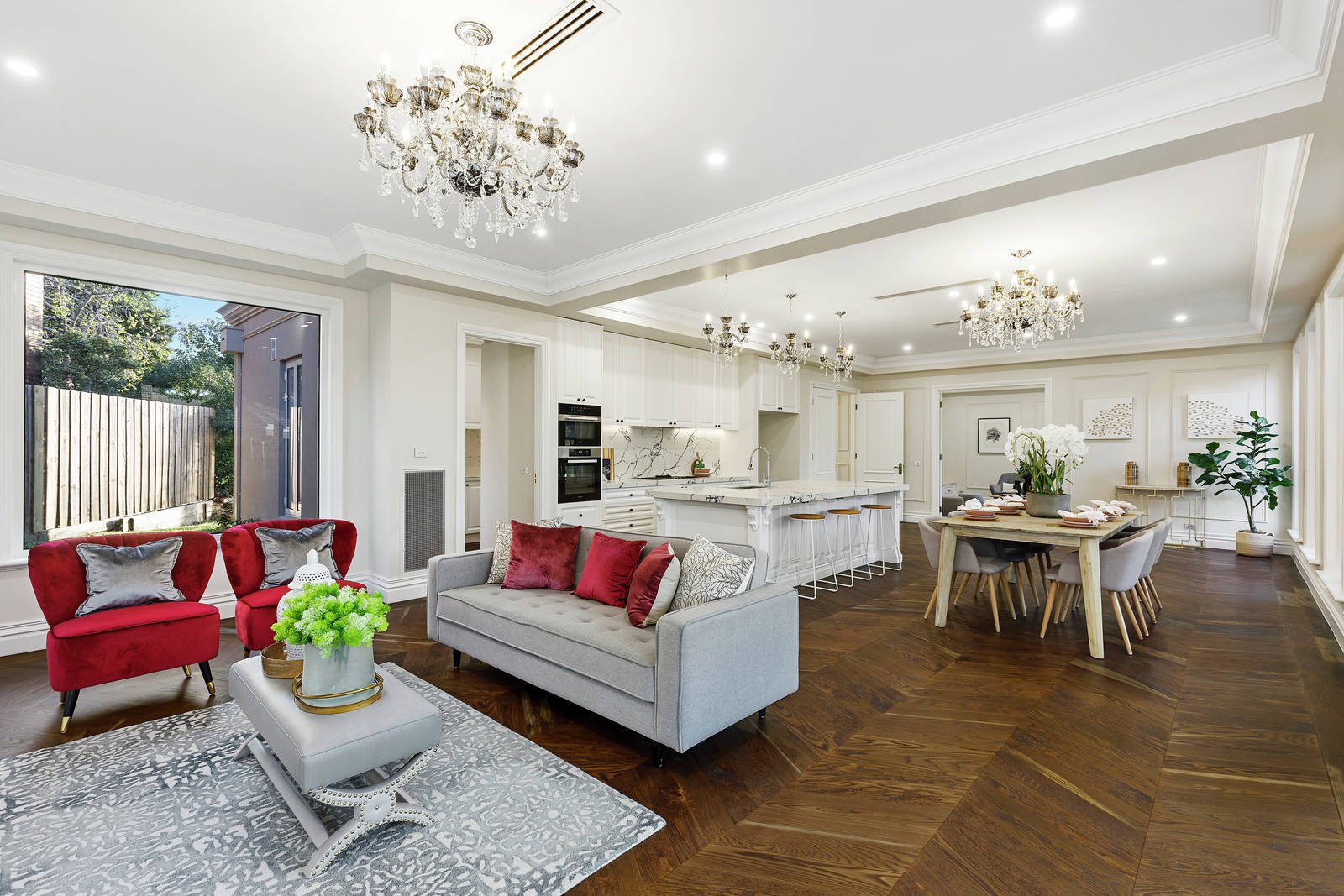Richly hued oak parquetry floors and high recessed ceilings create an impactful first impression in the welcoming reception hall that flows through to an exquisite sitting room warmed by a gas fire and a fabulous media room. Spectacular in scale, the open plan living and dining area includes a state of the art premium kitchen appointed with stone benches, Miele appliances and a full second kitchen or butler's pantry. Bi-fold doors connect the living area to a large covered al fresco entertaining terrace with outdoor BBQ kitchen and private northeast garden. A downstairs bedroom with walk in robe and en suite is ideal for guests while upstairs there are three additional bedrooms with en suites and walk in robes, a large retreat with kitchenette and a palatial main bedroom with sumptuous en suite and deluxe dressing room.