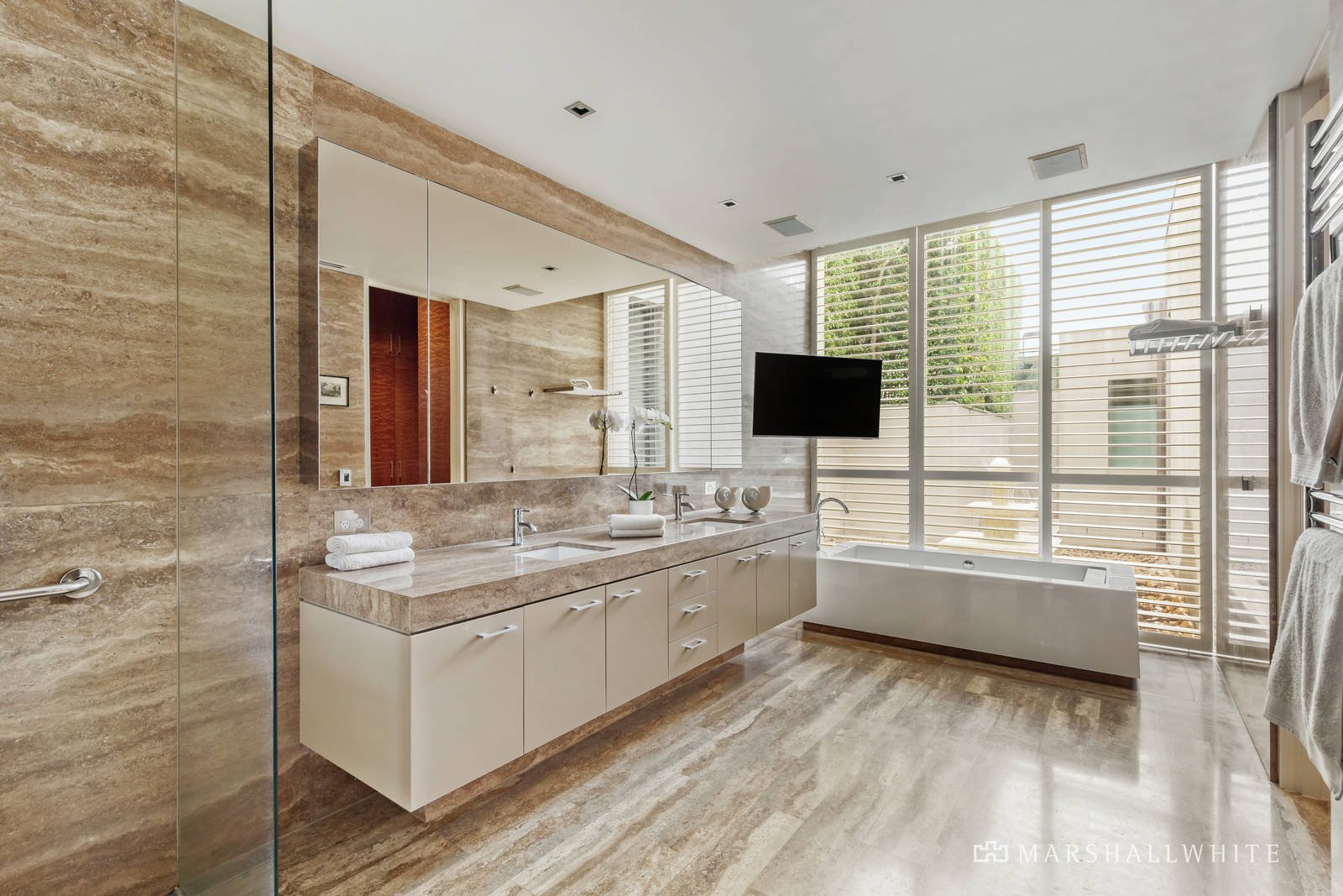 As expected in a home of this caliber, the additional offerings are extensive, including a six-car underground garage with elevator access to the main home and a wine cellar, as well as hydronic floor heating, three open fireplaces, a Generec gas generator for back-up power and fully monitored security. Land size: 1325sqm approx.