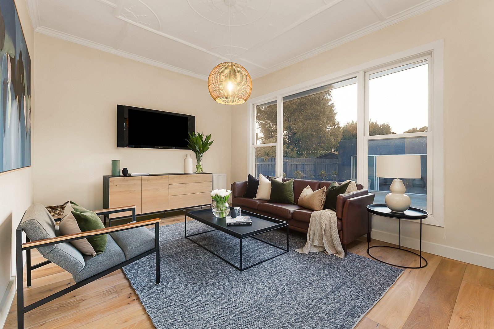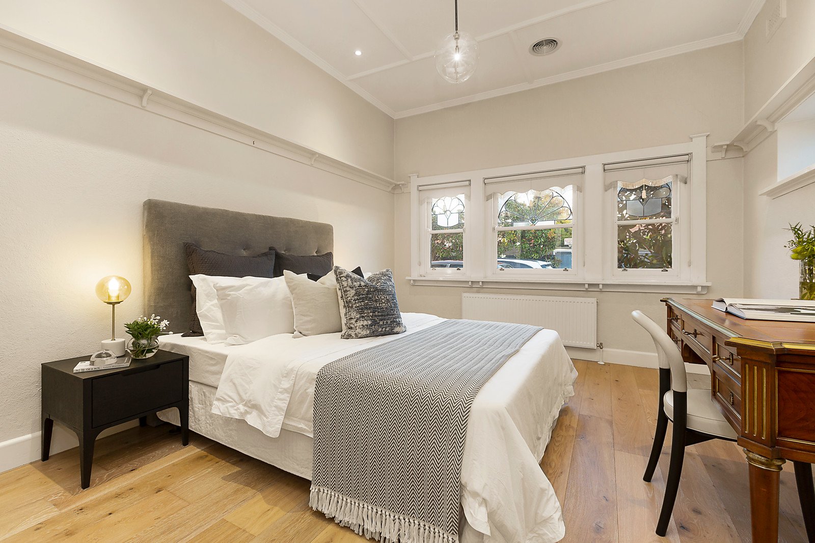 Wide oak floors add a contemporary flavor to the ornate ceilings and leadlight windows that define the central hall and elegant dining room with gas fire. Two gorgeous bedrooms with period features and a third double bedroom are complemented by a stunning designer bathroom with double shower and a second stylish bathroom with laundry and separate powder-room. The gourmet kitchen appointed with granite benches and an Ilve oven and a light-filled living room open to a large deck overlooking the deep private northwest garden with a substantial freestanding studio/home office and store-room.