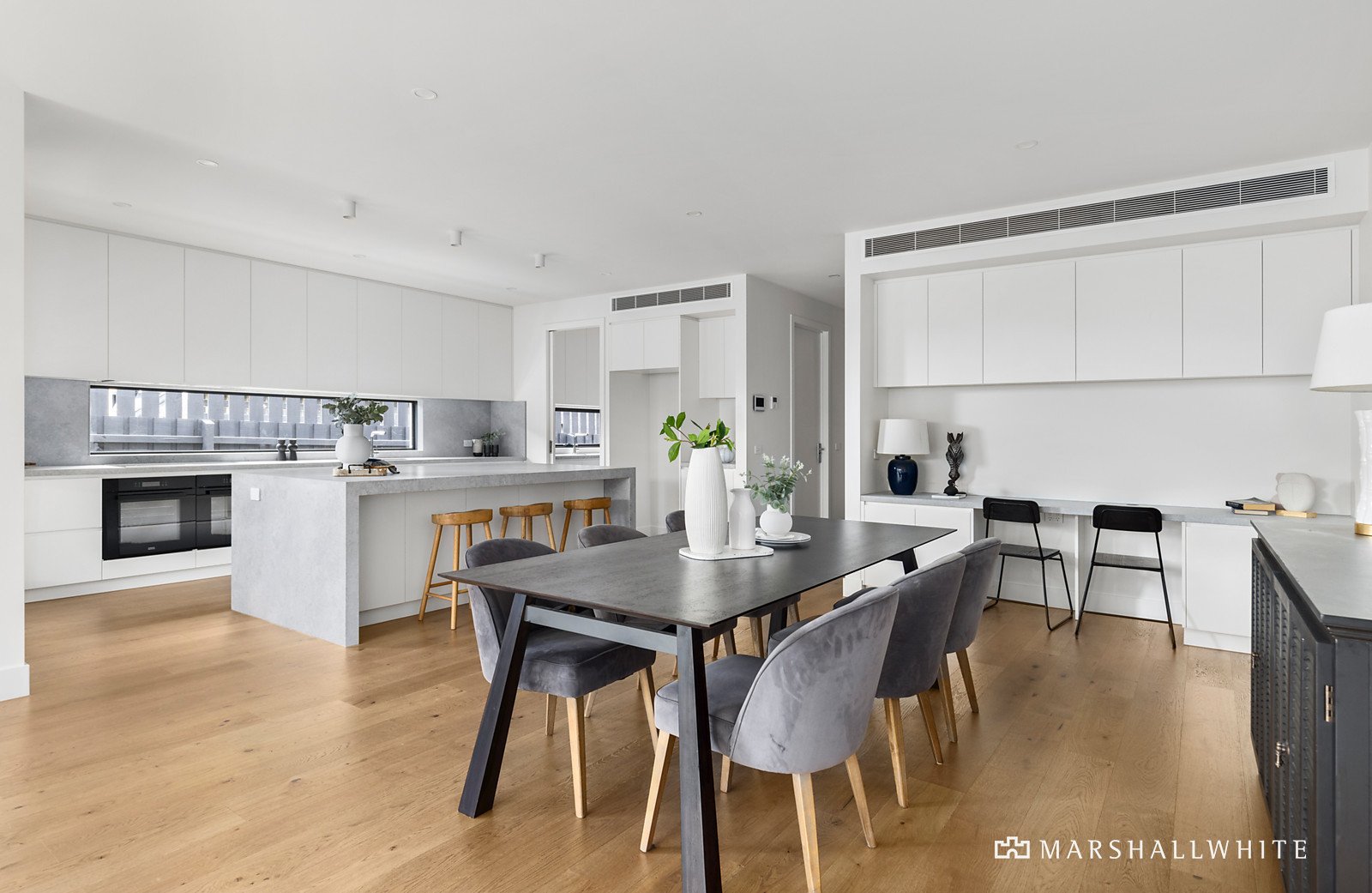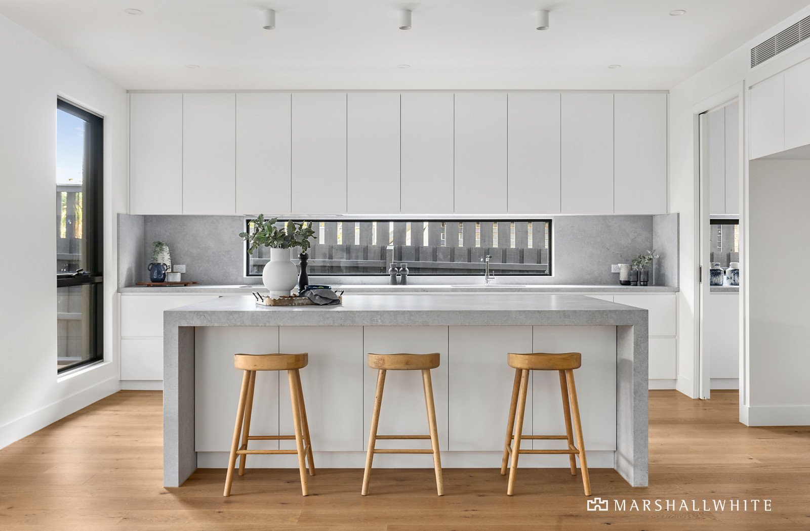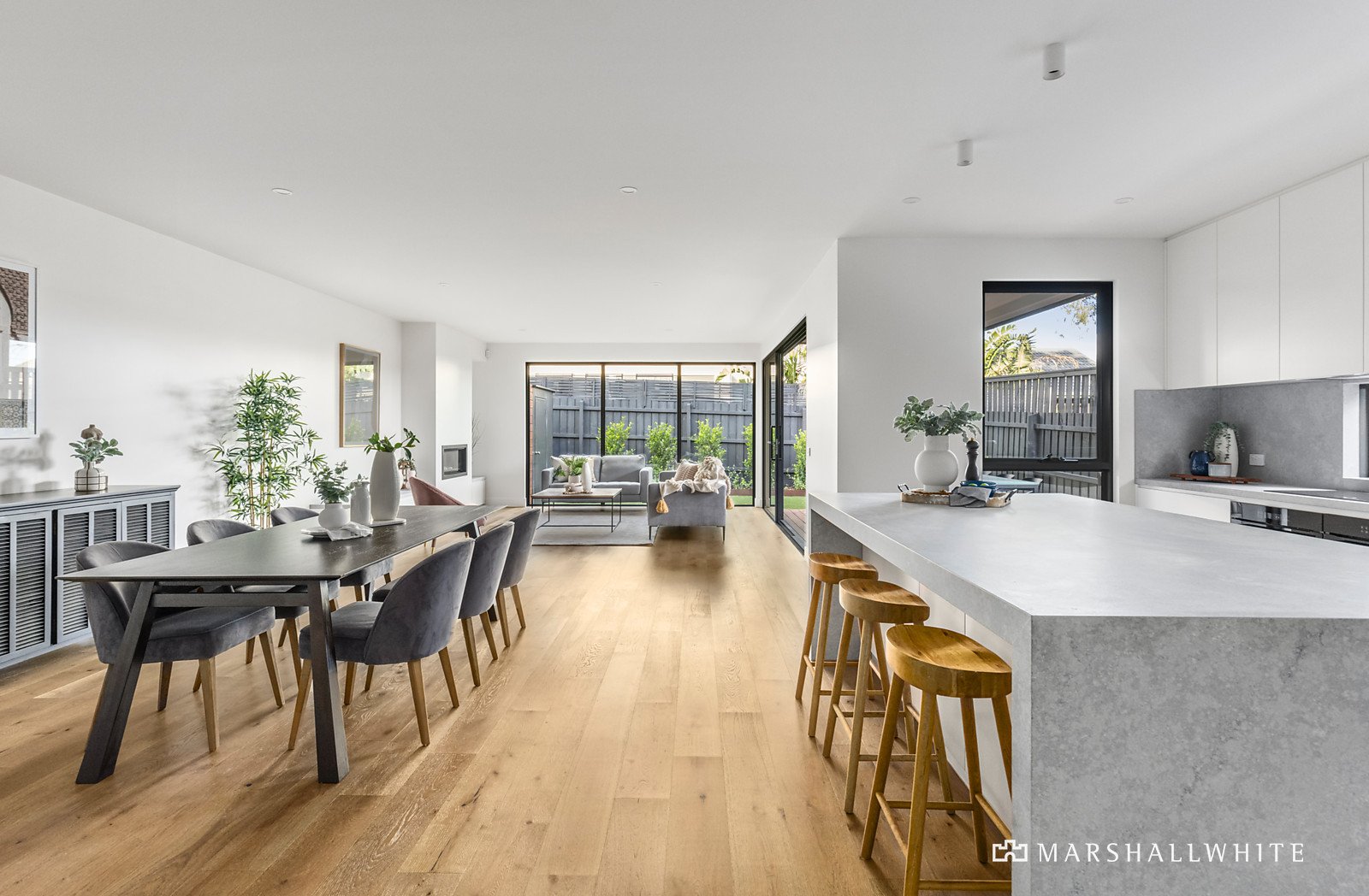 Behind an architecturally bold exterior, the inviting interior spaces are underscored by high ceilings, wide oak floors, and bespoke joinery. Impressive in scale, the light-filled open plan living and dining room with a gas pebble fire and fitted study nook connects through stacking glass sliders to a large undercover deck, ideal for all weather outdoor entertaining overlooking the private landscaped northeast garden. A chef's delight, the premium kitchen is appointed with dual Franke ovens, stone benches, and a butler's pantry. A versatile guest bedroom or alternate main bedroom on the ground level with designer en suite and walk in robe is matched upstairs by a palatial main bedroom with deluxe dressing room and opulent en suite, two additional robed bedrooms, a stylish third bathroom and children's retreat.