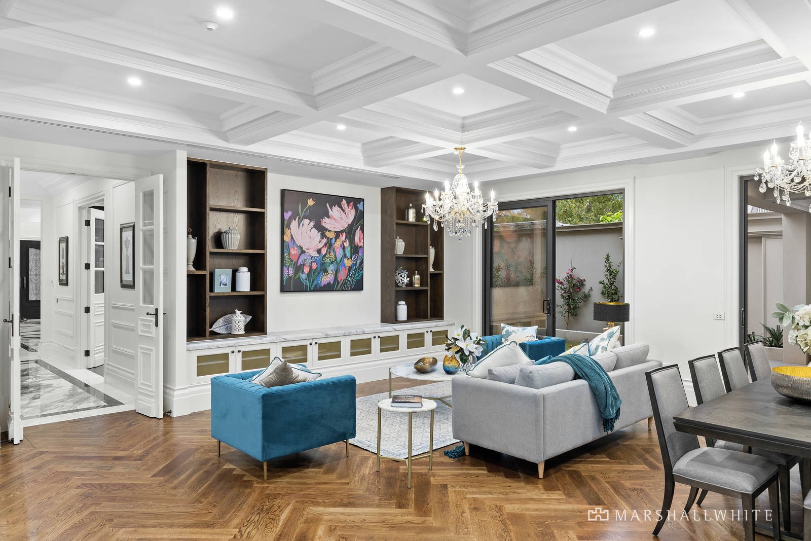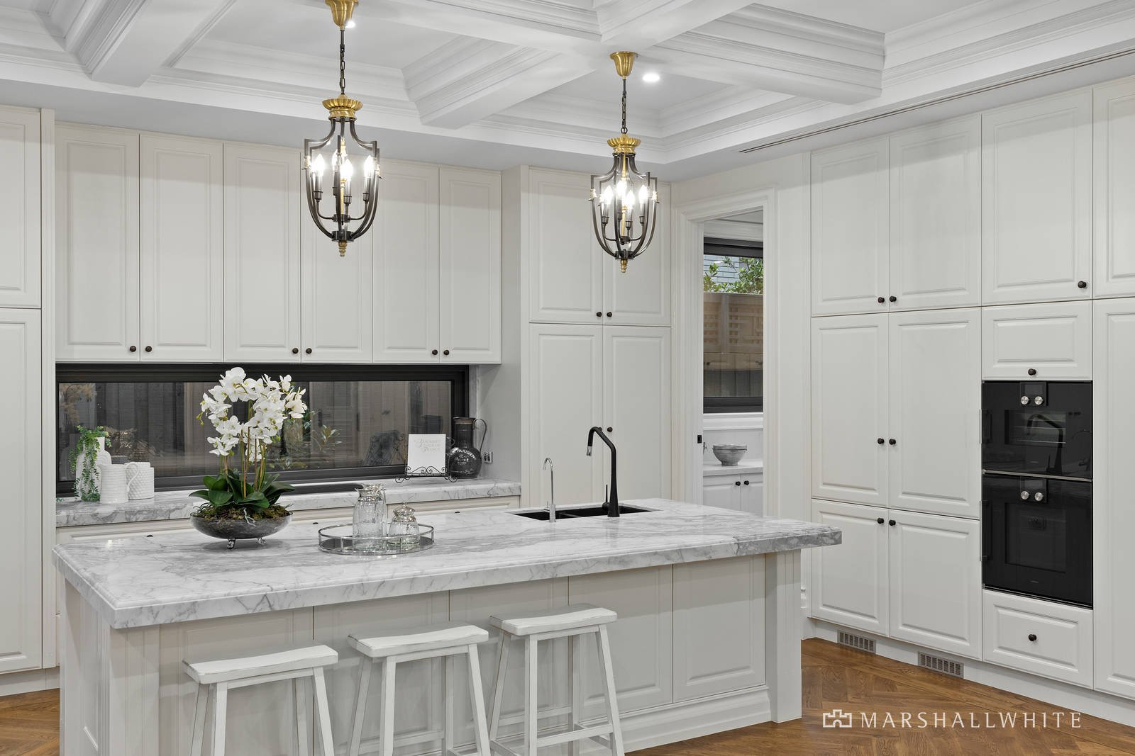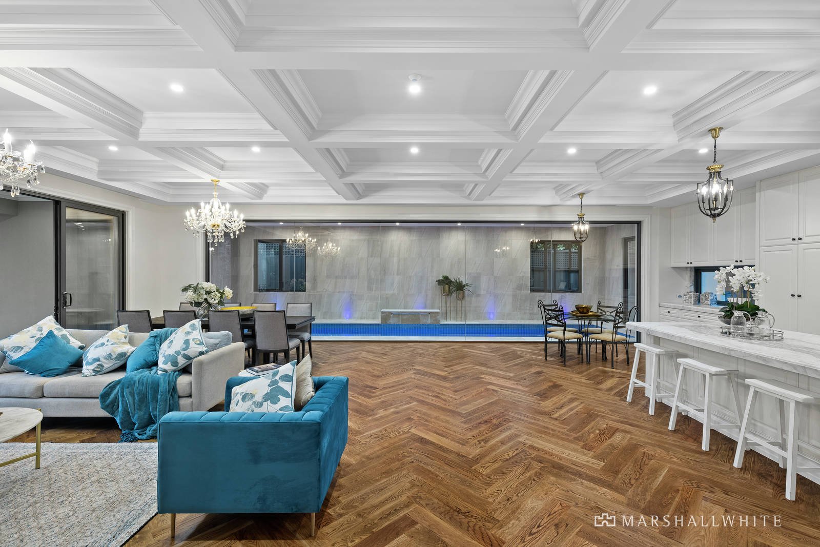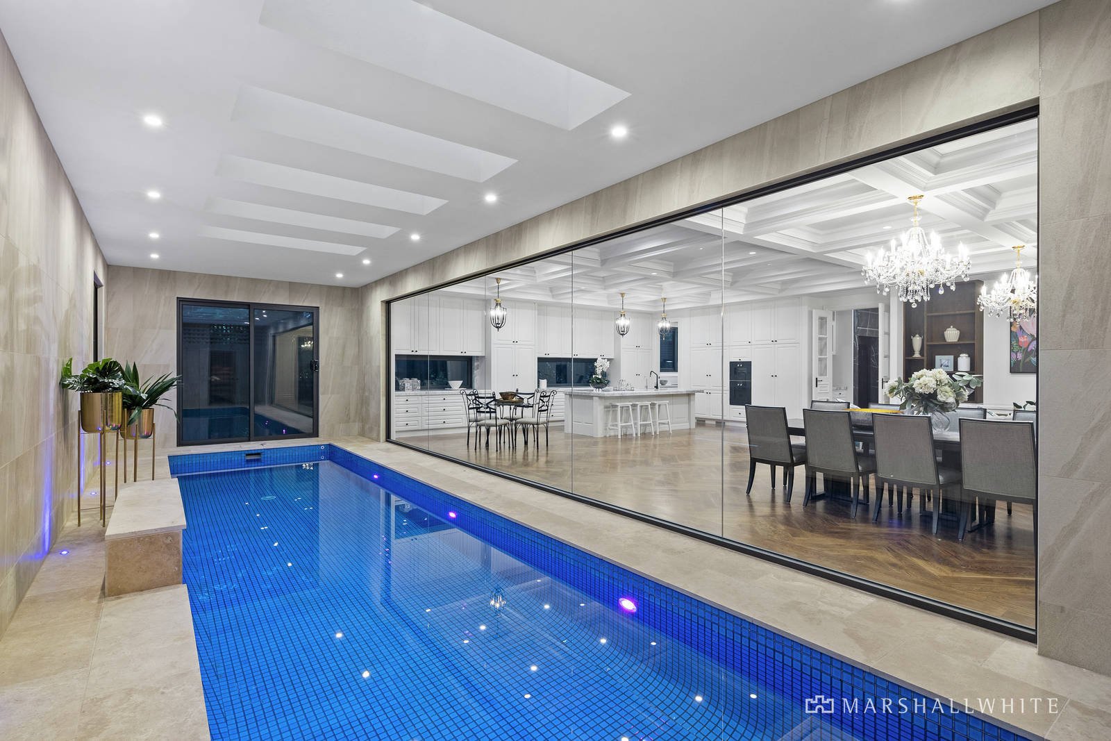 Entered under a double-height entrance void, the home's visual impact is instantly engaging as it flows past an exquisite gas log fire-heated lounge and dining or music room, to an extraordinary open-plan rear. Looking out upon the home's indoor swimming pool and poolside outdoor entertaining all with an outdoor kitchen, the open-plan kitchen / dining / living is flawlessly appointed with a suite of Gaggenau appliances and an integrated Liebherr refrigerator, as well as a Butler's Pantry which caters perfectly to the proudest of entertainers and to gourmet cooks.