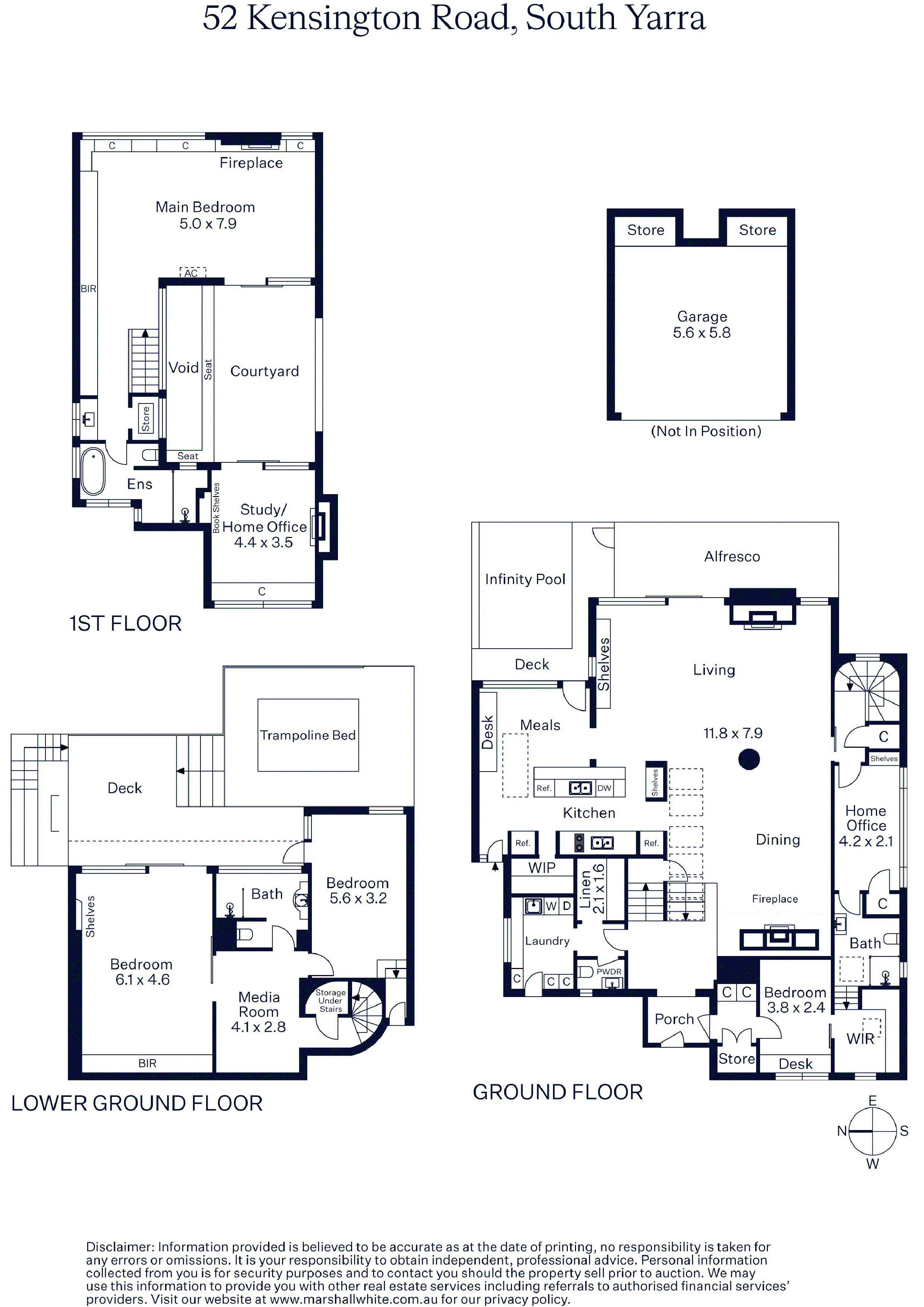 Brilliantly zoned accommodation comprising 4 bedrooms, two versatile studies, a retreat/media room and three bathrooms culminates in the majestic main suite on the top-level opening to its own private courtyard. The palatial open plan living and dining room served by a chef’s gourmet kitchen featuring an Aga oven allows for both relaxed family living and entertaining on a grand scale. The living spaces extend out to numerous decks and terraces with a stunning infinity pool, outdoor fireplace and inbuilt trampoline, all enjoying the wonderful views over the park to the Yarra River and beyond.