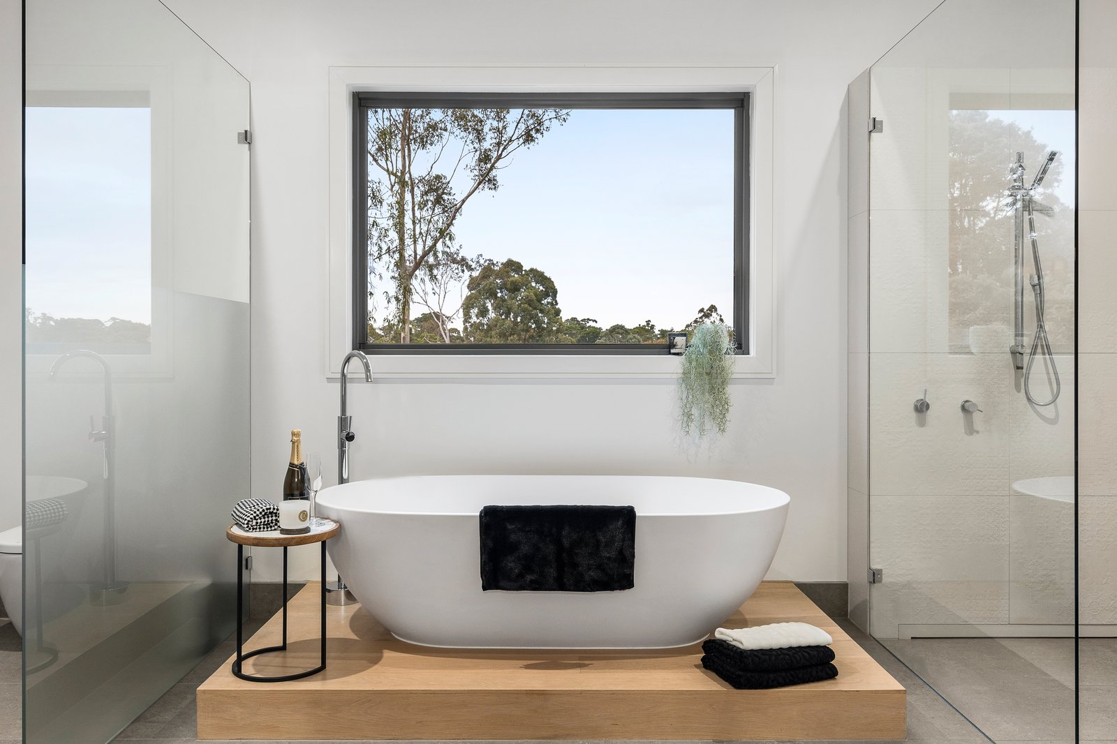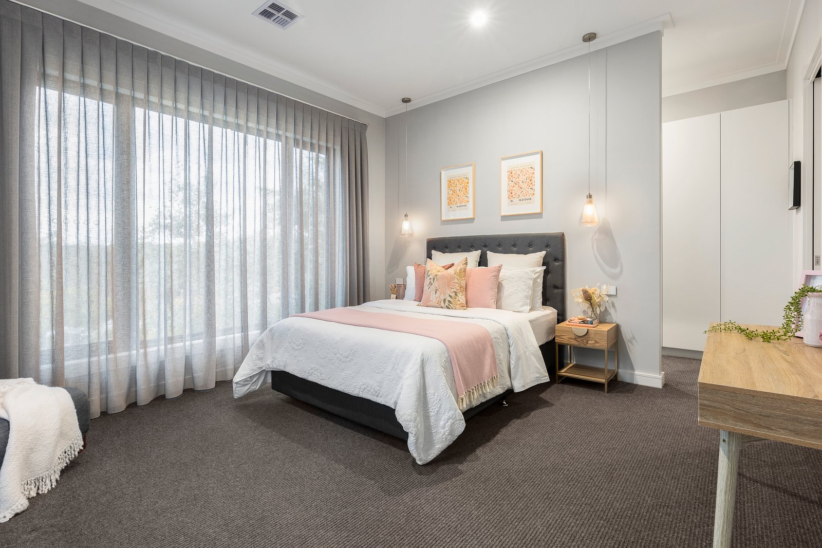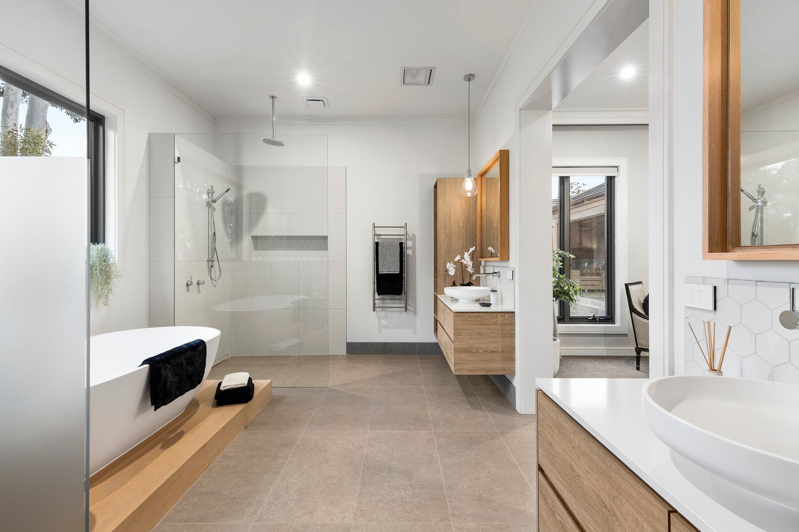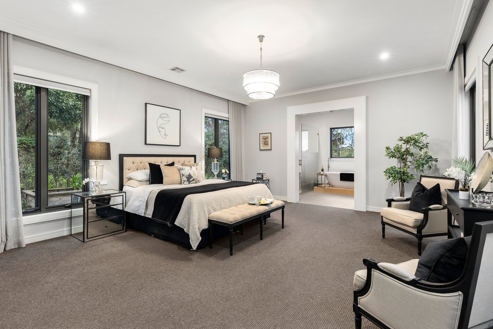 The main bedroom suite is situated in its own wing well apart from the other bedrooms, offering peace and quiet. It features a dressing room and a luxurious ensuite complete with a rain shower, dual vanities, and breathtaking views from the elevated freestanding bath. Each of the other bedrooms also includes walk-in robes (WIRs) and access to spacious ensuites.
