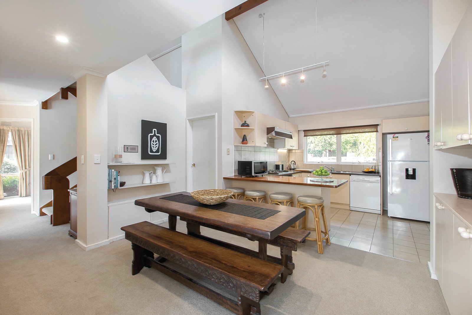 Northern light streams through the expansive living room that opens out to a private north-facing courtyard. An inviting formal dining room and casual dining beneath a soaring void are capably served by a well-appointed kitchen. The main bedroom with en-suite and built in robe is downstairs away from two additional bedrooms with built in robes and a second bathroom upstairs.