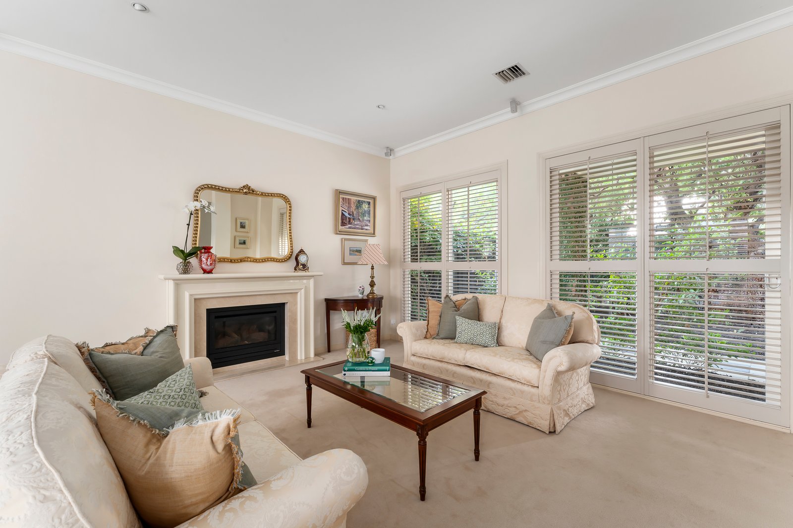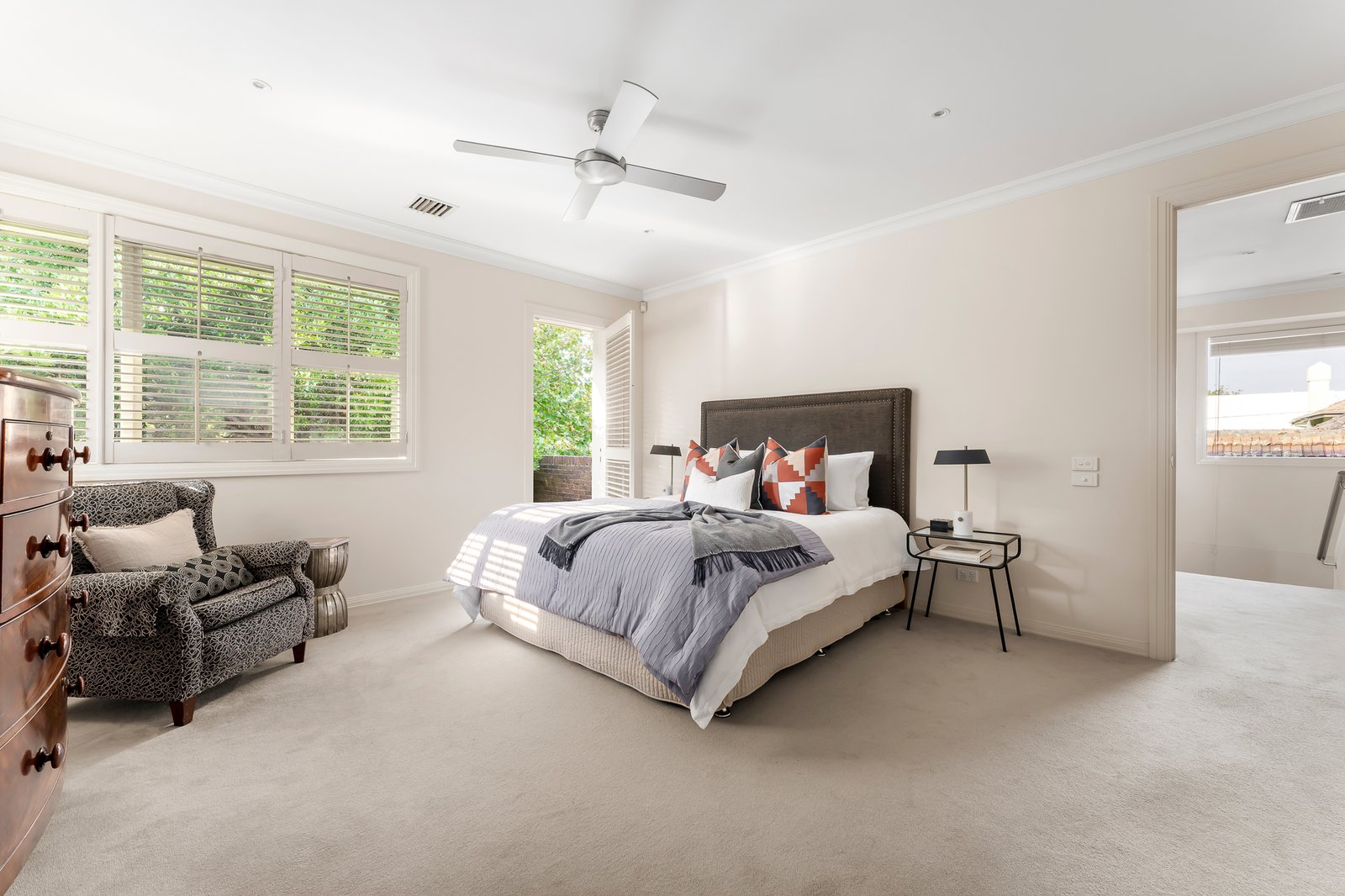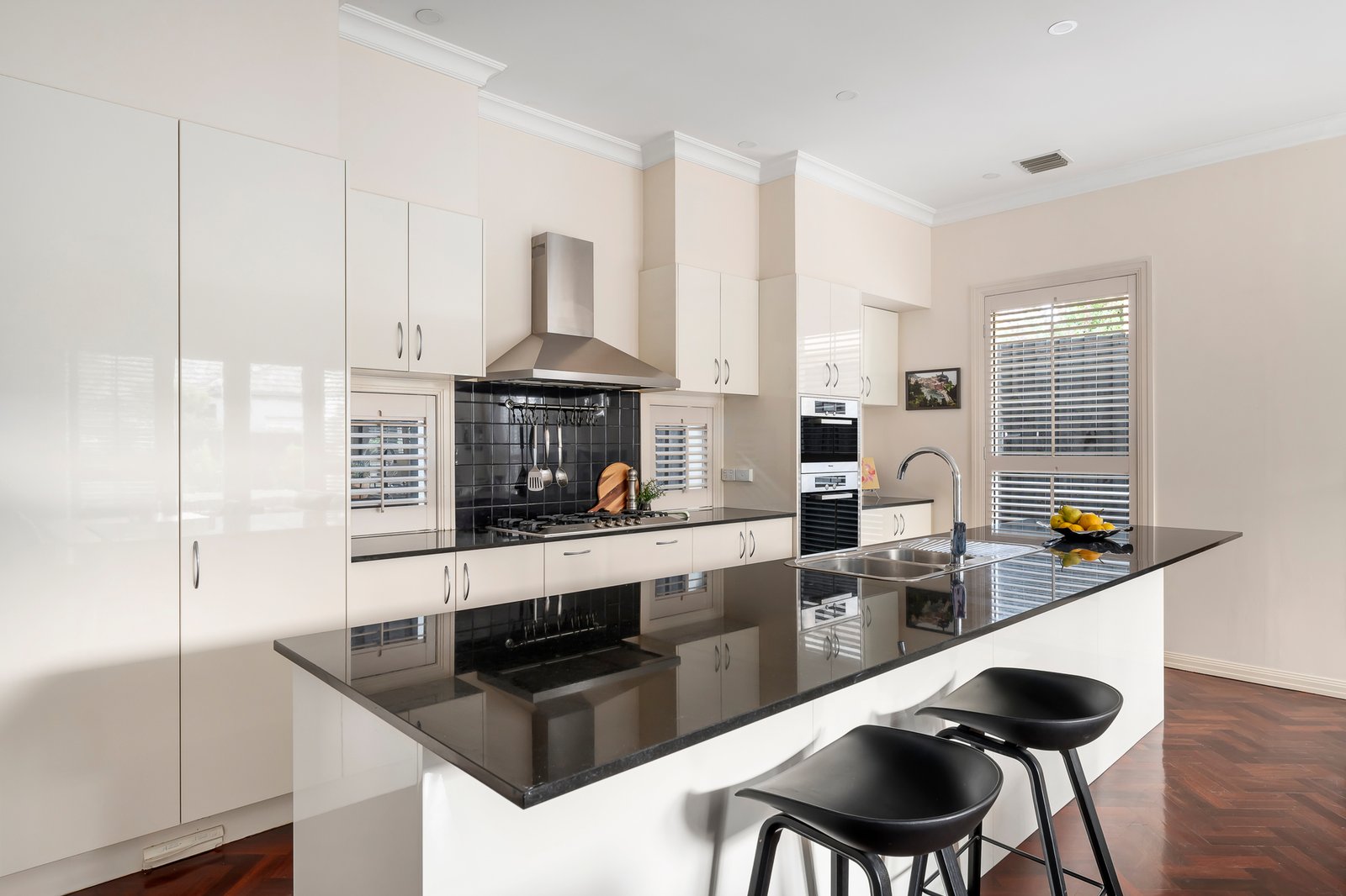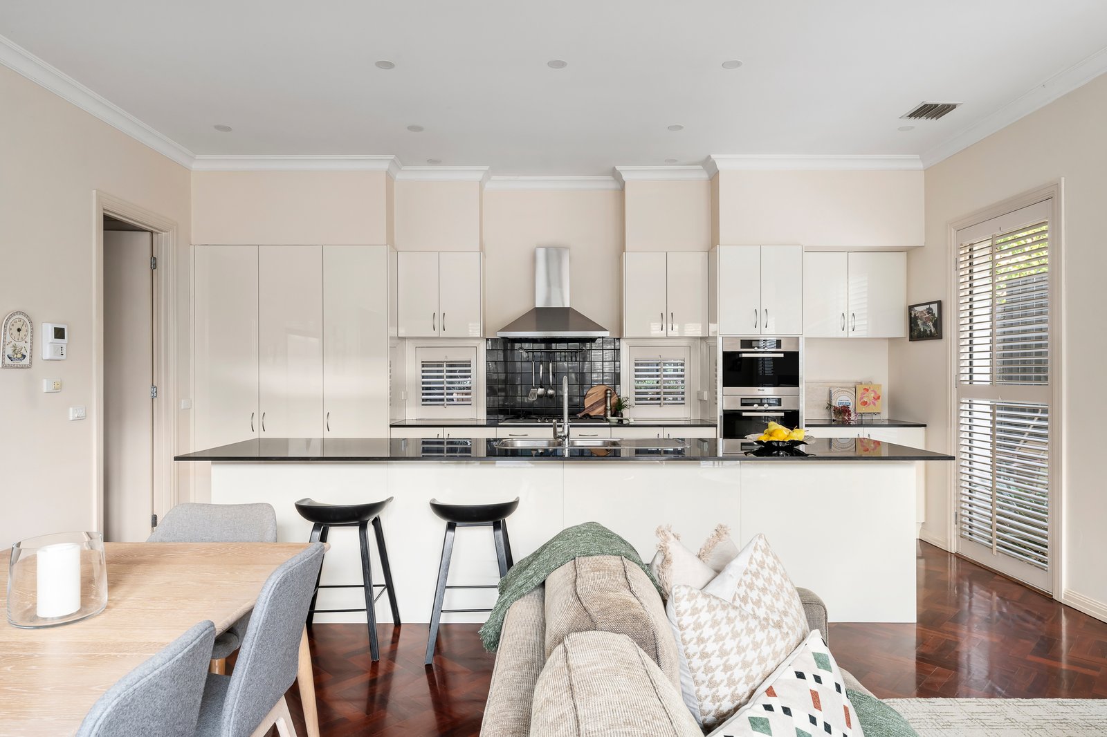 Securely set behind automated gates and with intercom entry, the landscaped front gardens feature a lovely decades-old evergreen Arbutus tree. Inside, the home’s light-filled spaces are defined by soaring ceilings, Jarrah parquetry flooring and plantation shutters. The lower level layout comprises an entry hall, formal living room with gas log fire heater, formal dining room, and the open-plan family living area, also with a gas log fire, and seamless connectivity to a private, paved garden courtyard with lushly planted borders. The gourmet kitchen has stone benchtops, a central island, and Miele appliances including a gas cooktop, steamer and convection ovens and dishwasher. Designed for intuitive family living, the adjoining full-sized laundry (with laundry chute from upstairs), incorporates the internal access door from the double remote-operated garage, and can be utilized as a mud room or also as a butler’s pantry when entertaining. Upstairs, the home’s generous proportions are further magnified by the abundance of northerly light. The lavishly sized main bedroom suite incorporates a private balcony, a walk-in robe and luxe ensuite with spa bath and double walk-in shower. The second bedroom has access to an alfresco terrace with charming treetop and rooftop views across the neighbouring heritage belt, while the third bedroom also has lovely treetop outlooks, and the light-filled study, which has been stylishly walled with plantation shutters, could also serve as a fourth bedroom. There is also the main bathroom with built-in tub and walk-in shower on the upper level. Additional features include gas-ducted heating and central cooling, sound system, and plenty of storage.