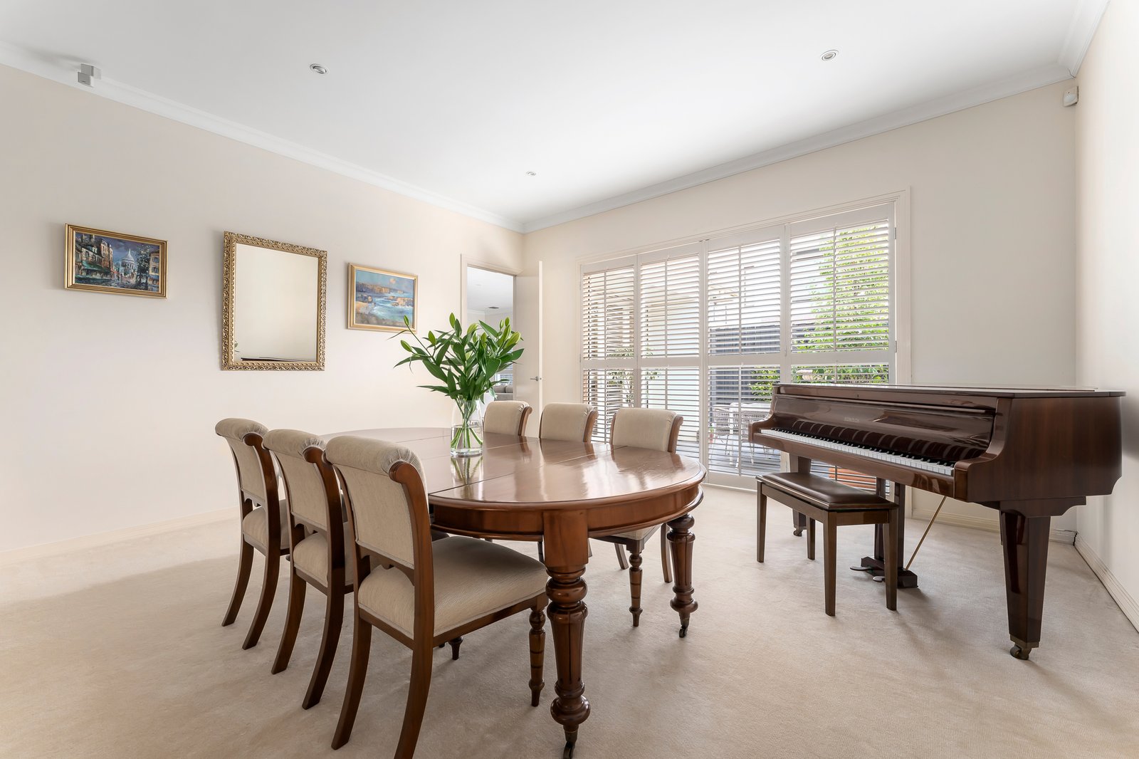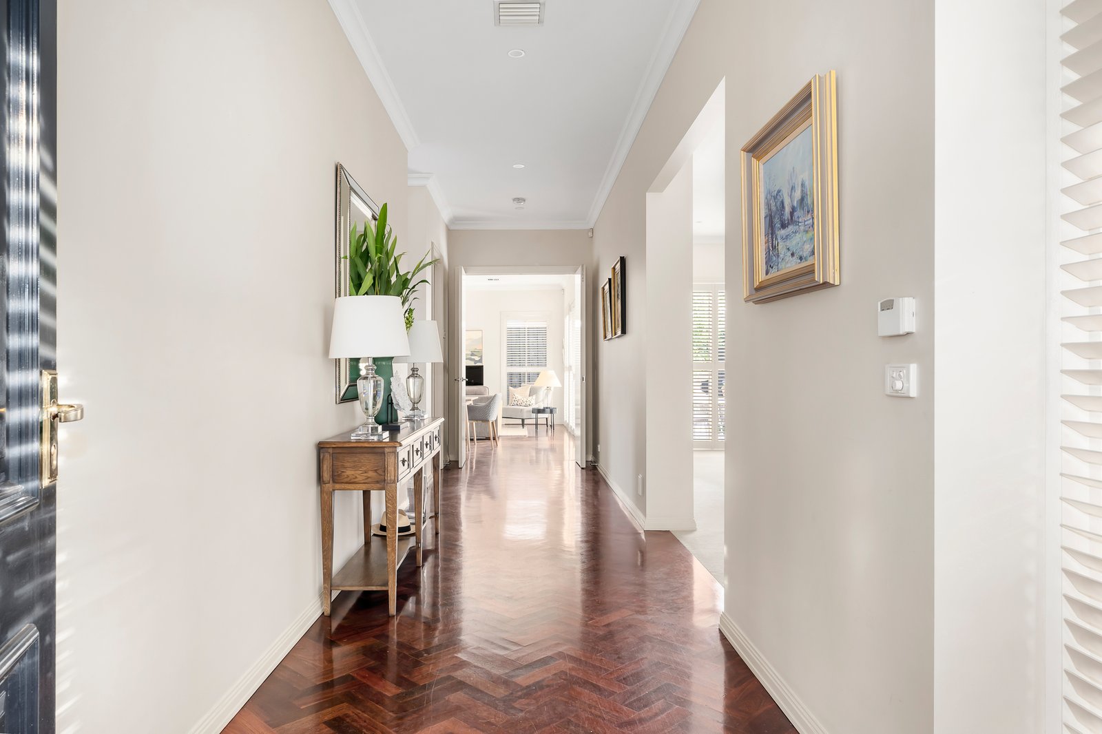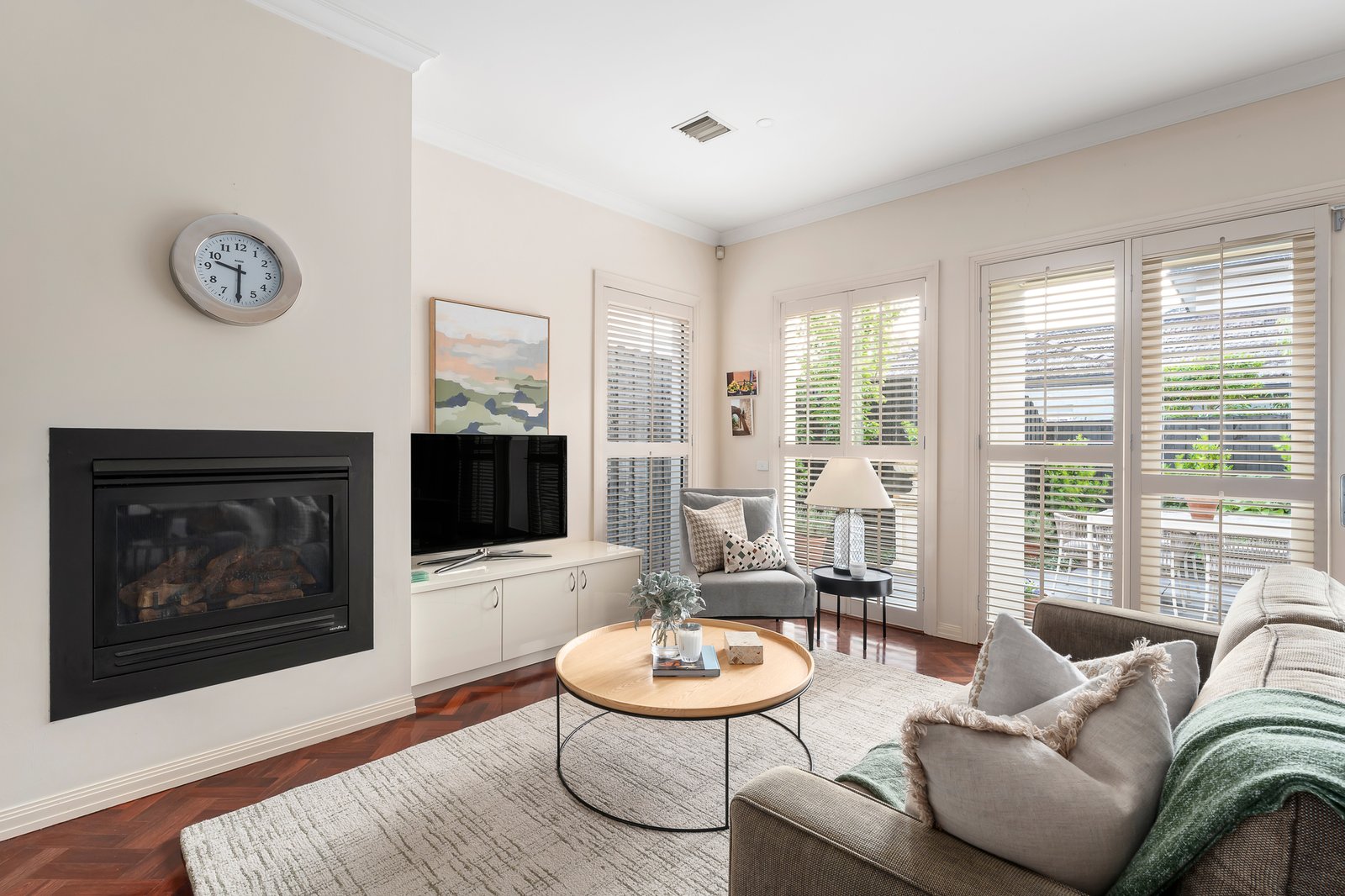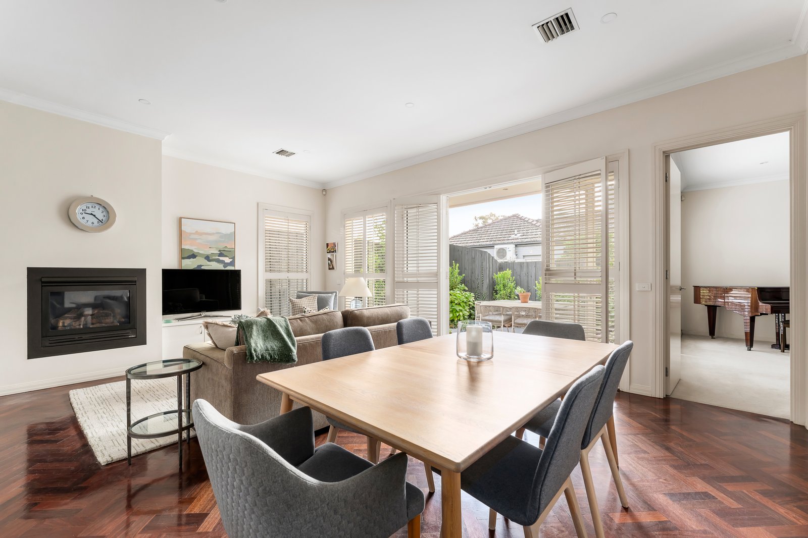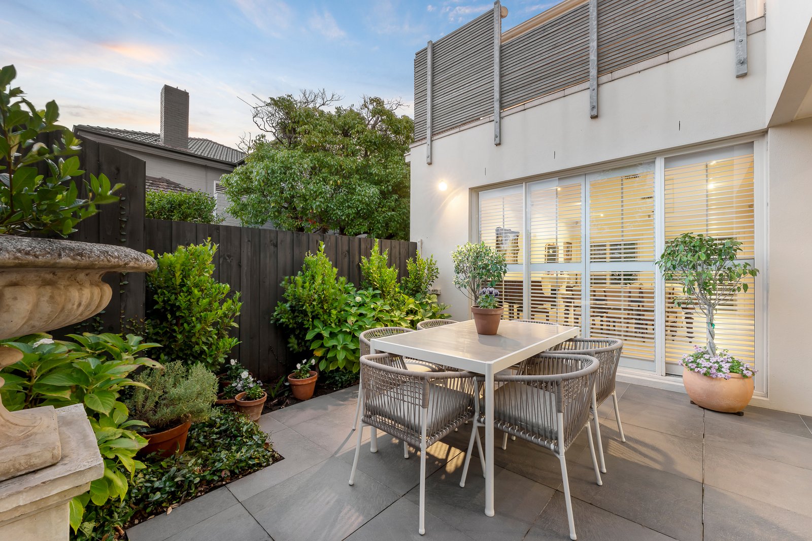Securely set behind automated gates and with intercom entry, the landscaped front gardens feature a lovely decades-old evergreen Arbutus tree. Inside, the home’s light-filled spaces are defined by soaring ceilings, Jarrah parquetry flooring and plantation shutters. The lower level layout comprises an entry hall, formal living room with gas log fire heater, formal dining room, and the open-plan family living area, also with a gas log fire, and seamless connectivity to a private, paved garden courtyard with lushly planted borders. The gourmet kitchen has stone benchtops, a central island, and Miele appliances including a gas cooktop, steamer and convection ovens and dishwasher. Designed for intuitive family living, the adjoining full-sized laundry (with laundry chute from upstairs), incorporates the internal access door from the double remote-operated garage, and can be utilized as a mud room or also as a butler’s pantry when entertaining. Upstairs, the home’s generous proportions are further magnified by the abundance of northerly light. The lavishly sized main bedroom suite incorporates a private balcony, a walk-in robe and luxe ensuite with spa bath and double walk-in shower. The second bedroom has access to an alfresco terrace with charming treetop and rooftop views across the neighbouring heritage belt, while the third bedroom also has lovely treetop outlooks, and the light-filled study, which has been stylishly walled with plantation shutters, could also serve as a fourth bedroom. There is also the main bathroom with built-in tub and walk-in shower on the upper level. Additional features include gas-ducted heating and central cooling, sound system, and plenty of storage.
