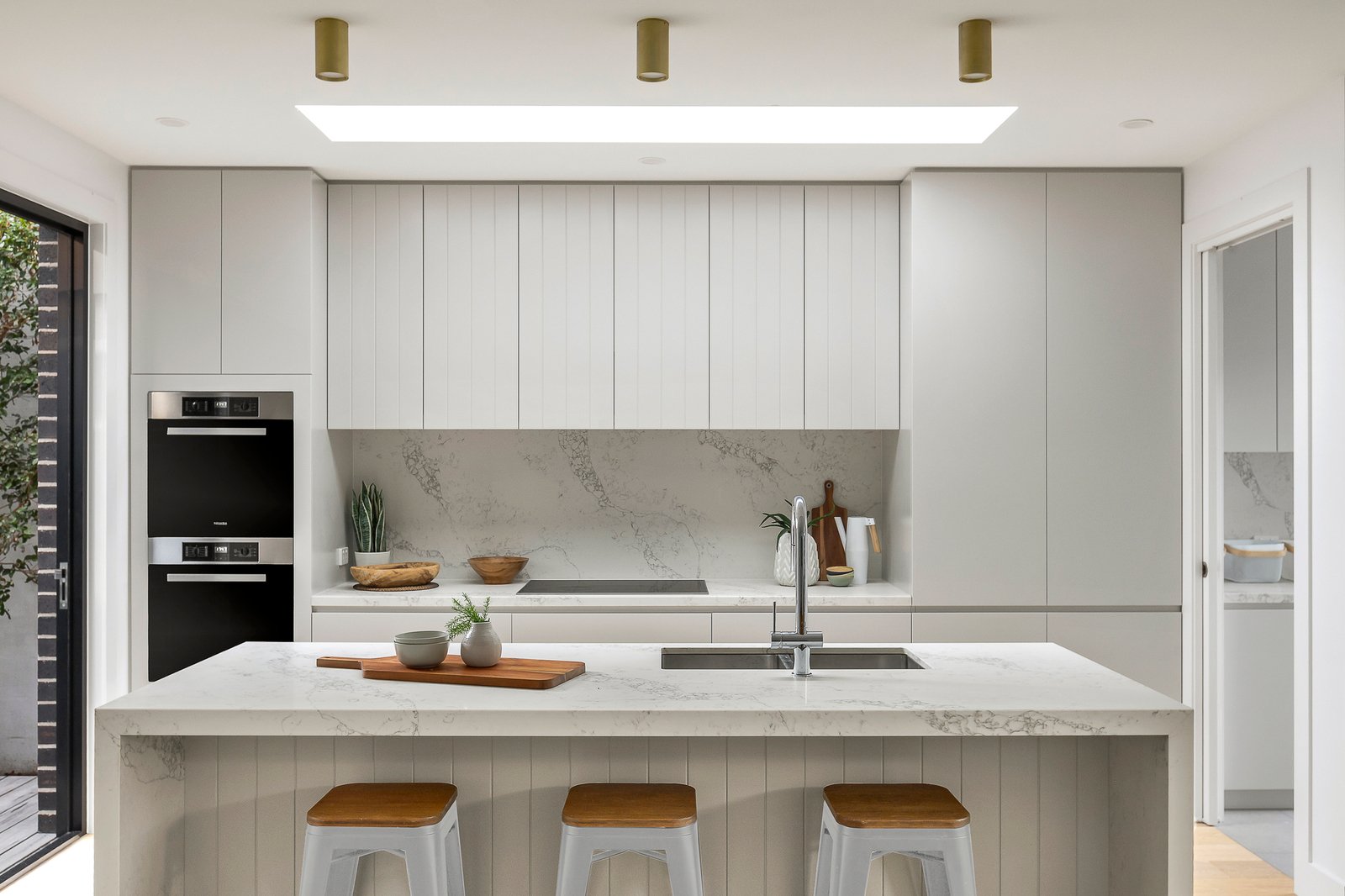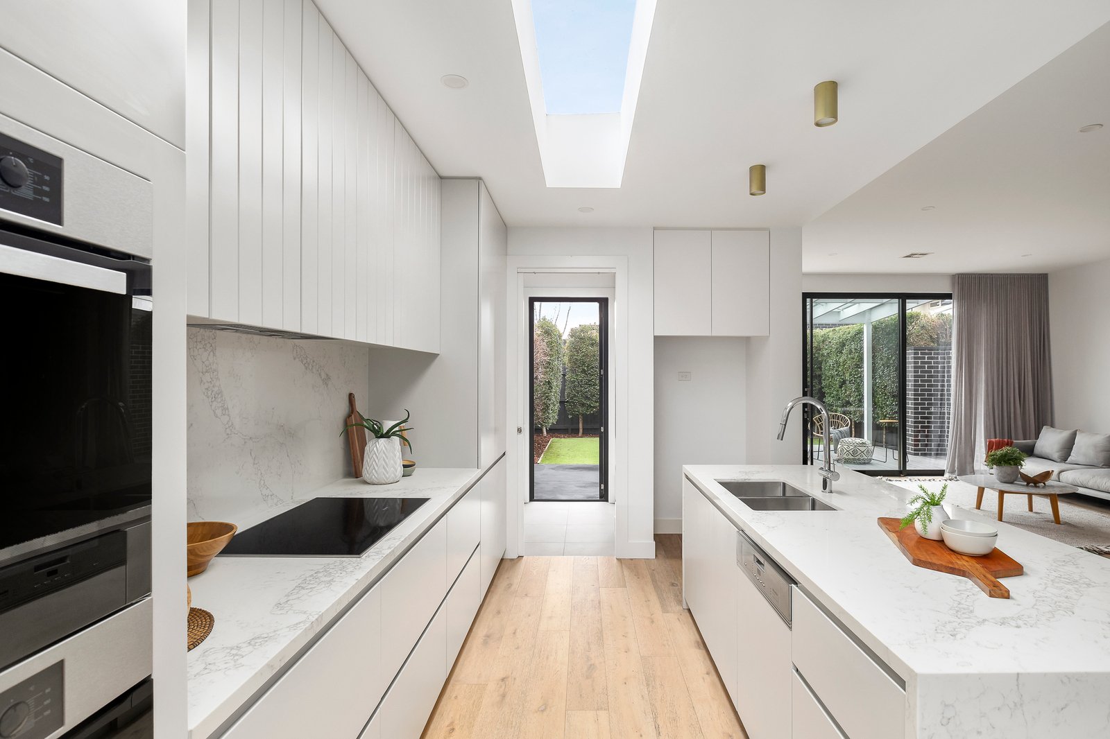 Beneath high ceilings, the entrance hall with study area and oak floors underfoot flows through to the expansive open plan living and dining room with custom cabinetry and a sublime gourmet kitchen appointed with stone benches, Miele appliances and Sussex tapware throughout. Stacking glass sliders open to the private easy care landscaped garden with a large undercover deck perfect for year-round al fresco dining. The generous main bedroom with a decked courtyard, walk in robe and designer en suite is serenely positioned on the ground level while an upstairs children’s zone comprises three additional bedrooms with built in robes, a stylish bathroom with bath and separate toilet and a spacious sun-drenched retreat.