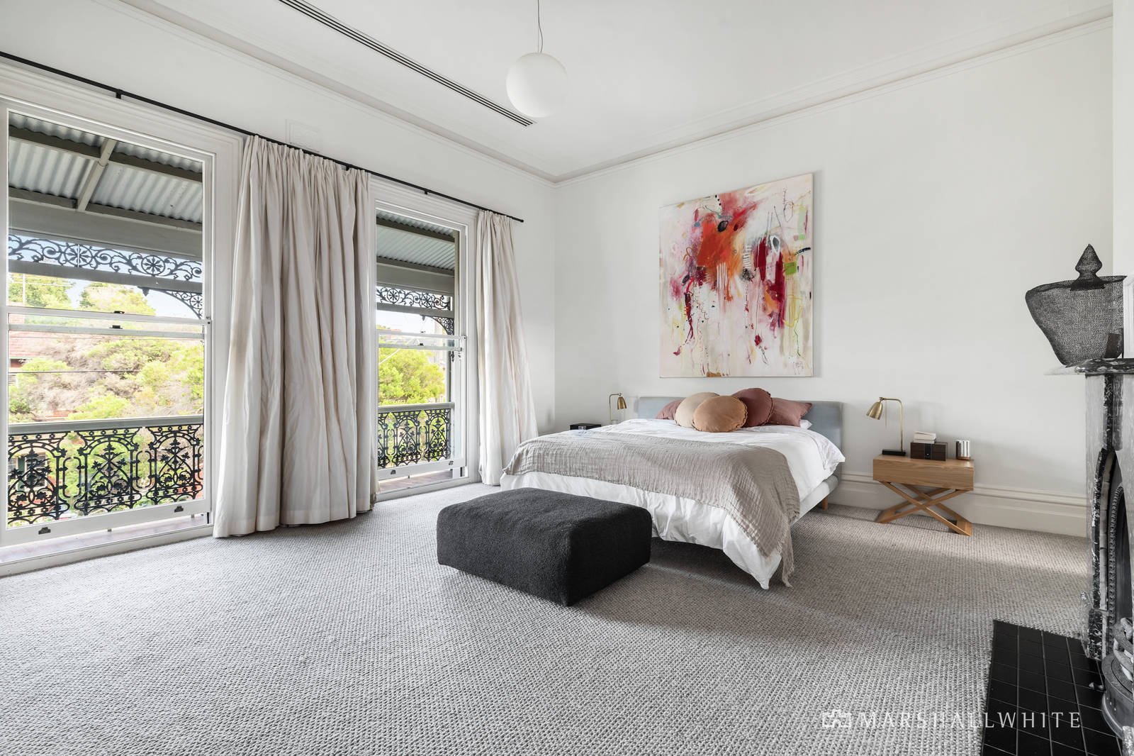 The imposing arched hall with dark timber floors and soaring ornate ceiling creates a sense of grandeur that is reflected in the sumptuous sitting room with its marble fireplace and bespoke joinery. Bathed in northern light through black steel framed doors and windows, the expansive living and dining room is served by a superb gourmet kitchen featuring Corian benches, Siemens appliances and a butler's pantry/laundry. The black steel framed doors extend the living out to the north-facing landscaped garden with a sensational vine covered entertaining terrace, BBQ, open fire and concealed secure off street parking beyond. The palatial main bedroom with marble gas fire, full width balcony, generous robes and a lavish designer en suite is set apart from two additional bedrooms with built in robes, a stylish bathroom and box room.