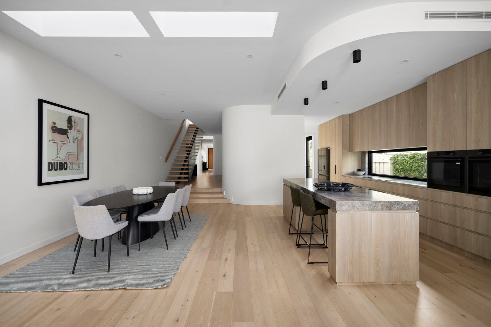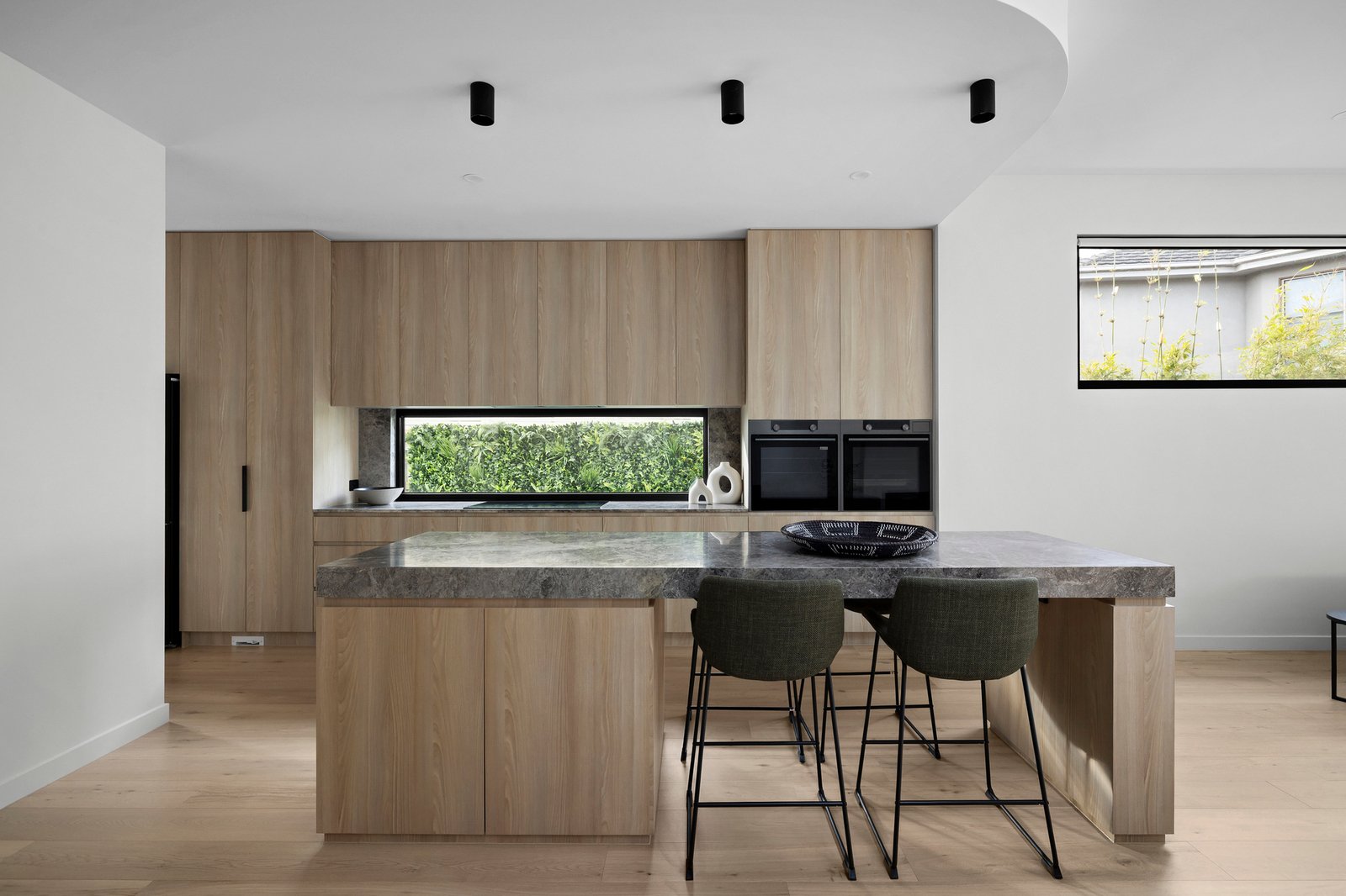 Positioned in the heart of Mornington, mere steps from Main Street and the beach, this architect designed home achieves the perfect balance of sophistication and liveability, ideally configured for multi generational or zoned family living. Behind automated gates, a striking double storey façade with landscaped native gardens and a travertine ‘crazy-paved’ pathway creates captivating coastal street appeal.