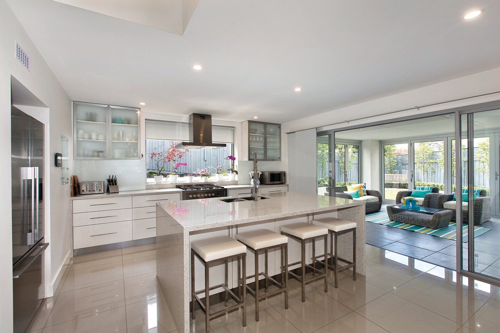 Setting a benchmark for family luxury this compelling multi-level contemporary residence has an elevated standout street presence and eye-catching rendered façade, but that is trumped by a stunning light-filled interior. Featuring magnificent picture windows and an all-white decor matched to charcoal carpets, the interior is introduced by a wide entrance with shiny Merbau floors flowing to a generous living room with gasFP, home theatre and sumptuous main bedroom with WIR and sleek ensuite both opening to a balcony. Complemented by three zoned double bedrooms with BIRs, pristine family bathroom, powder room and laundry; plus an expansive lower level family living precinct incorporating a stylish Euro & Stone kitchen with island bench, WIP and sliding doors flowing to an enclosed indoor/outdoor entertaining area with full barbeque kitchen which opens to a beautifully landscaped garden with tranquil water feature, automated zoned watering systems and LED lighting throughout - perfect for all year round alfresco living.