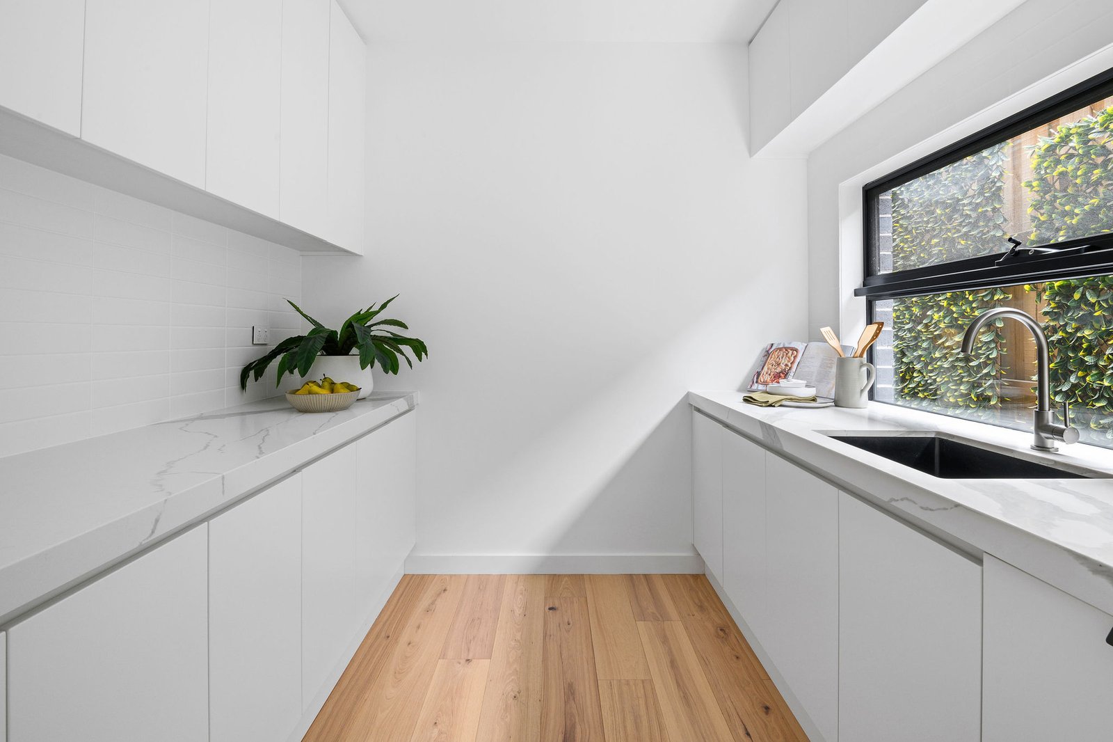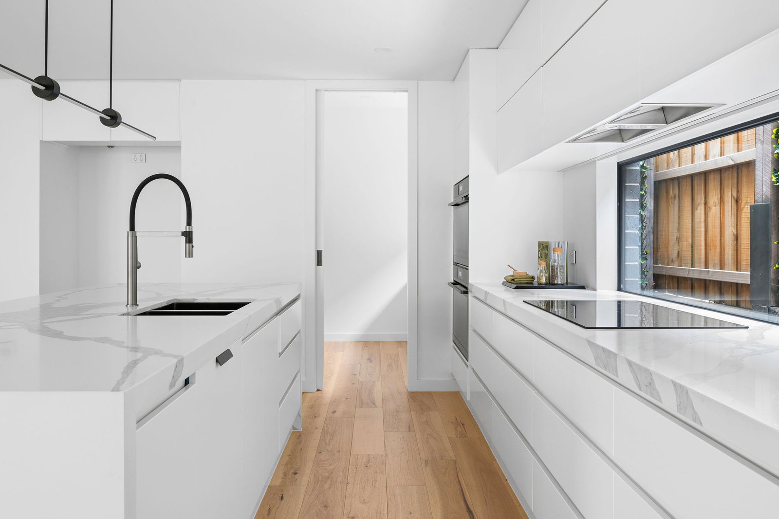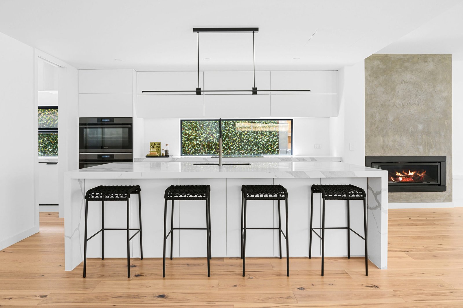 Spectacular design and high-end finishes captivate the moment you step inside, with low maintenance ease highlighted by quality wide timber floors, gunmetal grey hardware, sleek stone accents and abundant natural light. High ceilings create an airy sense of space throughout the private and generous open-plan living and dining domain, offering seamless indoor-outdoor entertaining through sliding doors, welcoming warmth by a gas fireplace or easy alfresco dining. A striking gourmet kitchen presents a luxe feel, featuring stone benches, clever storage, and state-of-the-art appliances, including two Westinghouse 900mm ovens with pyrolytic multifunction’s, an induction cooktop and two Bosch dishwashers, one of which is located within the accompanying butler’s pantry.