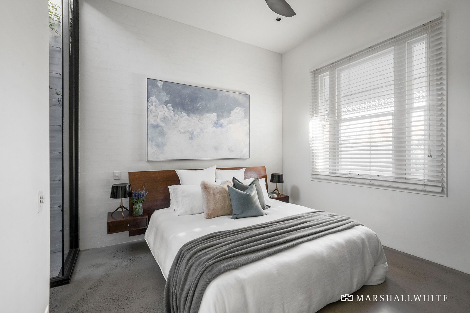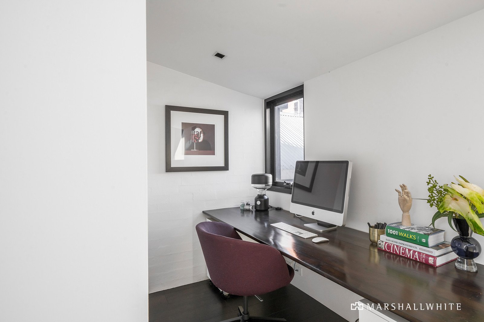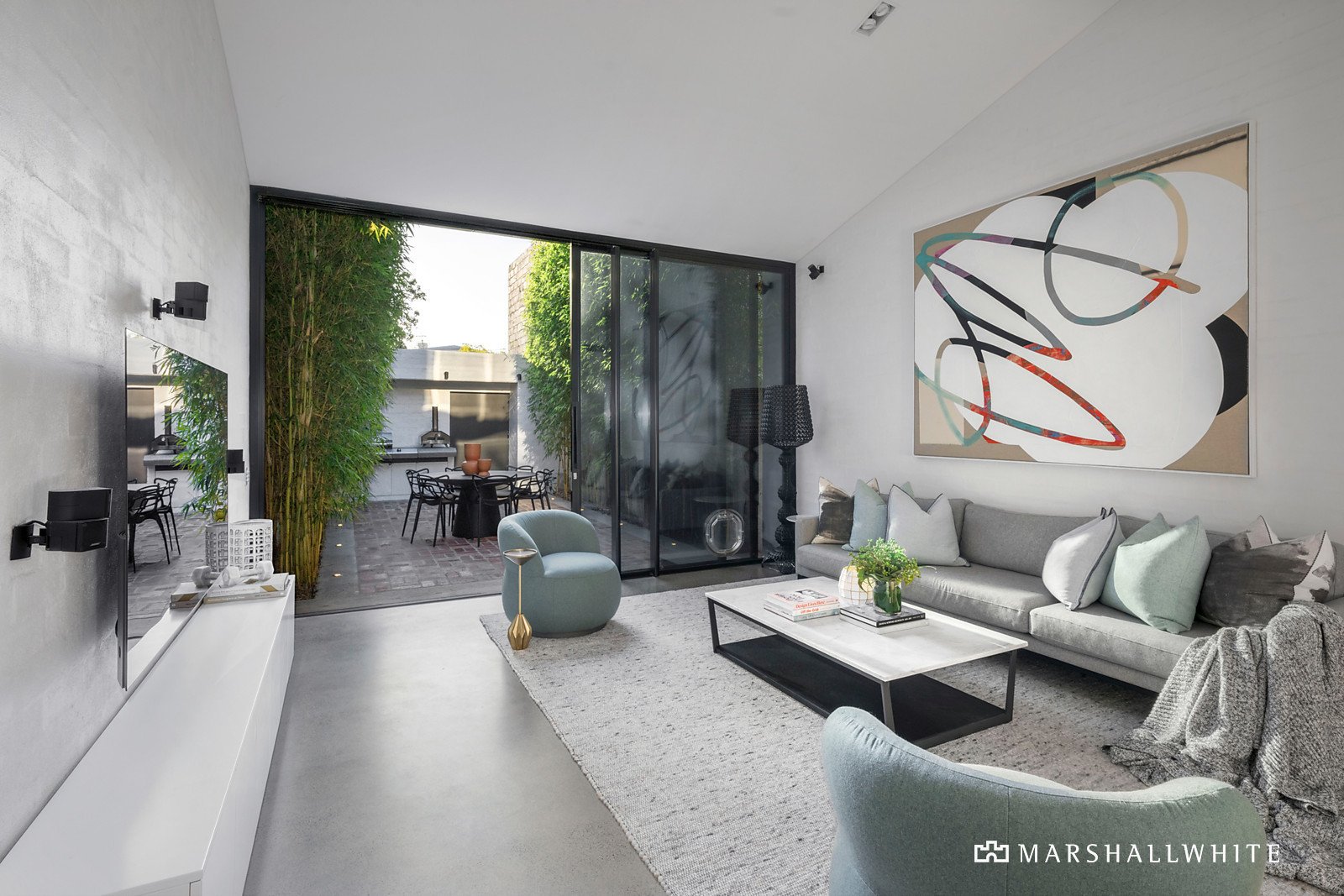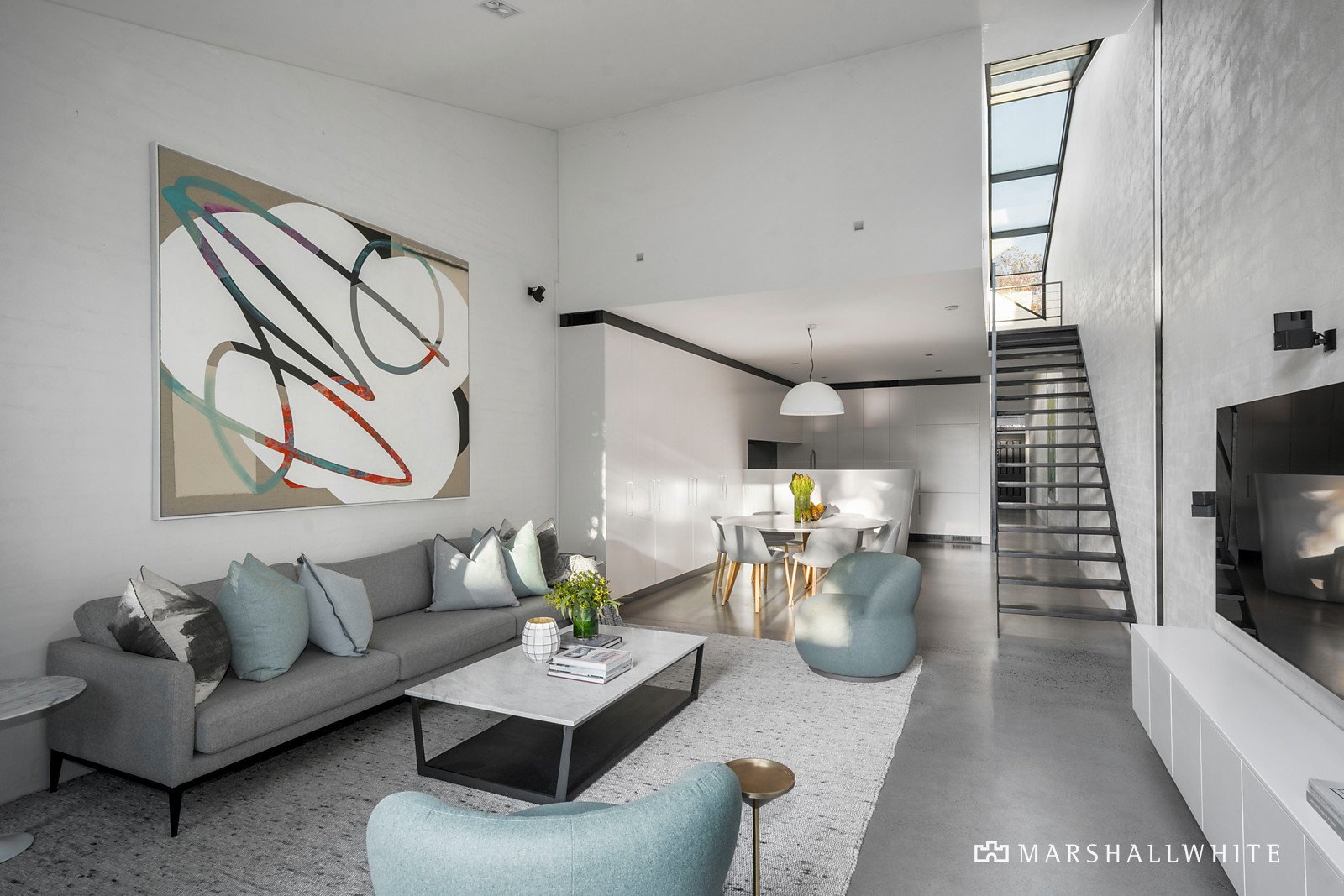 Streamlined high ceilings, bagged brick walls and polished concrete floors immediately establish the contemporary credentials through the wide entrance hall and stunning gourmet kitchen boasting white stone benches, Miele appliances and integrated fridge/freezer. Raked ceilings accentuate the sense of space in the open plan living and dining room where full height stacking glass sliders open completely to a glorious private landscaped west facing courtyard. With soaring bamboo on either side and a built in BBQ, it is a tranquil setting for al fresco dining. At the rear of the courtyard, a garage with storage, workshop and Euro-laundry is accessed from College Place. A beautiful main bedroom with tranquil lightwell, walk in robe and designer en suite with bath enjoys its own space downstairs. Glass roofed stairs lead up to a fitted home office and second double bedroom with walk in robe and stylish en suite.