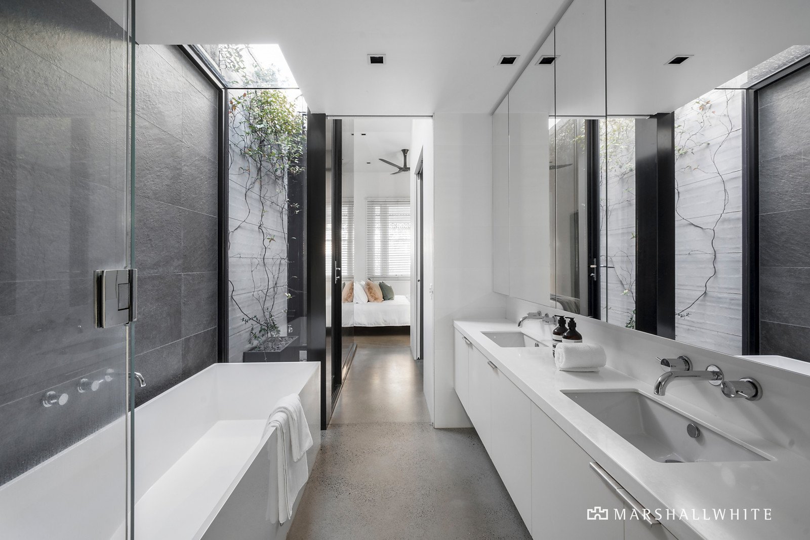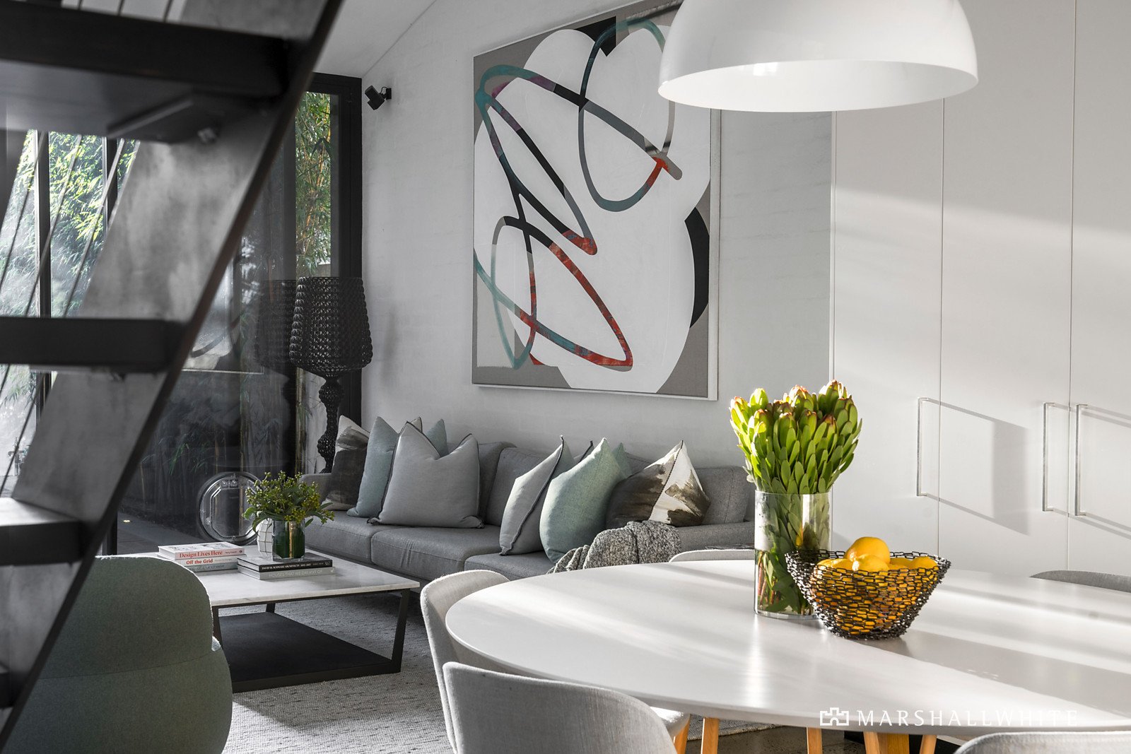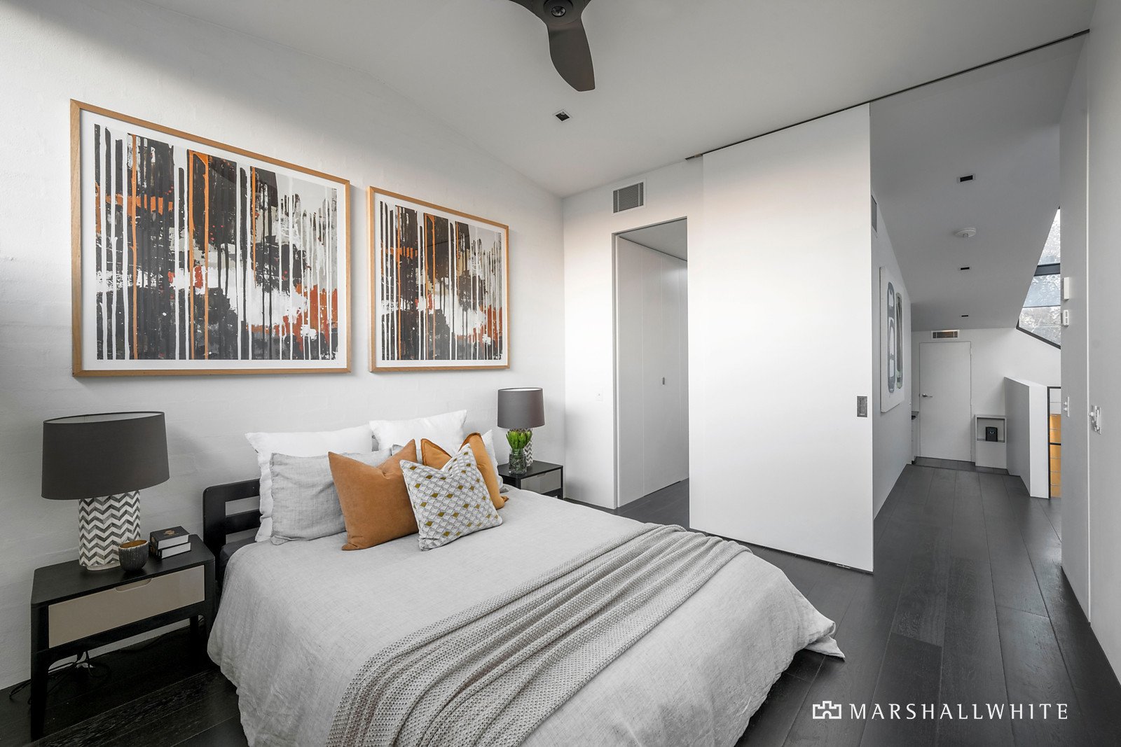 Streamlined high ceilings, bagged brick walls and polished concrete floors immediately establish the contemporary credentials through the wide entrance hall and stunning gourmet kitchen boasting white stone benches, Miele appliances and integrated fridge/freezer. Raked ceilings accentuate the sense of space in the open plan living and dining room where full height stacking glass sliders open completely to a glorious private landscaped west facing courtyard. With soaring bamboo on either side and a built in BBQ, it is a tranquil setting for al fresco dining. At the rear of the courtyard, a garage with storage, workshop and Euro-laundry is accessed from College Place. A beautiful main bedroom with tranquil lightwell, walk in robe and designer en suite with bath enjoys its own space downstairs. Glass roofed stairs lead up to a fitted home office and second double bedroom with walk in robe and stylish en suite.