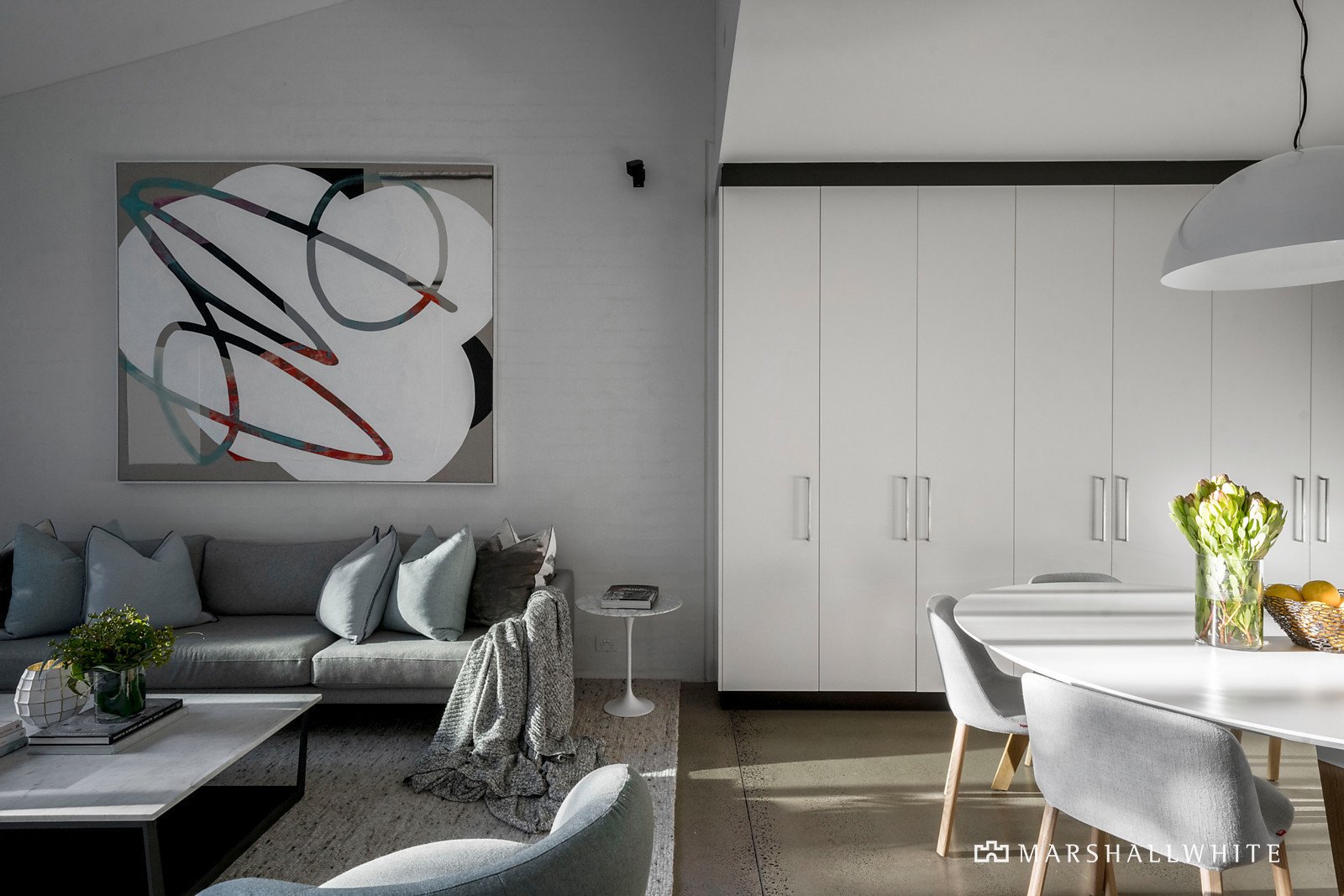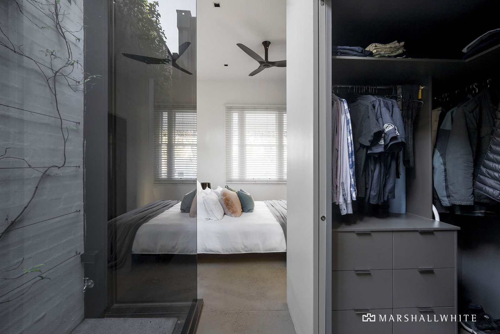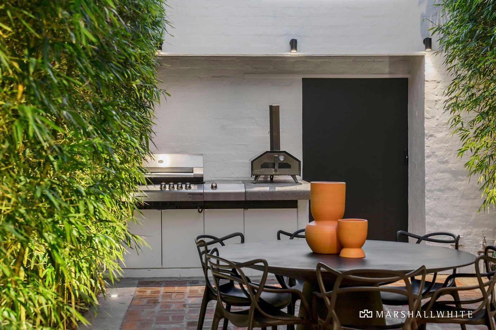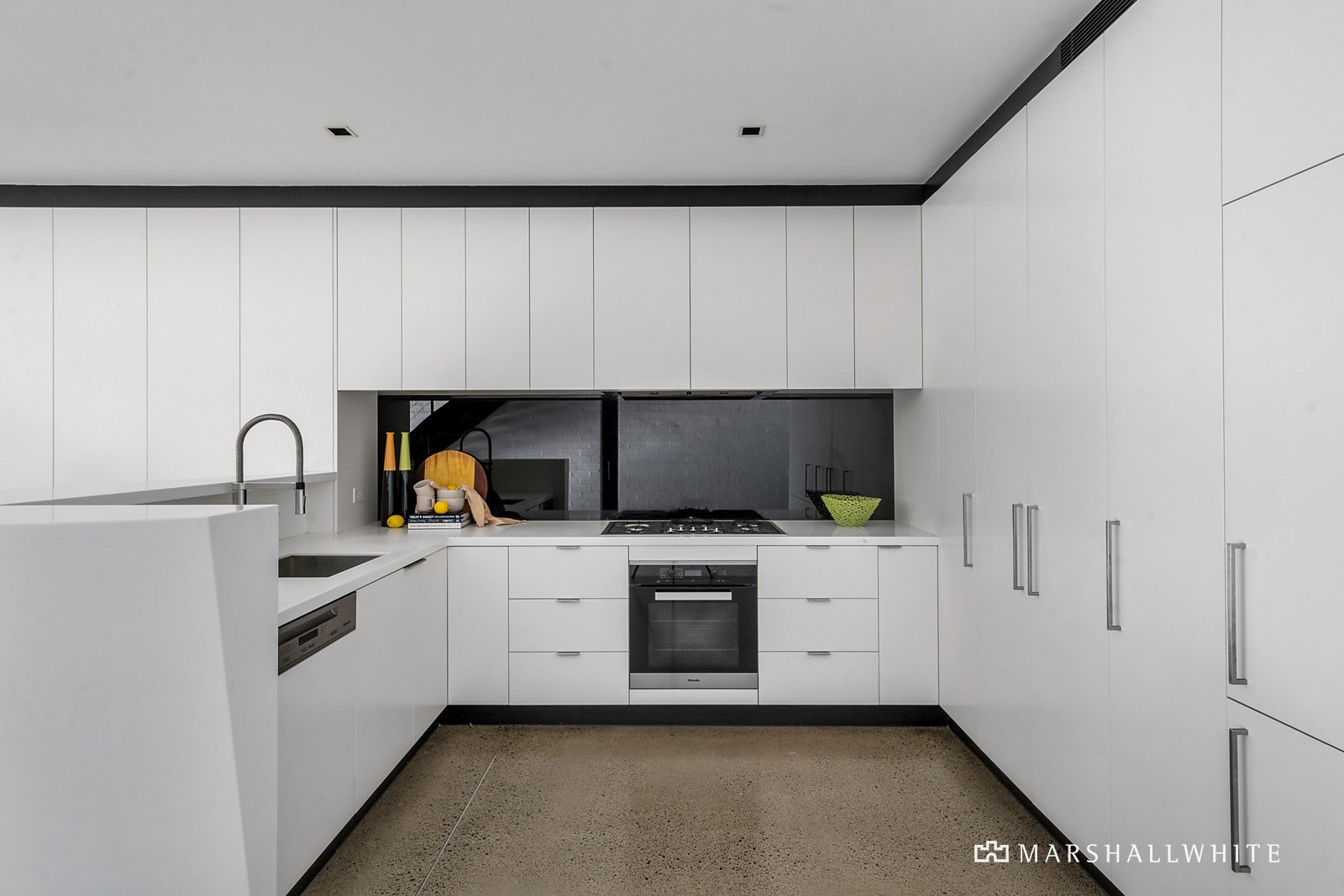 Streamlined high ceilings, bagged brick walls and polished concrete floors immediately establish the contemporary credentials through the wide entrance hall and stunning gourmet kitchen boasting white stone benches, Miele appliances and integrated fridge/freezer. Raked ceilings accentuate the sense of space in the open plan living and dining room where full height stacking glass sliders open completely to a glorious private landscaped west facing courtyard. With soaring bamboo on either side and a built in BBQ, it is a tranquil setting for al fresco dining. At the rear of the courtyard, a garage with storage, workshop and Euro-laundry is accessed from College Place. A beautiful main bedroom with tranquil lightwell, walk in robe and designer en suite with bath enjoys its own space downstairs. Glass roofed stairs lead up to a fitted home office and second double bedroom with walk in robe and stylish en suite.