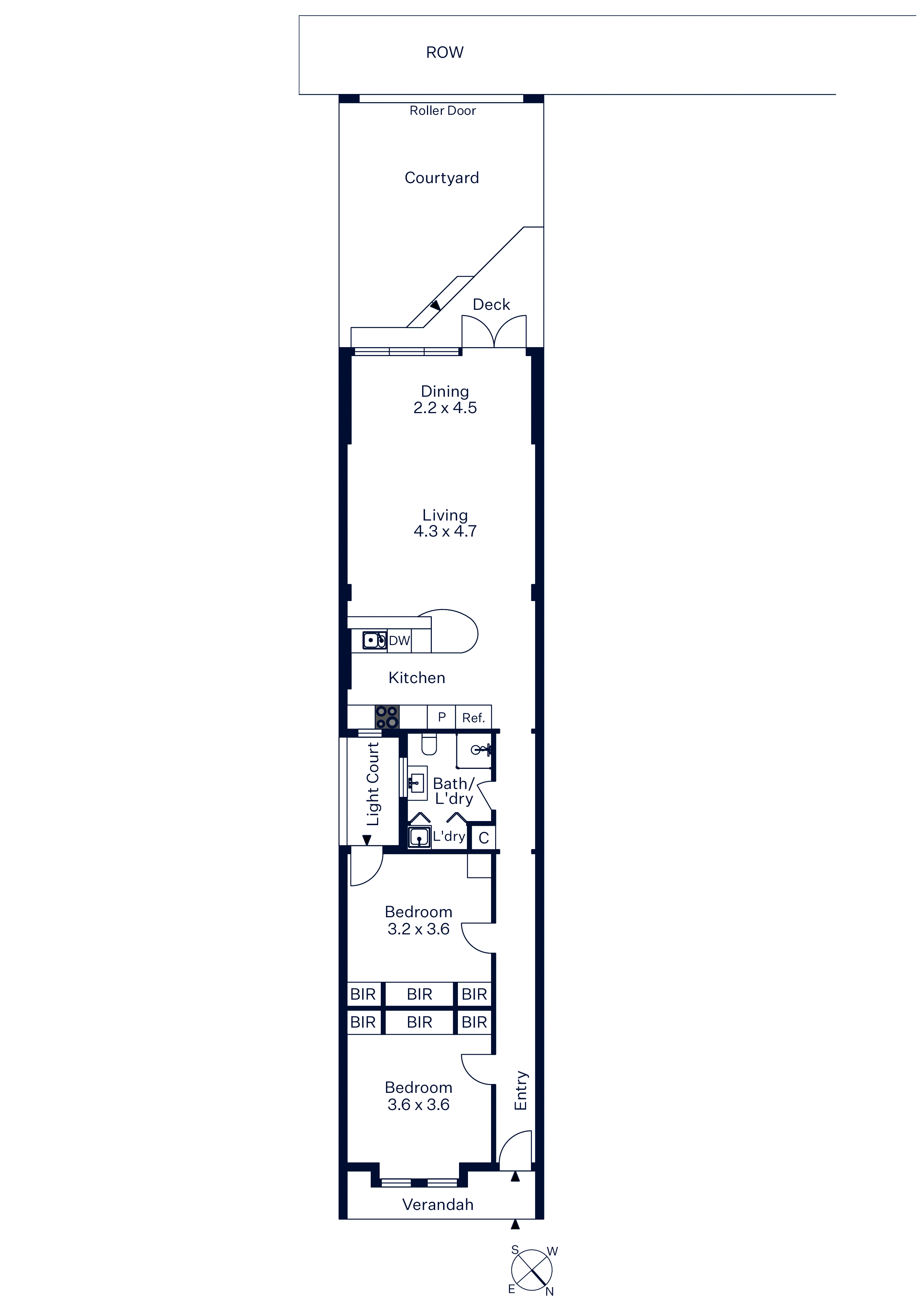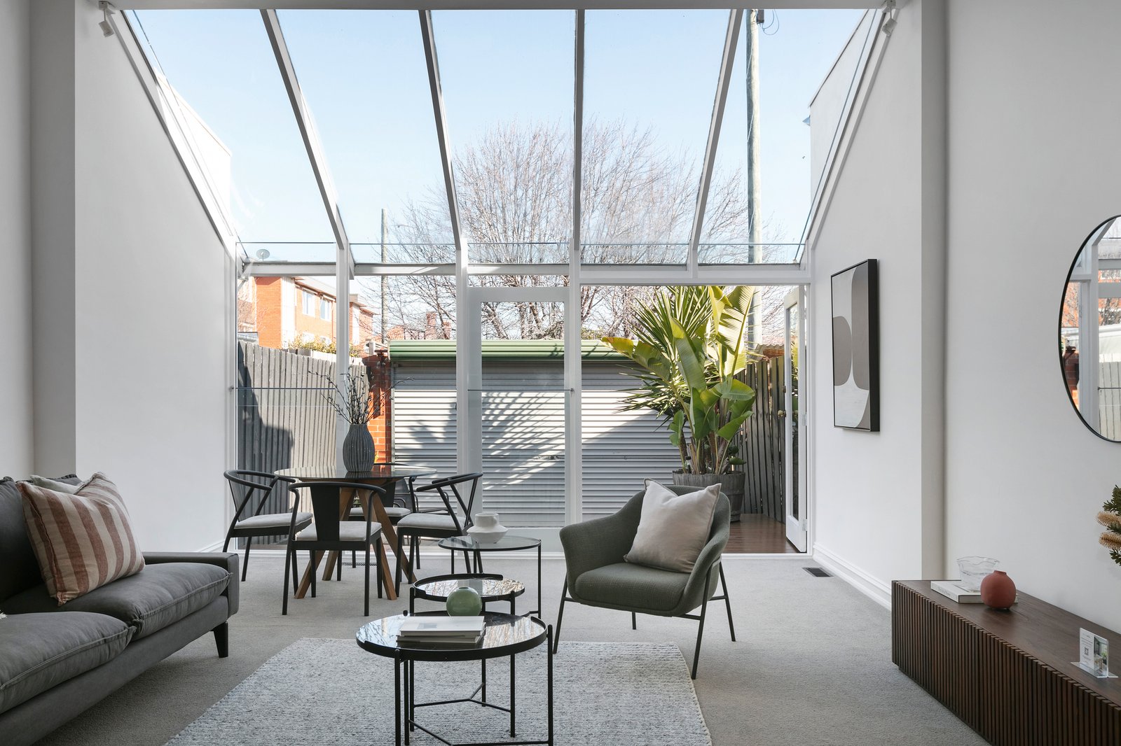 Behind the attractive boom-era façade and garden, a bright hallway with Baltic pine floors flows through to an inviting sky-lit open plan living and dining room with a well-equipped modern kitchen. Glass atrium ceilings emphasise the light-filled aspect and connection to the outdoors, where a private courtyard invites idyllic outdoor dining and relaxing with roller-door vehicle access via ROW. Two spacious bedrooms feature built-in robes, including the north-facing main and the second with light-well courtyard access.