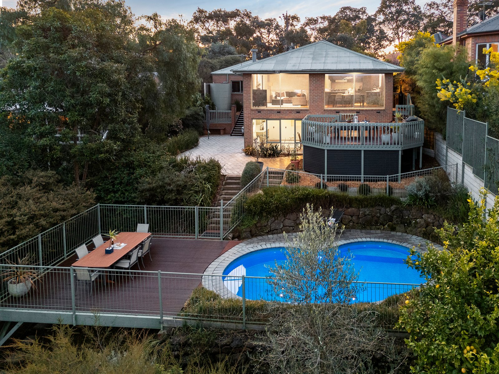 The tiered outdoor spaces including an entertainer deck with views will please alfresco lovers, as will the solar heated swimming pool and lush gardens. This dwelling also delivers a laundry, split system heating/cooling, lower ground level storage room, solar power, rainwater tank, and a double remote garage.