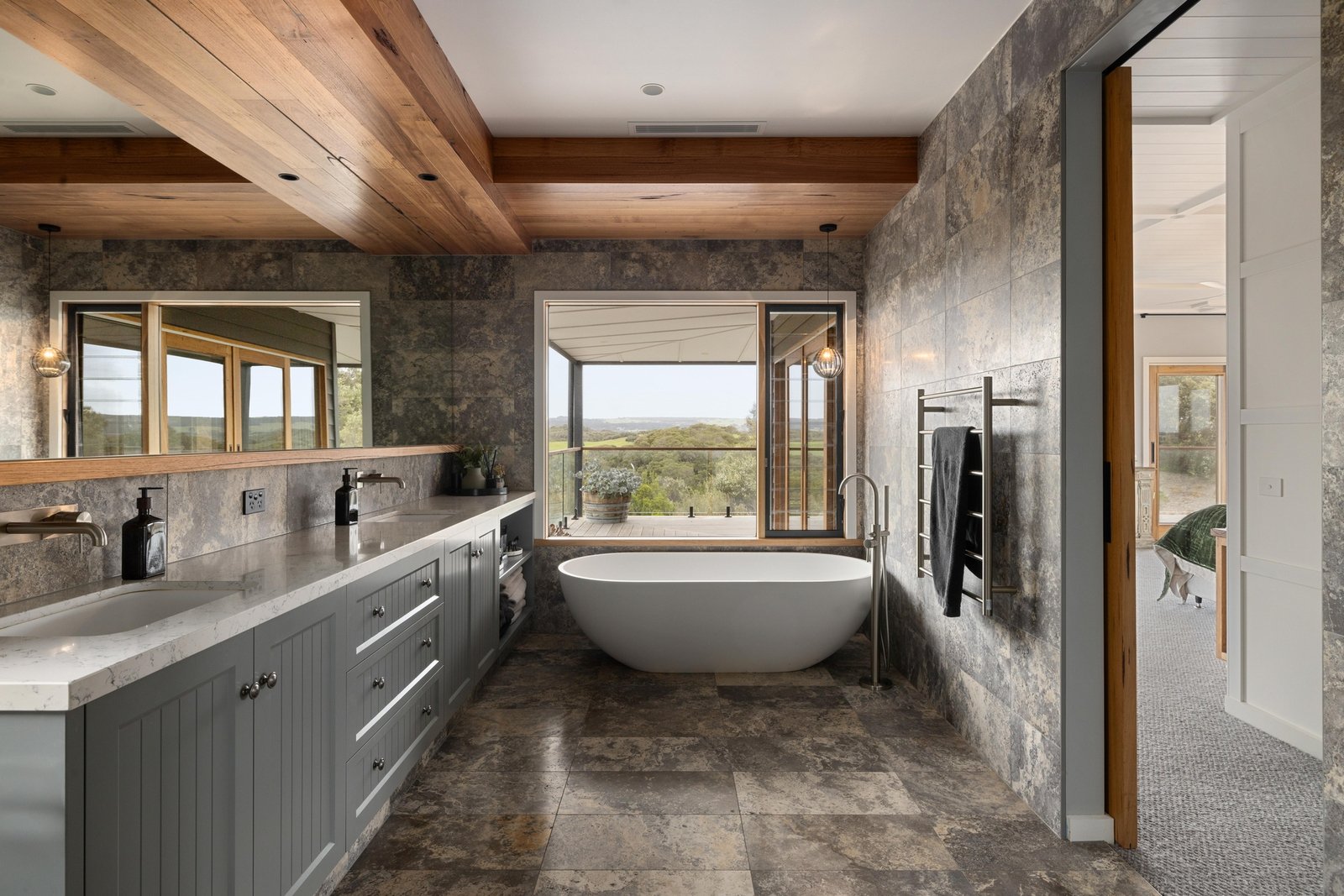 Placement on the highest point of its undulating site beside the Moonah Links precinct reveals postcard views over the 7th fairway, with the rugged clifftops of St Andrews Beach undulating in the distance. A locally sourced limestone and weatherboard construction leans well into its farmhouse brief, enhanced with Wormy Chestnut floors, high ceilings, and double glazing, plus handcrafted Silvertop Ash windows, doors and decorative elements with touches of fluted glass.