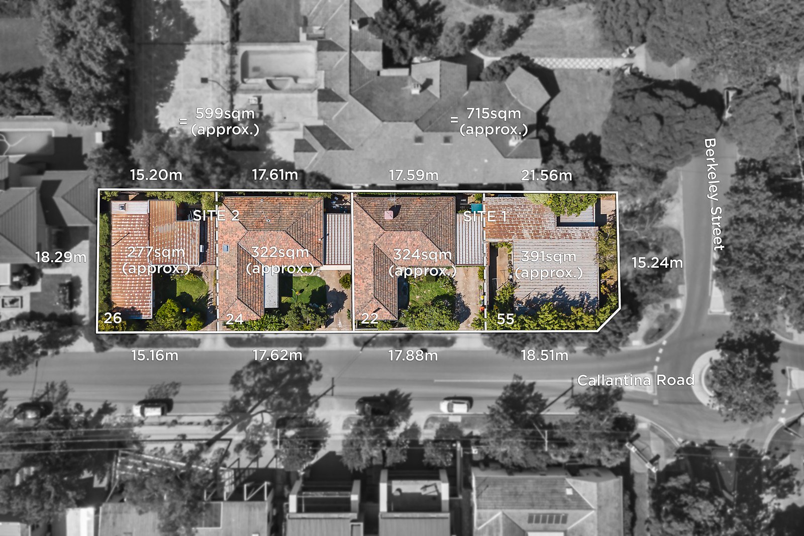 The properties are currently occupied by four side-by-side freestanding houses which are all immediately liveable and can provide interim rental income. The properties are to be offered as two separate adjoining sites. Site 1 being 55 Berkeley Street + 22 Callantina Road and site 2 being 24 + 26 Callantina Road. If a buyer chooses to buy both sites, they will have a parcel of land spanning 1,314sqm approx.