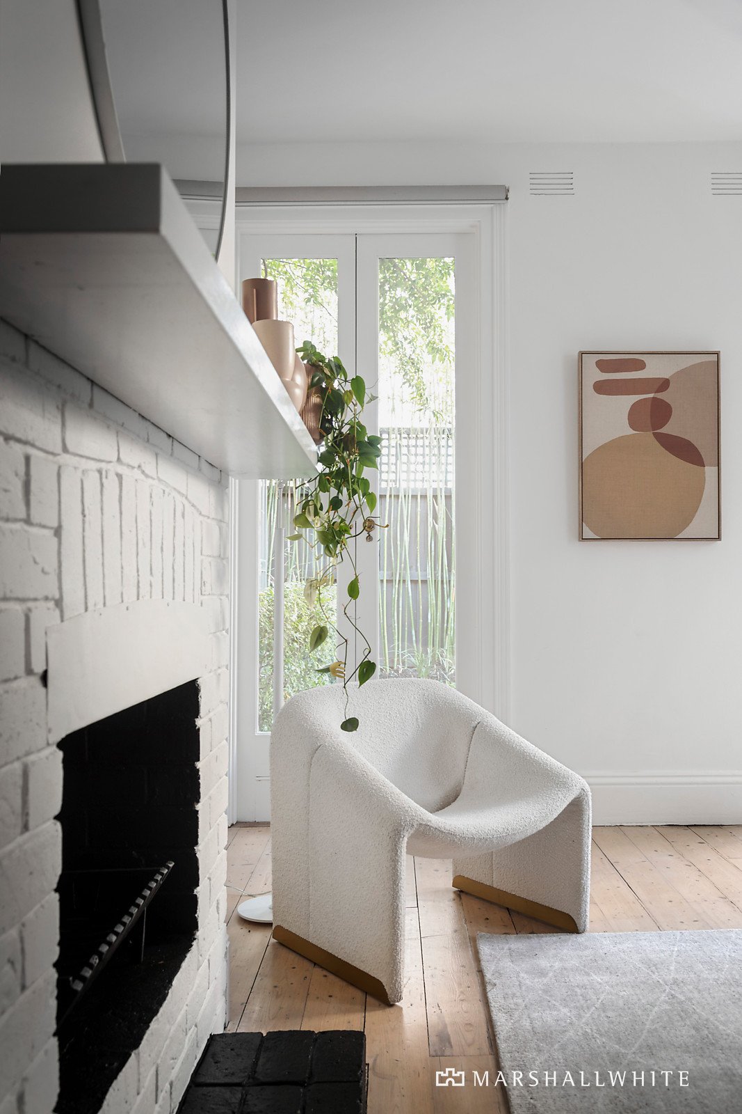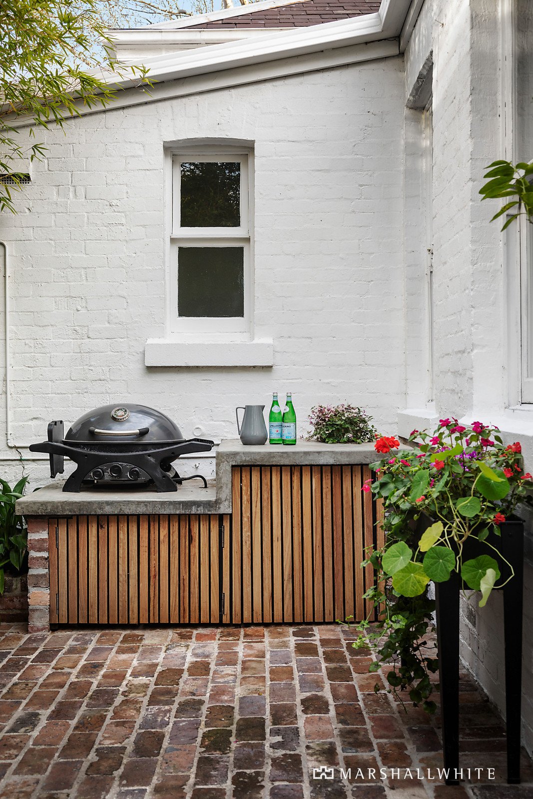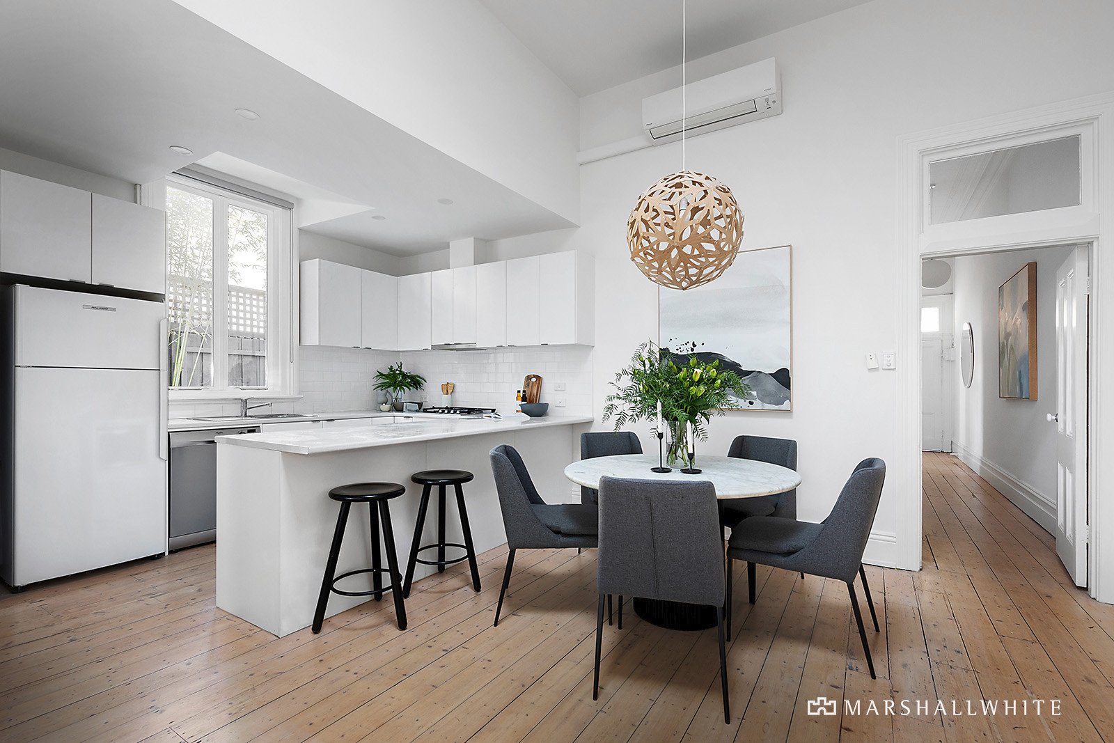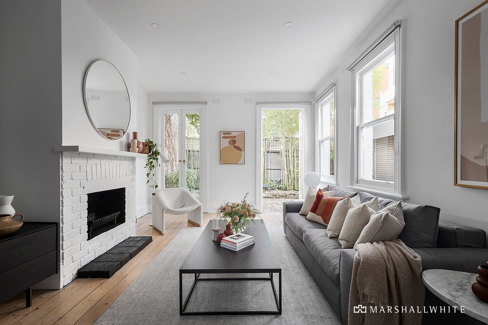 Emphasising modern function and extraordinary light from a desirable rear aspect, the home's sun-drenched corner position benefits from side laneway access and secure off street parking for one, whilst the interior offers a flawless connection to a lush courtyard through generous open-plan living and dining. A roaring fireplace in the living zone adds to a warming ambience, inviting indoor-outdoor ease with an adjacent well-appointed kitchen and direct access to the red-brick landscaped courtyard with a built-in BBQ bench.