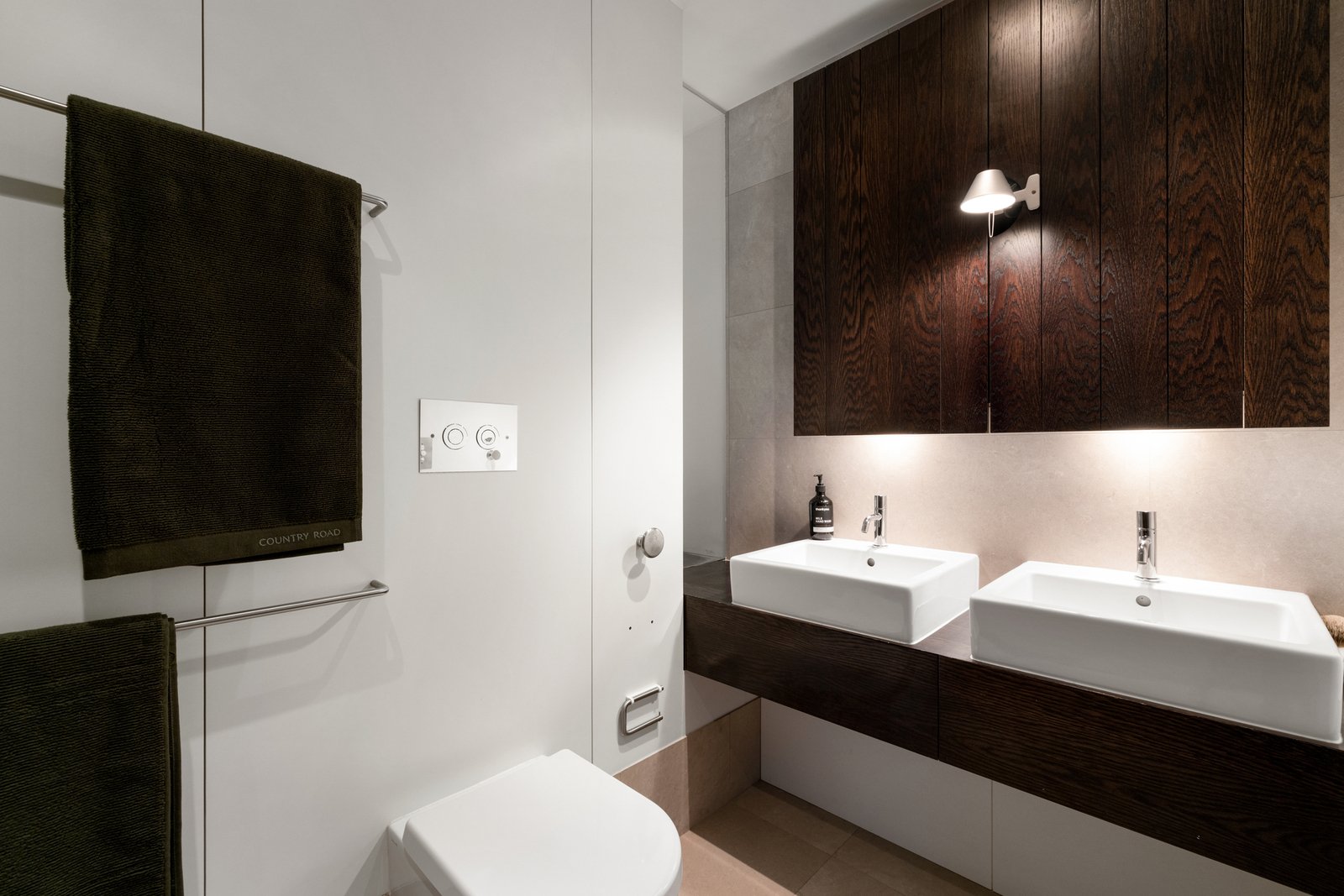 The upper level features a private bedroom wing with three spacious rooms, all oriented southeast to capture morning sun and views across the bay and park, as well as a home office or fourth bedroom with integrated joinery that lends itself to varied uses. The main suite enjoys a secluded position beyond a custom-panelled entry, featuring a fitted walk-in robe with a city outlook, bay views from the bed, and a luxurious dual-vanity en-suite.