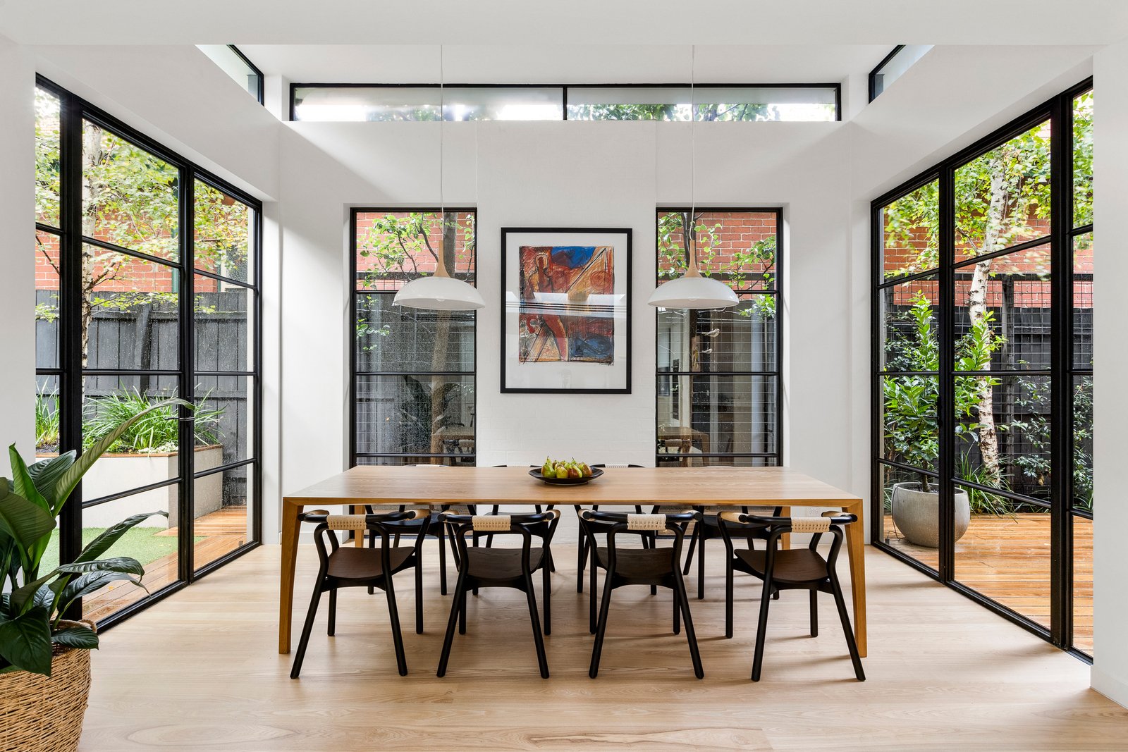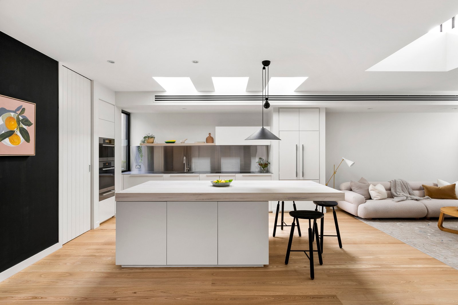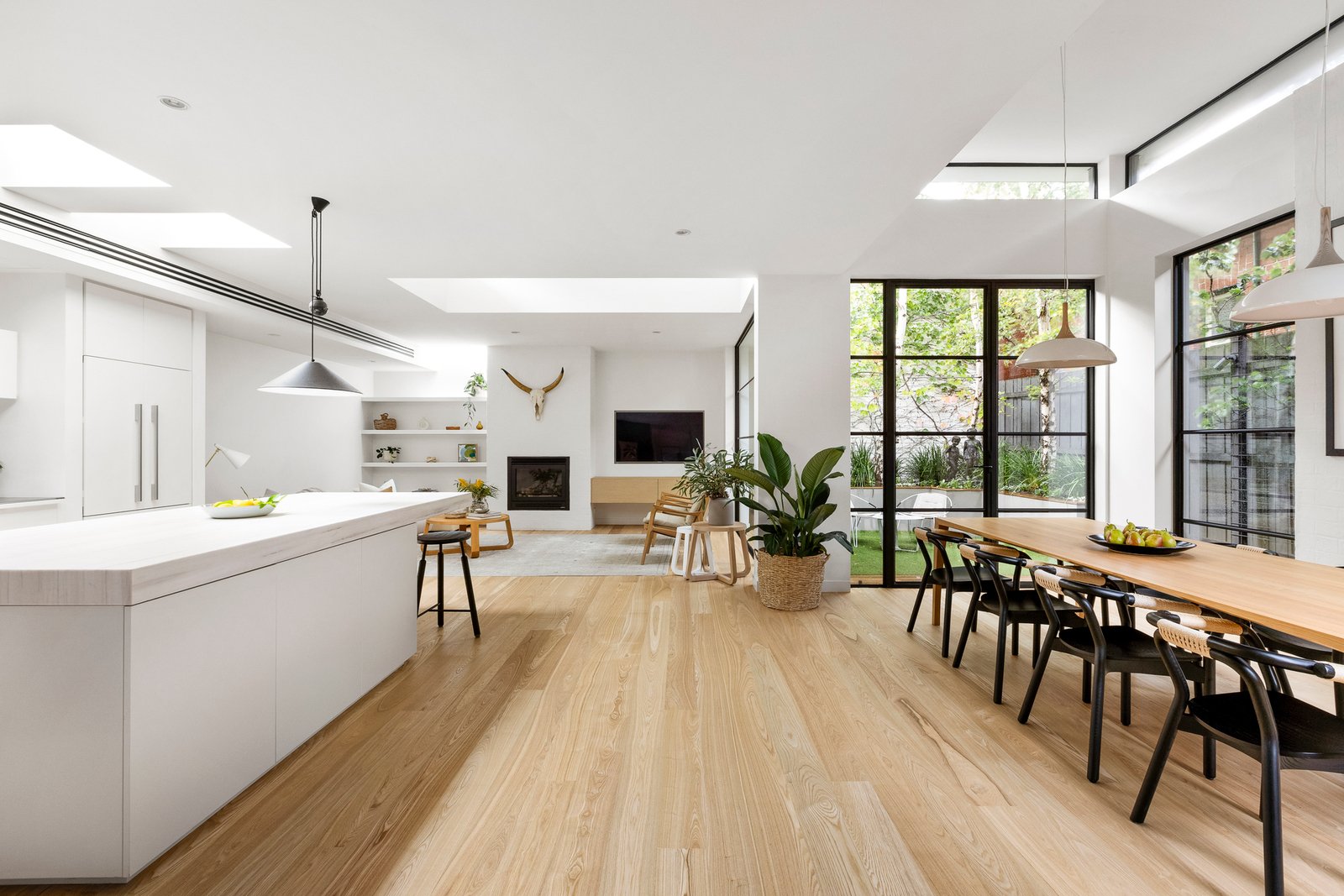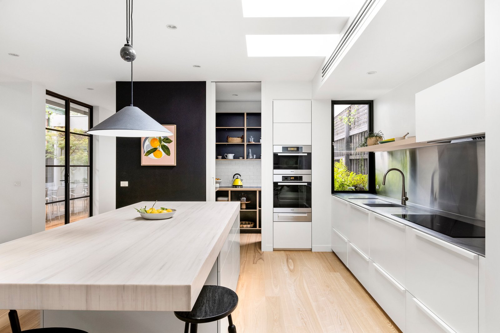 The open plan domain comes alive beneath feature skylights, with full-height steel-framed glazing opening to the landscaped courtyard. A true entertainer in every sense, the entire zone revolves around the kitchen’s impressive stone island, appointed with premium appliances and seamless custom cabinetry and a walk-in pantry, extending to a distinct living area with a gas fire, and dining room encased in glass walls with high-set windows.