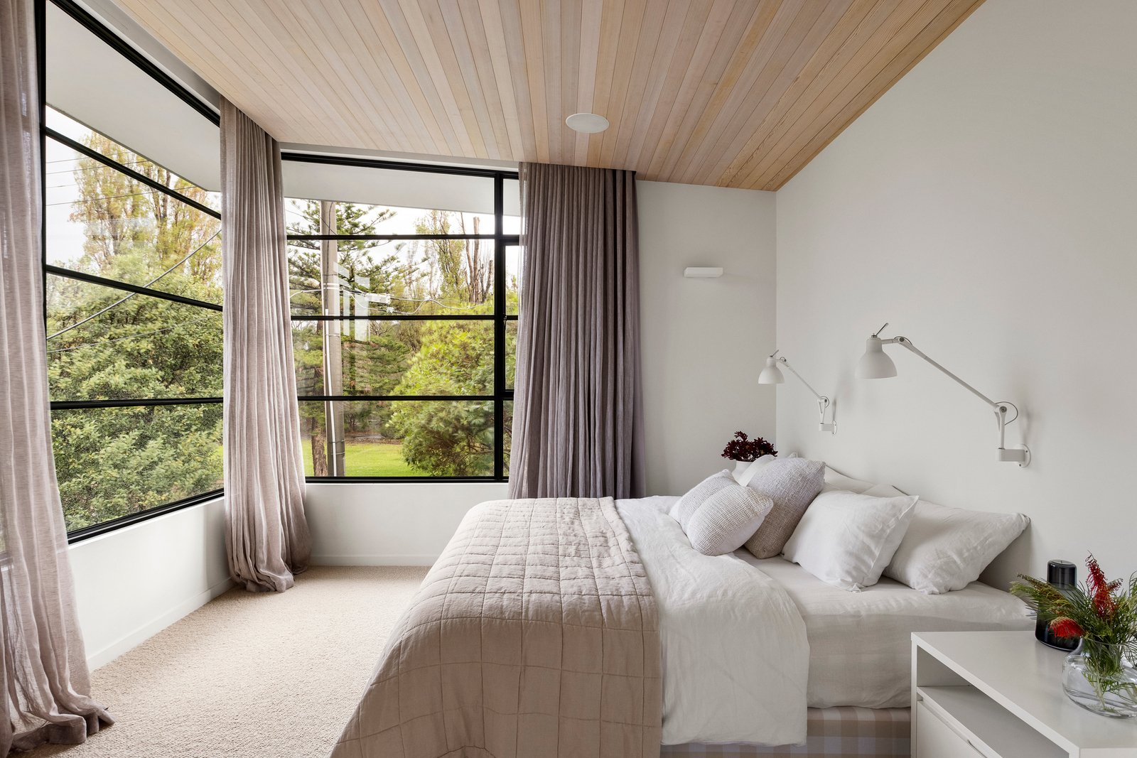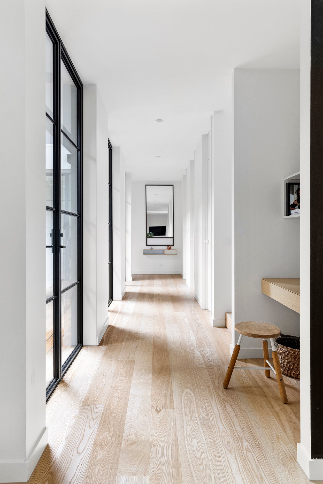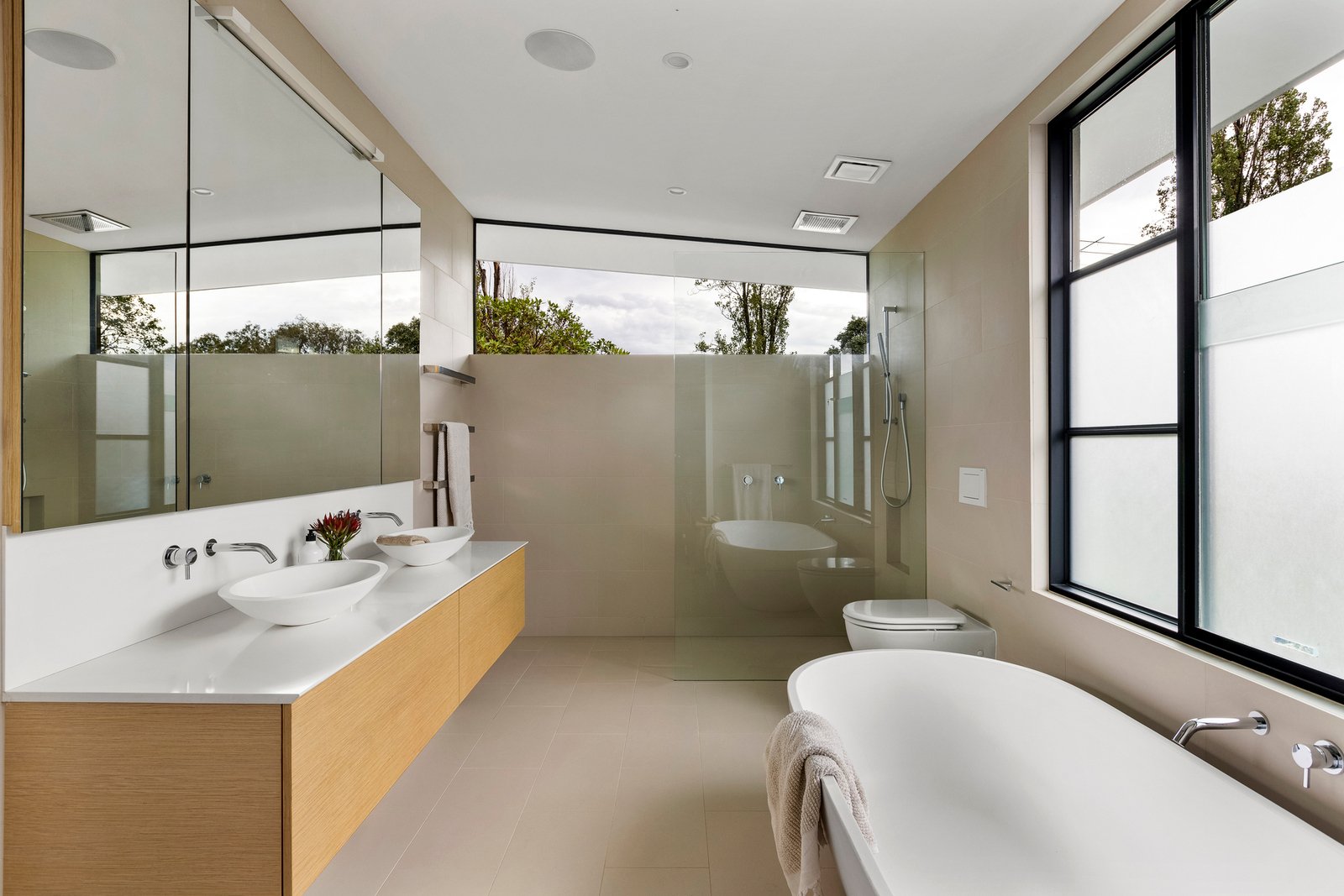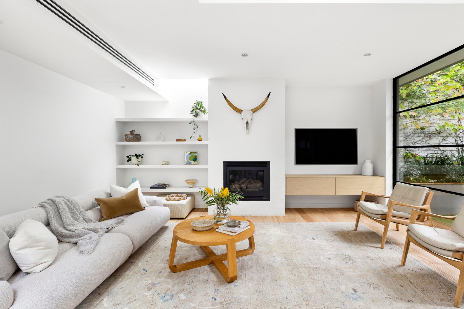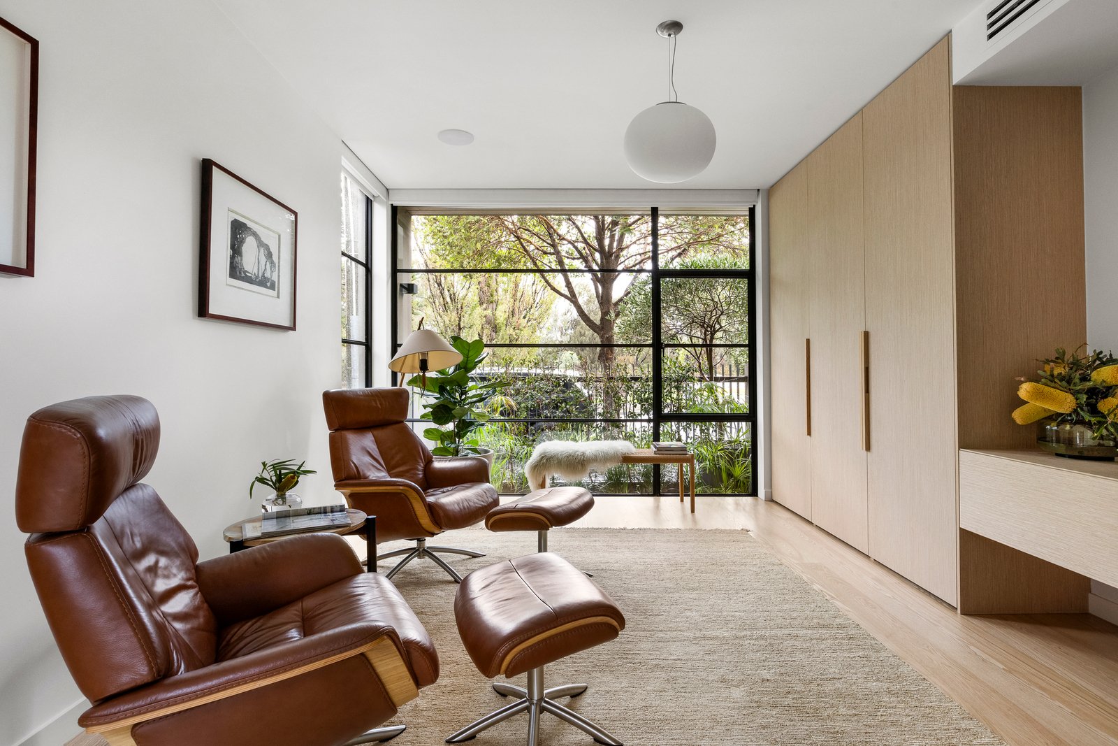 The open plan domain comes alive beneath feature skylights, with full-height steel-framed glazing opening to the landscaped courtyard. A true entertainer in every sense, the entire zone revolves around the kitchen’s impressive stone island, appointed with premium appliances and seamless custom cabinetry and a walk-in pantry, extending to a distinct living area with a gas fire, and dining room encased in glass walls with high-set windows.