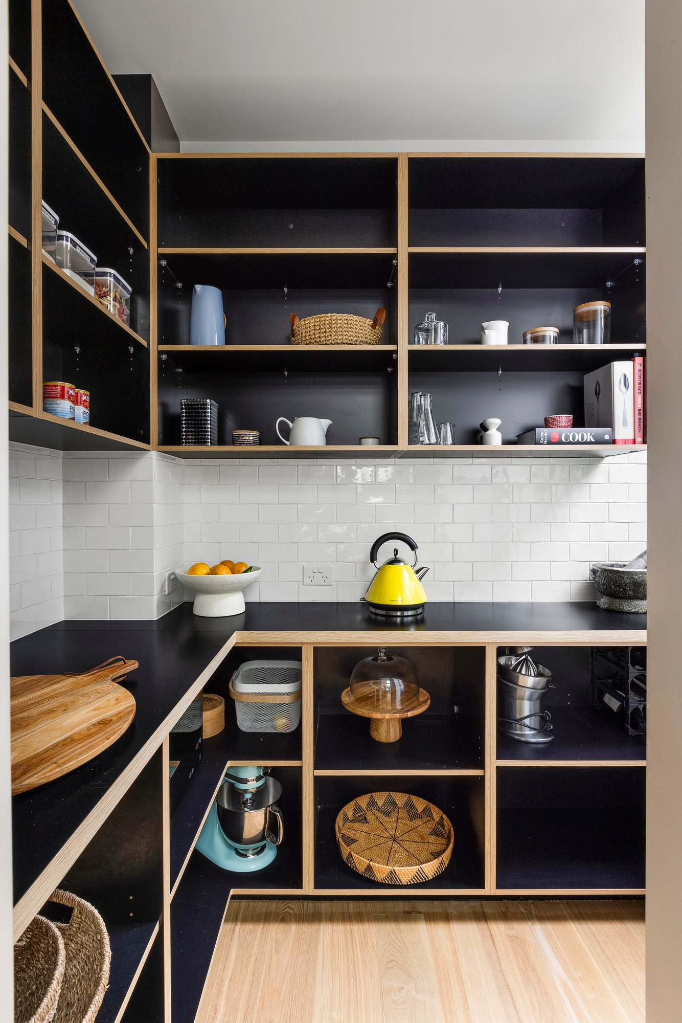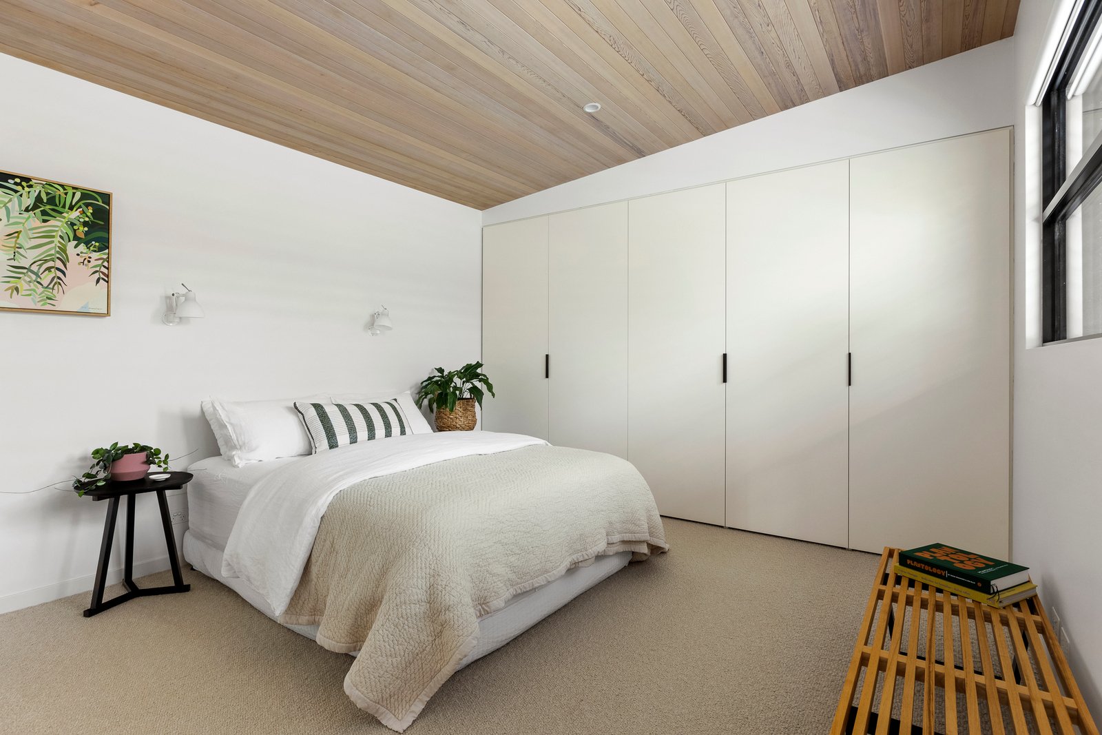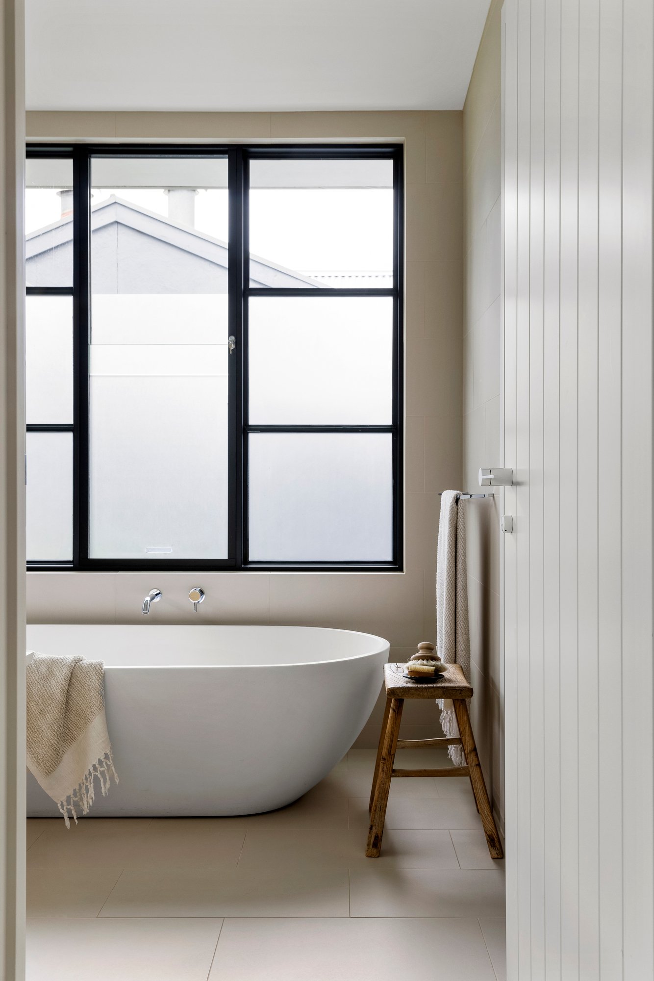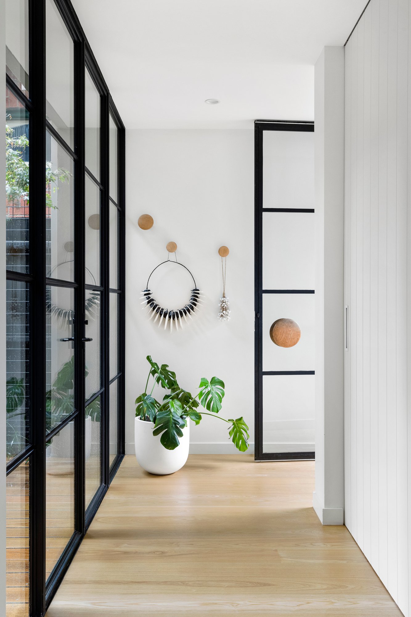 The open plan domain comes alive beneath feature skylights, with full-height steel-framed glazing opening to the landscaped courtyard. A true entertainer in every sense, the entire zone revolves around the kitchen’s impressive stone island, appointed with premium appliances and seamless custom cabinetry and a walk-in pantry, extending to a distinct living area with a gas fire, and dining room encased in glass walls with high-set windows.