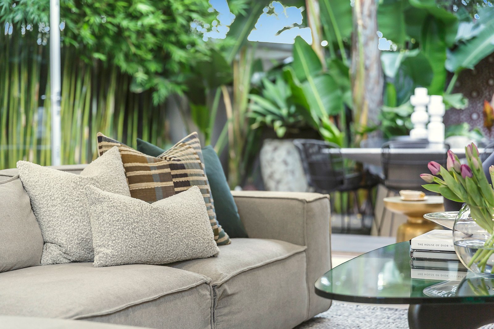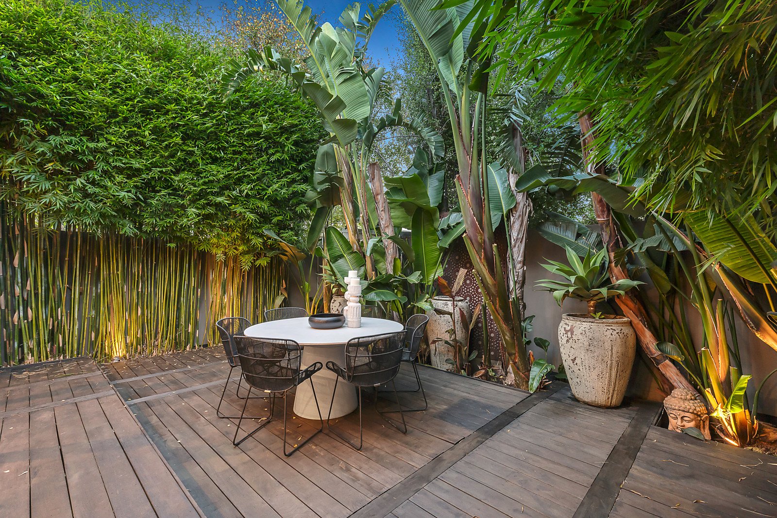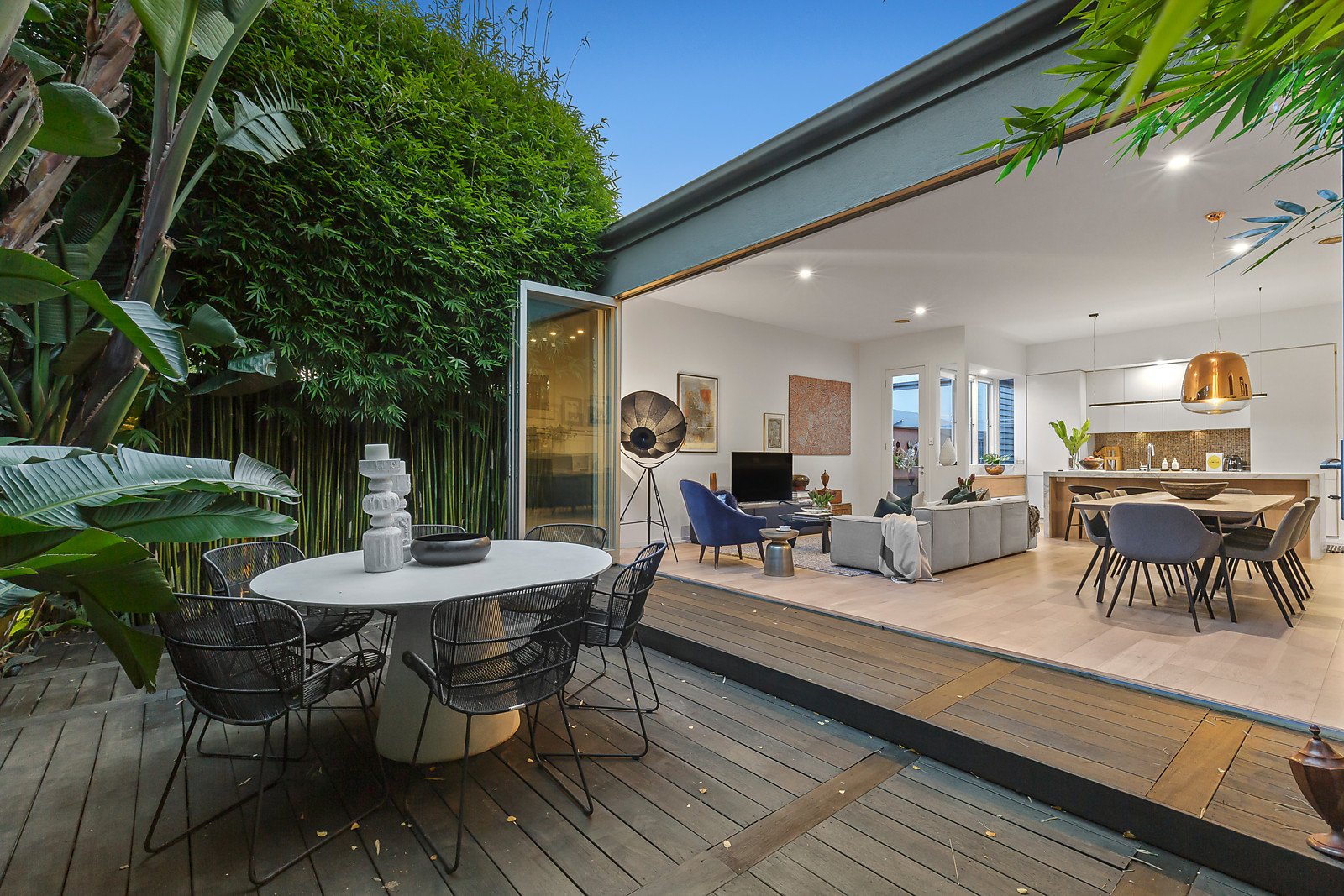 Designer styling is evident in the interior, which features high ceilings throughout and a long hall with wide oak floors flanking three bedrooms, main with a WIR and marble tiled ensuite and a sparkling family bathroom with a concealed laundry. Flowing to a spectacular living and dining precinct plus a sleek kitchen with Calacatta marble island bench and prestige Smeg, Miele and Bosch appliances and integrated fridge/freezer; plus full-height bi-fold doors opening to a deck and tropical garden delivering a tranquil oasis for year-round relaxing with family and friends in complete privacy.