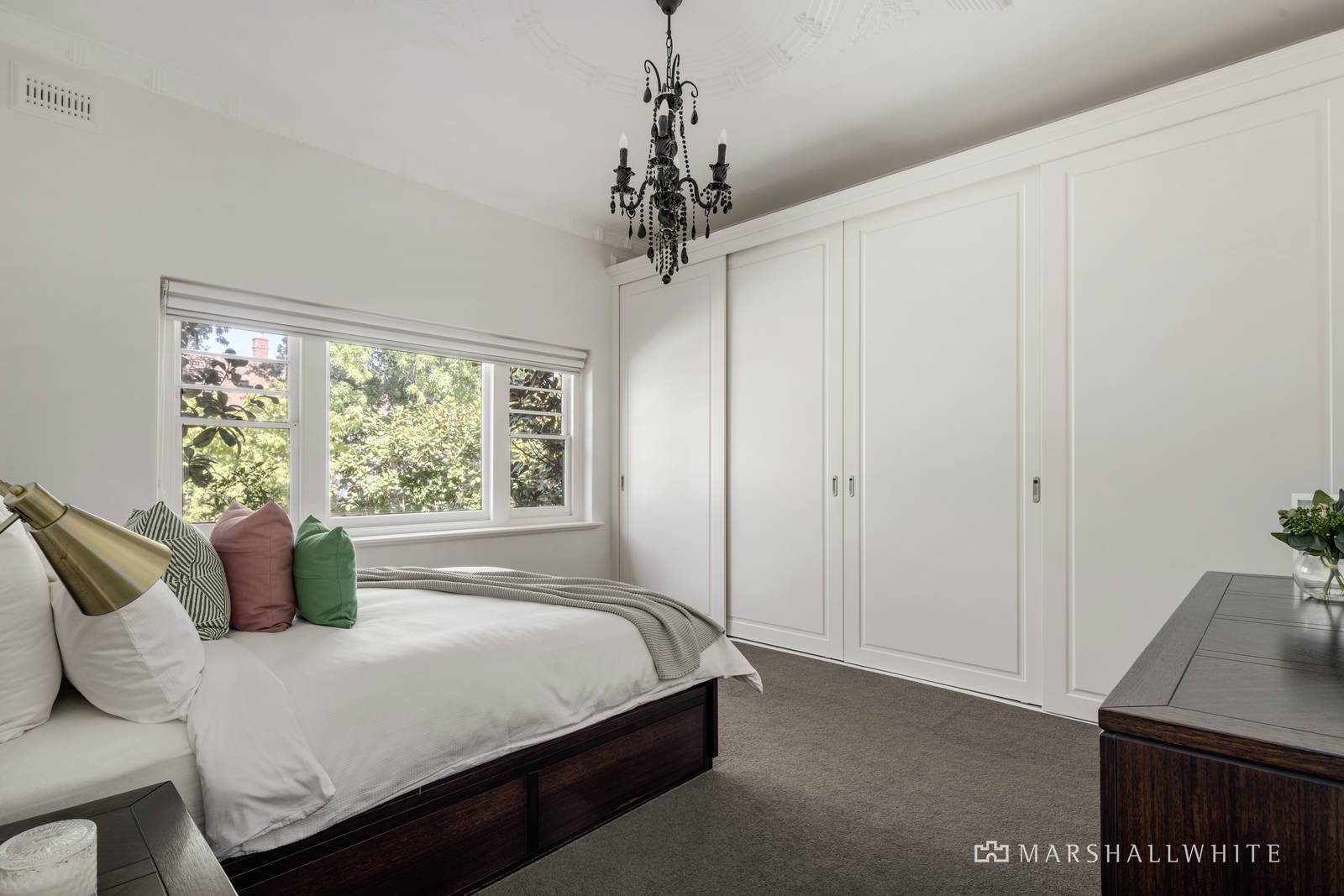 Irresistible period features including high ceilings with several ornate features and timber floors are displayed throughout the home, with its exceptional easy flow between rooms. Greeted by a wide entrance hall connecting to gracious sitting room with a fireplace and inviting dining room that opens into the sleek gourmet kitchen appointed with stone benches, Miele dishwasher and Siemens oven. The home unfolds into a beautifully flexible living room with study retreat that opens through bi-fold doors onto the large, covered deck affording an amazing outlook into the deep private garden shaded by a magnificent oak tree. A bespoke black chandelier presides above the beautiful main bedroom with its massive built-in robes, complemented by two additional bedrooms and a stylish bathroom.