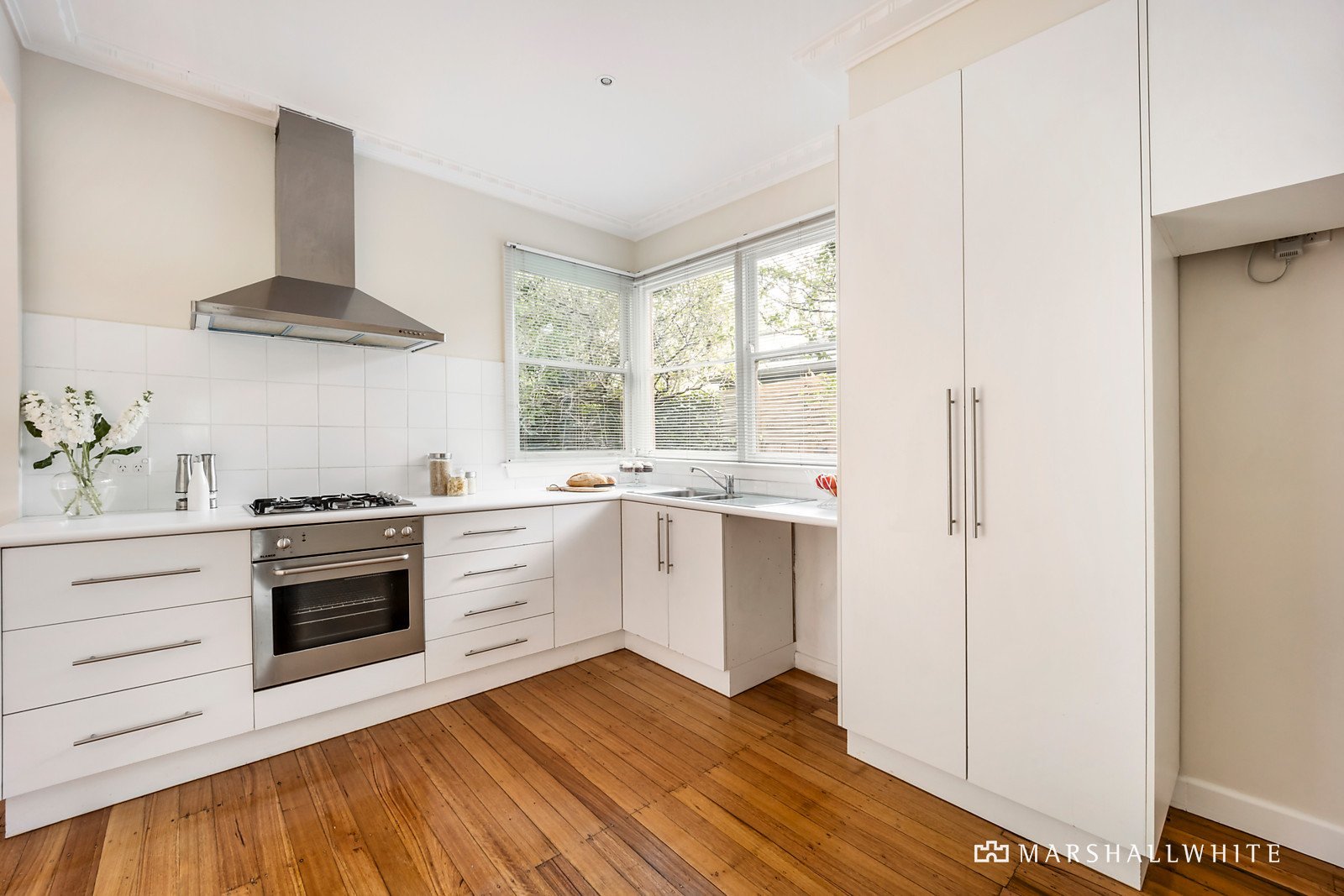 Bathed in an abundance of natural light throughout, the entry hall featuring timber floors flows through to three double bedrooms and a bright bathroom with separate WC. The timber floors continue through a well-appointed kitchen and the generous open plan living and dining room extending out to a large sunny deck overlooking the leafy garden.