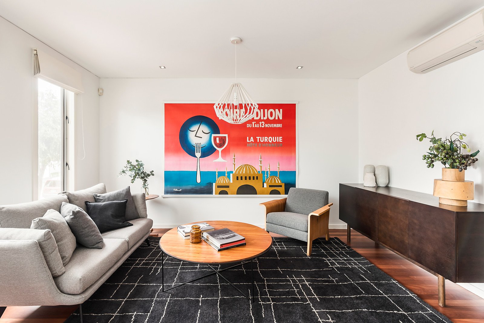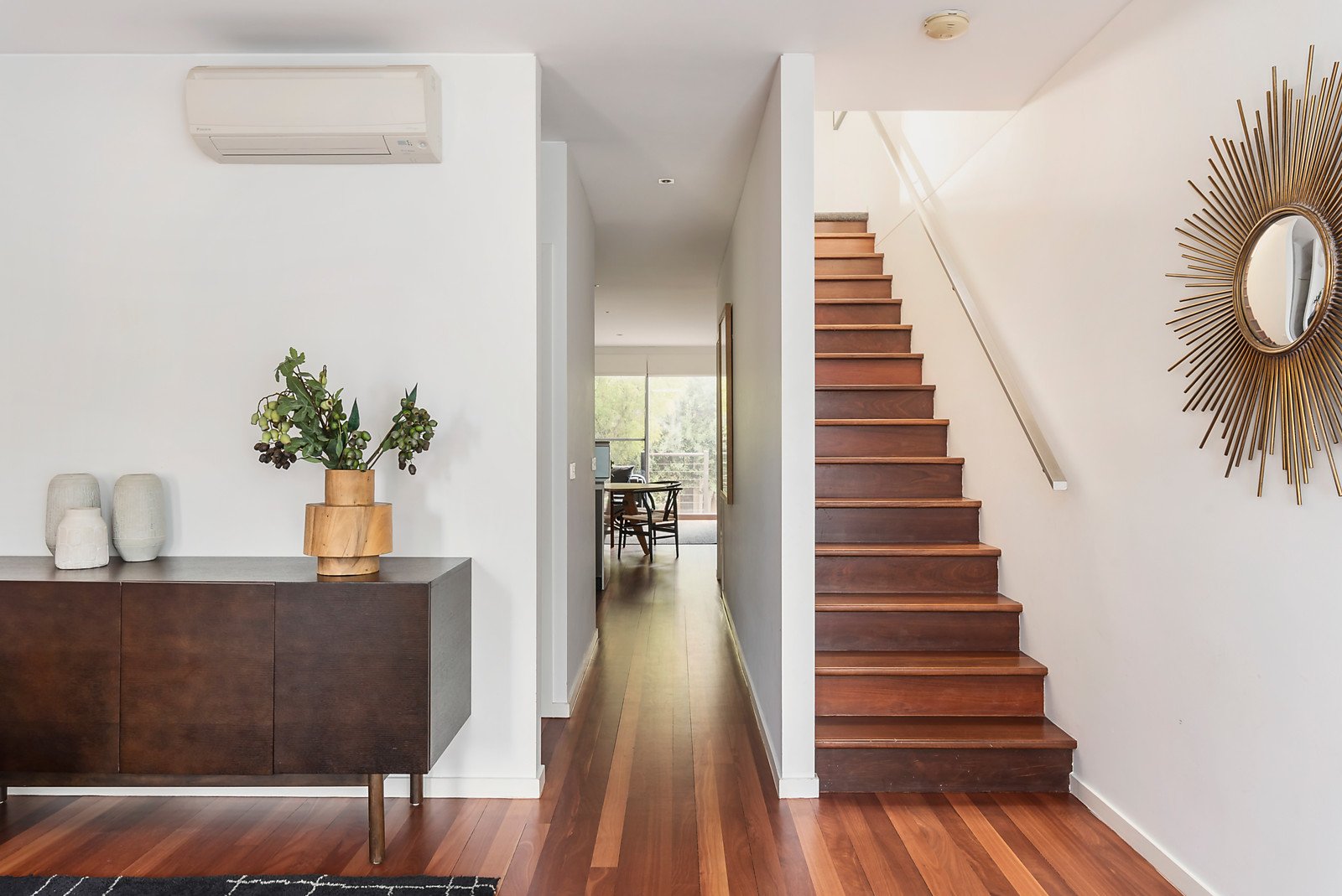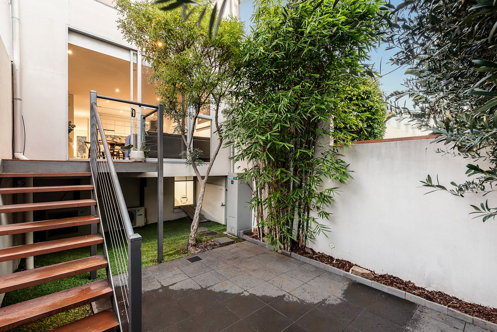 Natural light streams through a versatile sitting room or home office featuring timber floors. The generous open plan living and dining room with a modern kitchen boasting Smeg appliances opens to a private north-facing paved courtyard surrounded by greenery. The main bedroom upstairs accesses a balcony offering city views. There are also two additional bedrooms, a stylish bathroom and powder-room.