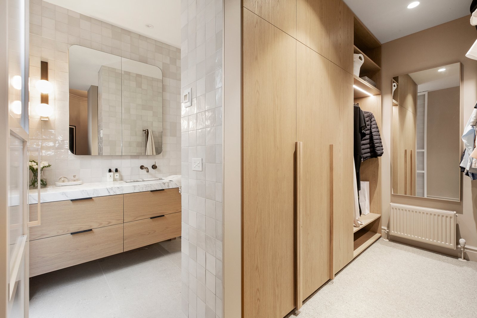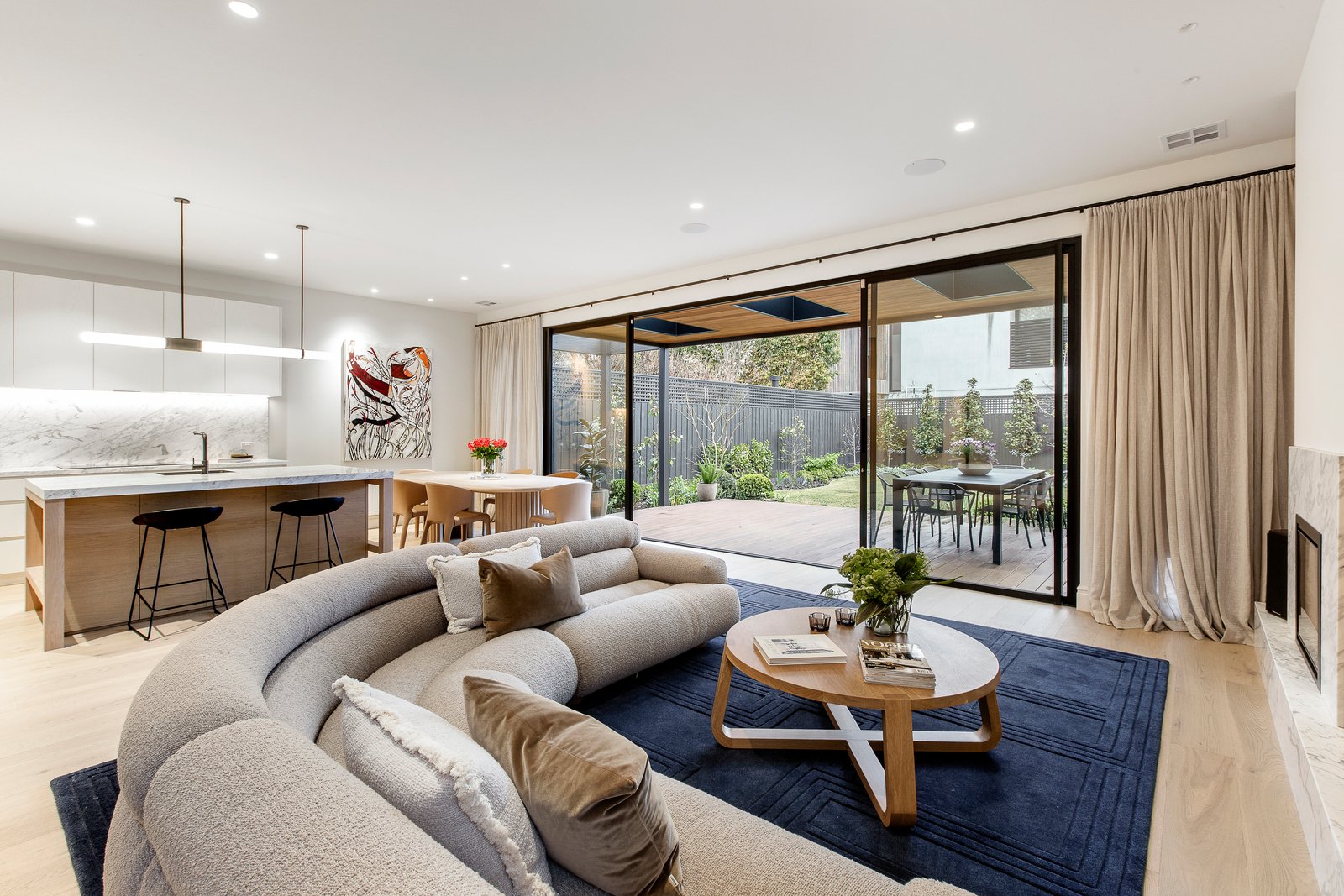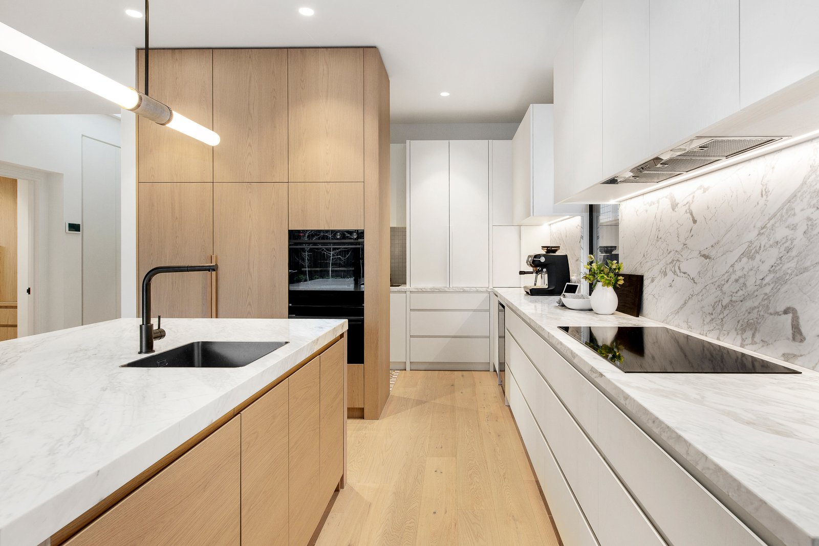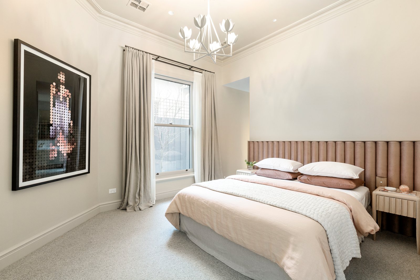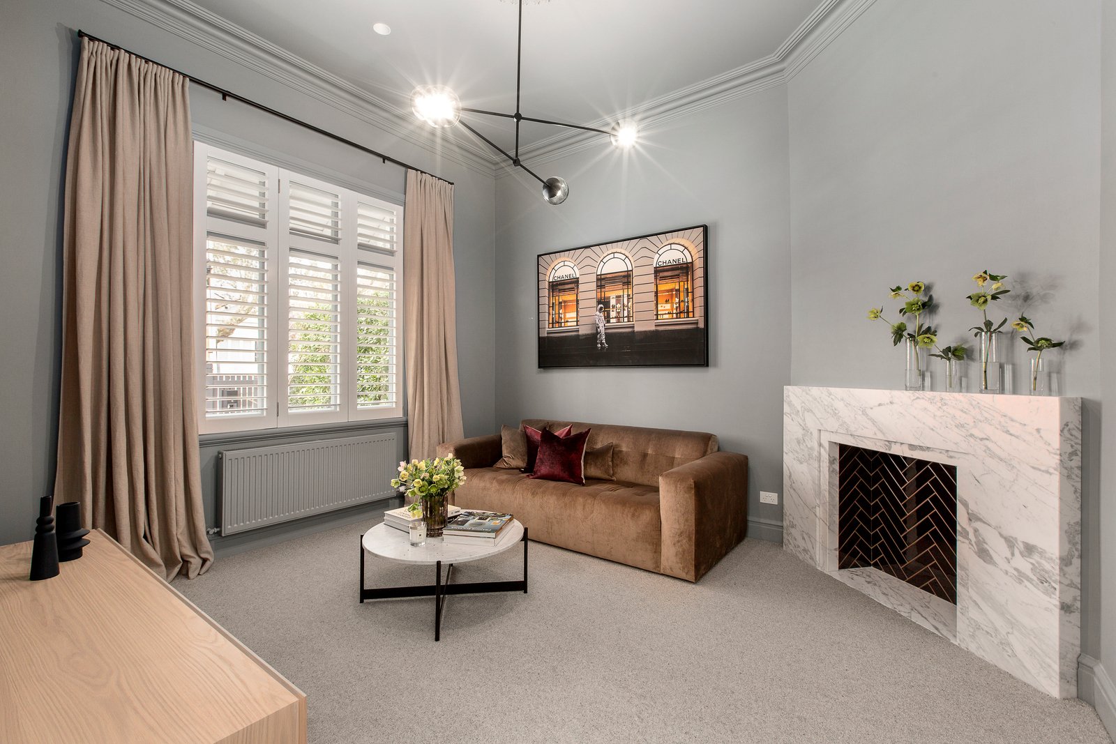 Interiors strike the perfect balance between timeless and contemporary, with a rich palette of neutral and saturated tones, custom timber veneer joinery, marble, and mosaic detailing. High ceilings, and ornate plasterwork are enhanced by designer pendant lighting, while linen curtains, thick wool carpets and oak floorboards add warmth and texture.