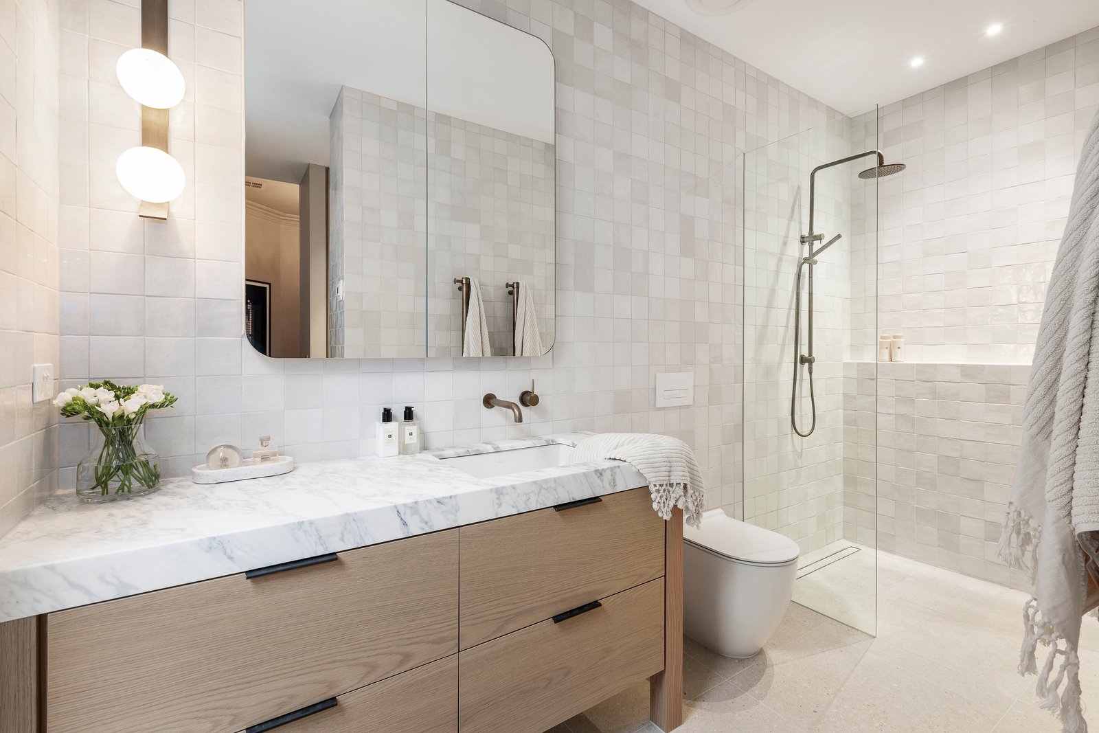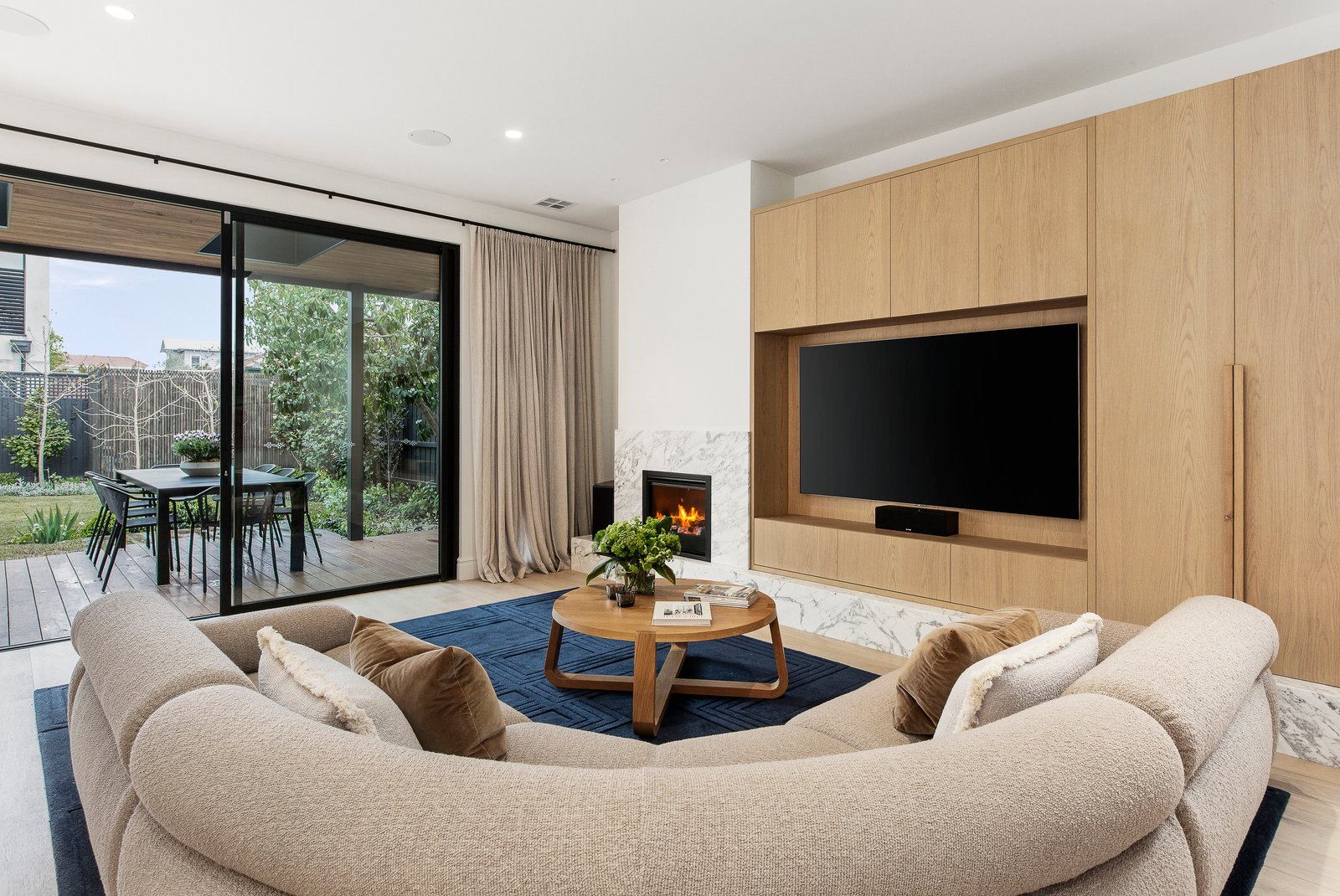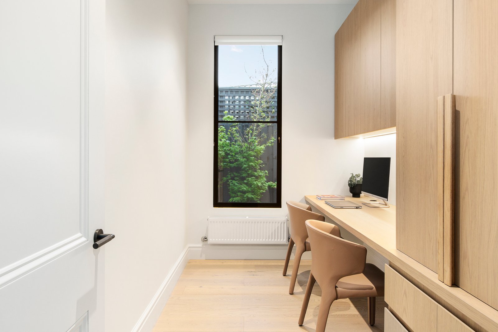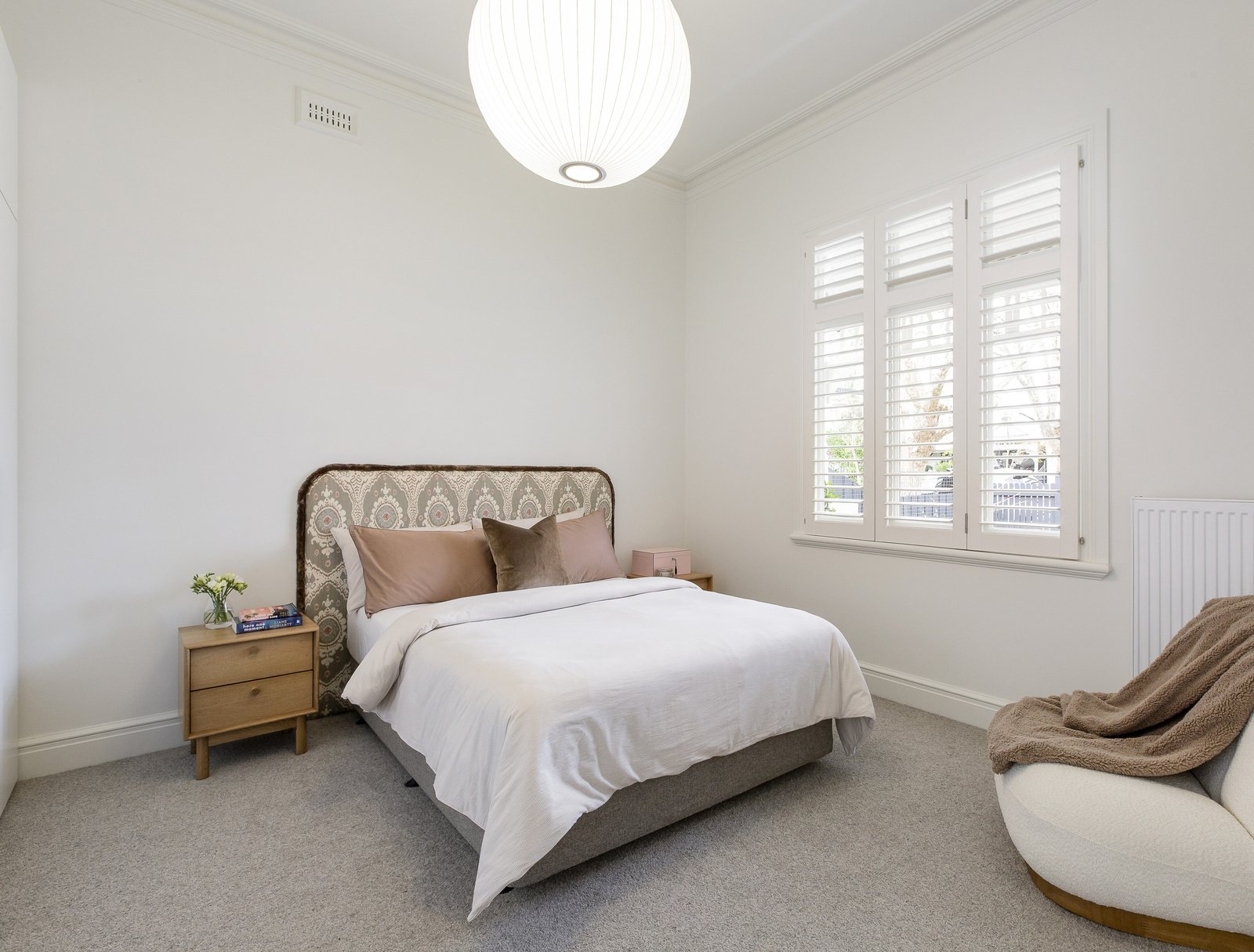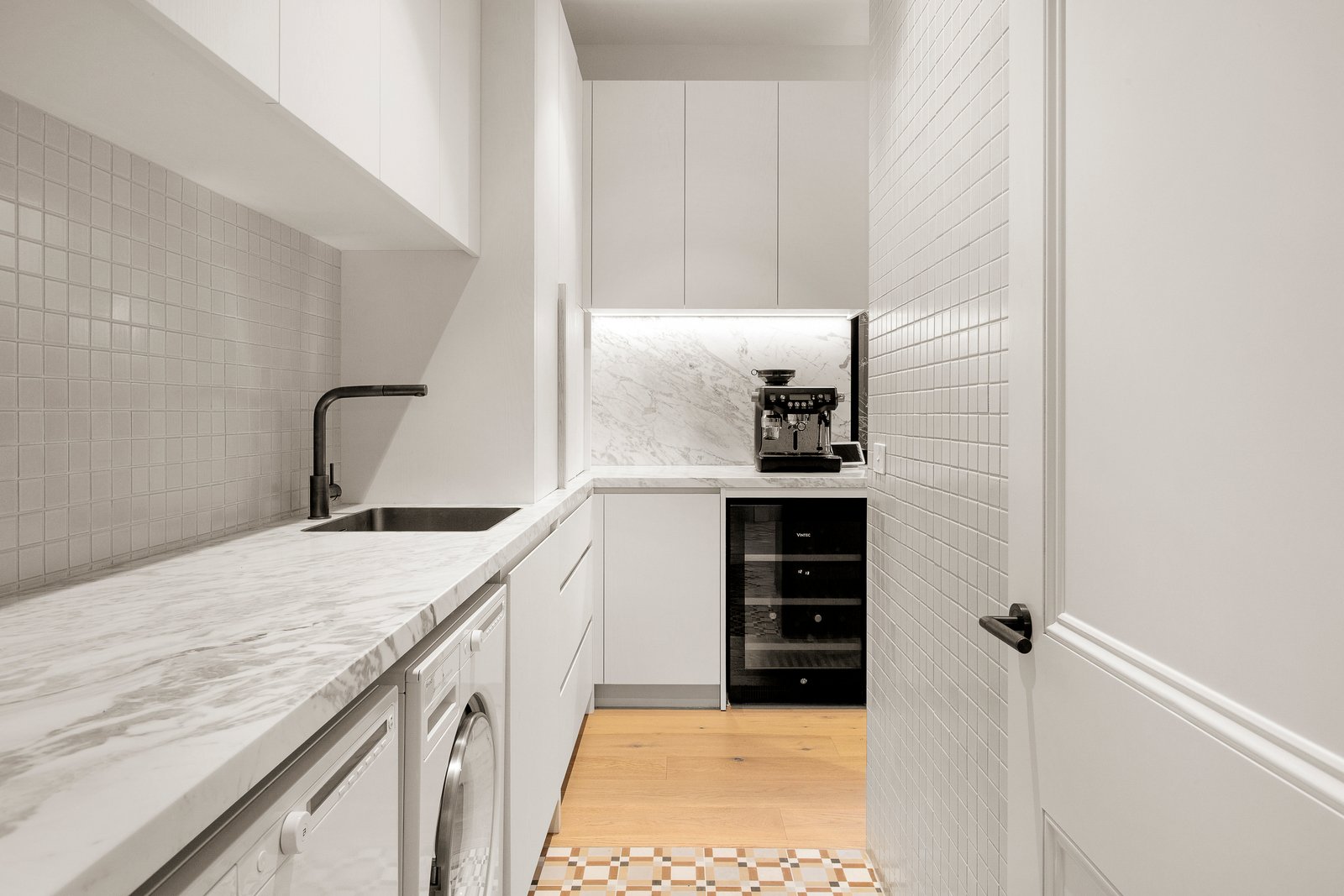 Interiors strike the perfect balance between timeless and contemporary, with a rich palette of neutral and saturated tones, custom timber veneer joinery, marble, and mosaic detailing. High ceilings, and ornate plasterwork are enhanced by designer pendant lighting, while linen curtains, thick wool carpets and oak floorboards add warmth and texture.