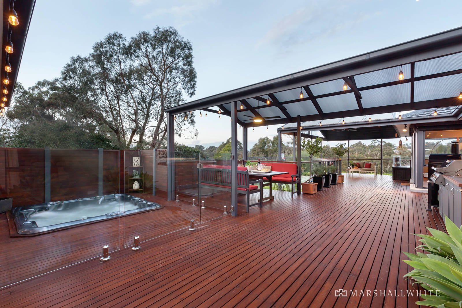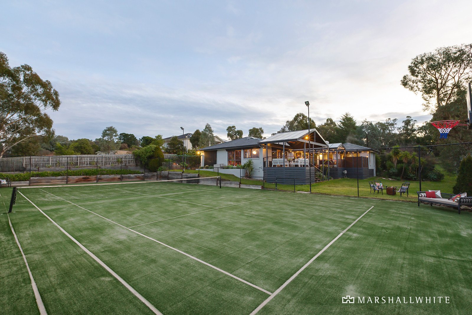 Designed for entertaining, the home's expansive timber deck can accommodate substantial gatherings. An inbuilt spa, built in BBQ area and pergola overlook panoramic treetop vistas. Below, the mod-grass tennis court is surrounded by lush lawns, an orchard of mature fruit trees, veggie gardens and a chicken coop.
