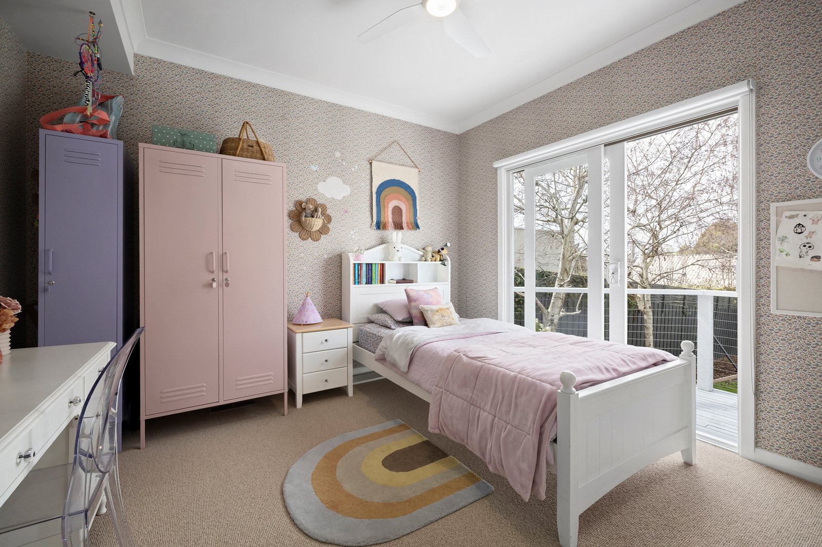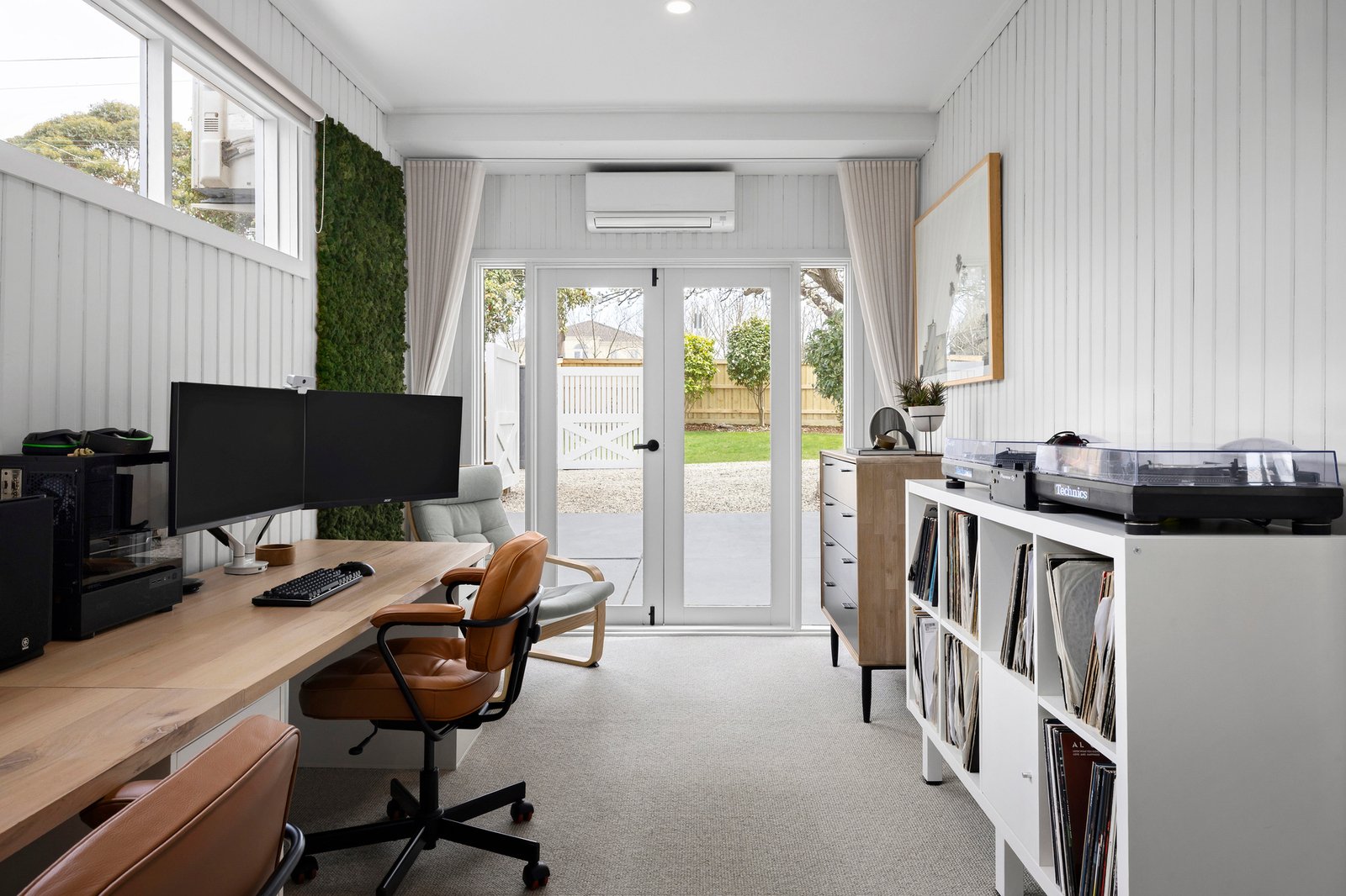 Presenting abundant street appeal in the heart of Mount Eliza’s ‘Golden Mile,’ the character-rich single storey weatherboard home is set behind a high timber fence with dual gated driveways and side-street access to a double remote-operated garage. Framed by a row of Callery pear trees that provide a verdant canopy in the summer months, the front entry door opens to reveal gracious, light-filled interiors with high ceilings and original cornices, large-format modernist windows, and a traditional open fireplace. A designer pendant defines the formal dining space, introducing contemporary style elements, while newly laid loop pile carpets add textured warmth to the formal living and dining areas, the four bedrooms, and the custom-fitted home office/studio, which has its own private entry - ideal as a retreat, consulting space or creative studio.