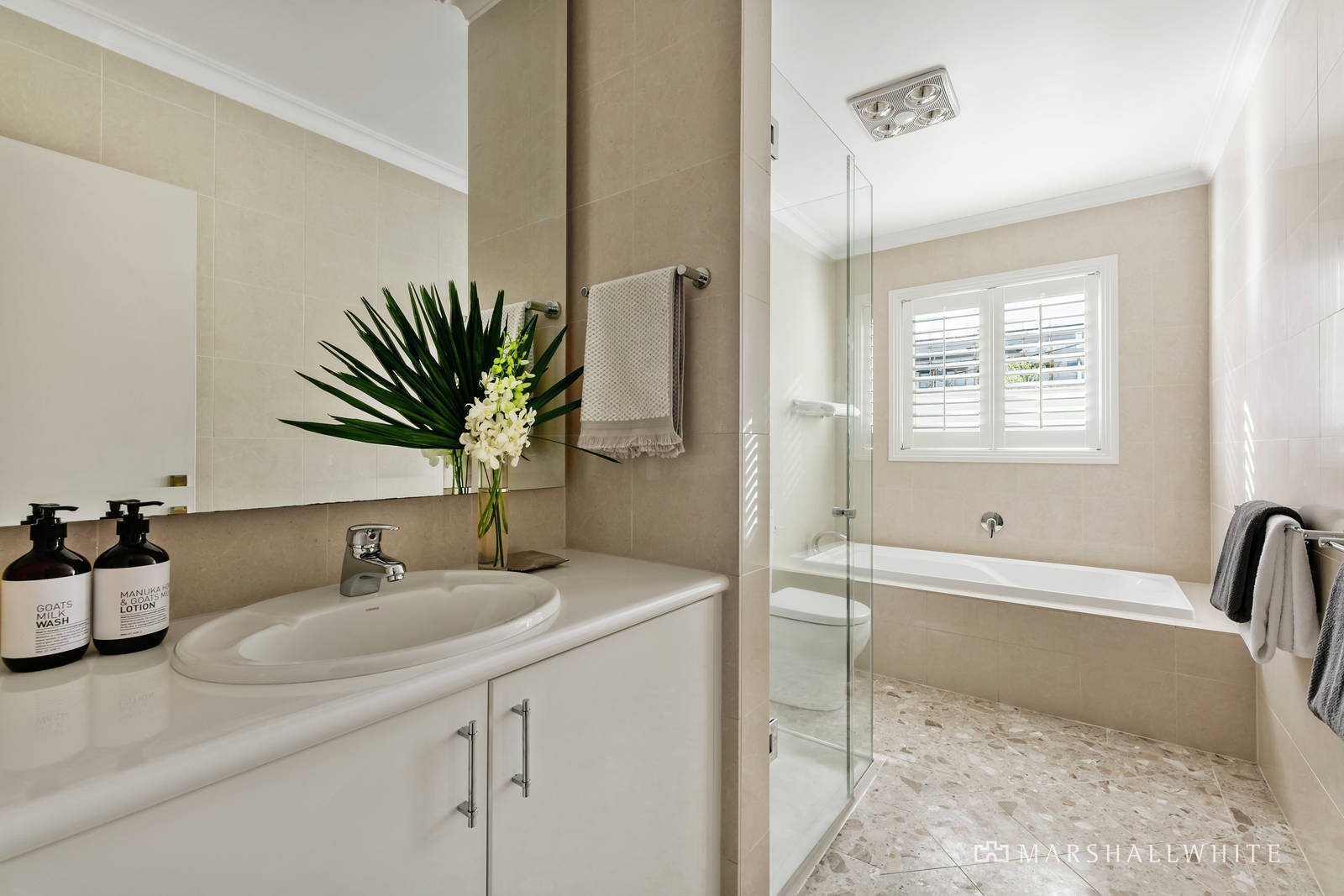 The marble entrance hall introduces a formal sitting and dining room of spectacular scale featuring timber floors and an open fire. The gourmet kitchen boasting granite benches and the light-filled living and dining room opens through French doors to the deep private northeast facing paved garden, all surrounded by lush greenery. Generous family accommodation upstairs comprises the lavish main bedroom with designer en suite and walk in robe, two additional bedrooms with built in robes, a spacious home office/retreat or 4th bedroom with built in robes and a stylish bathroom.