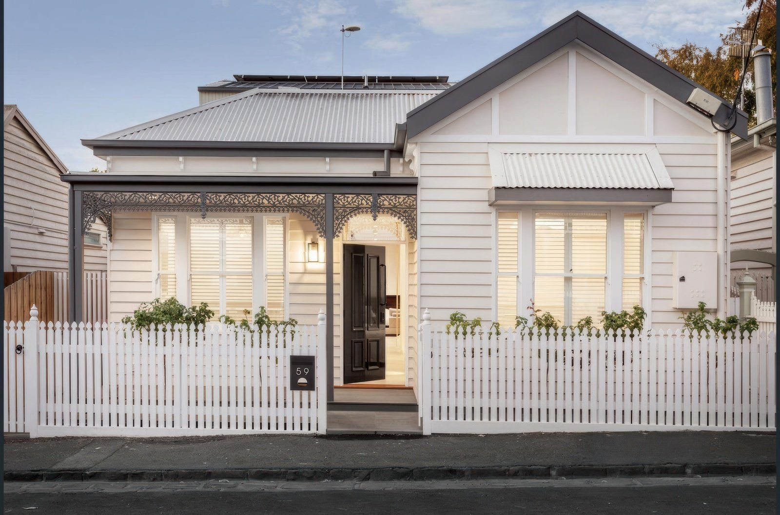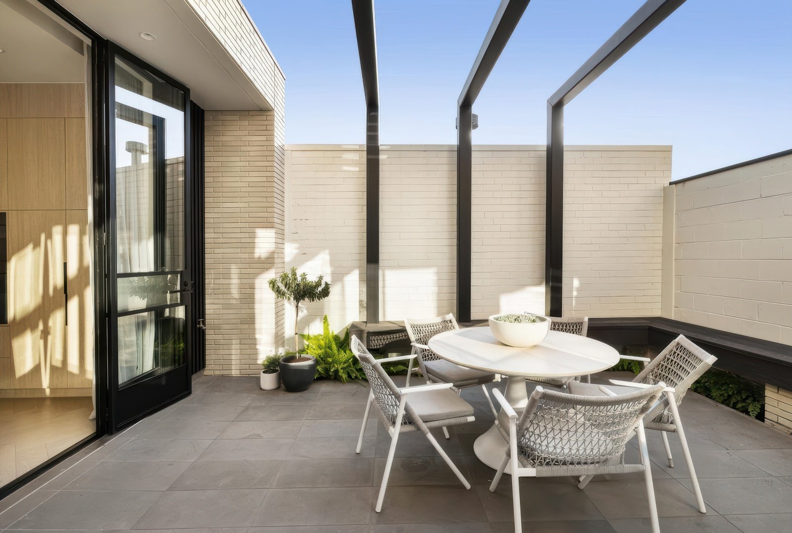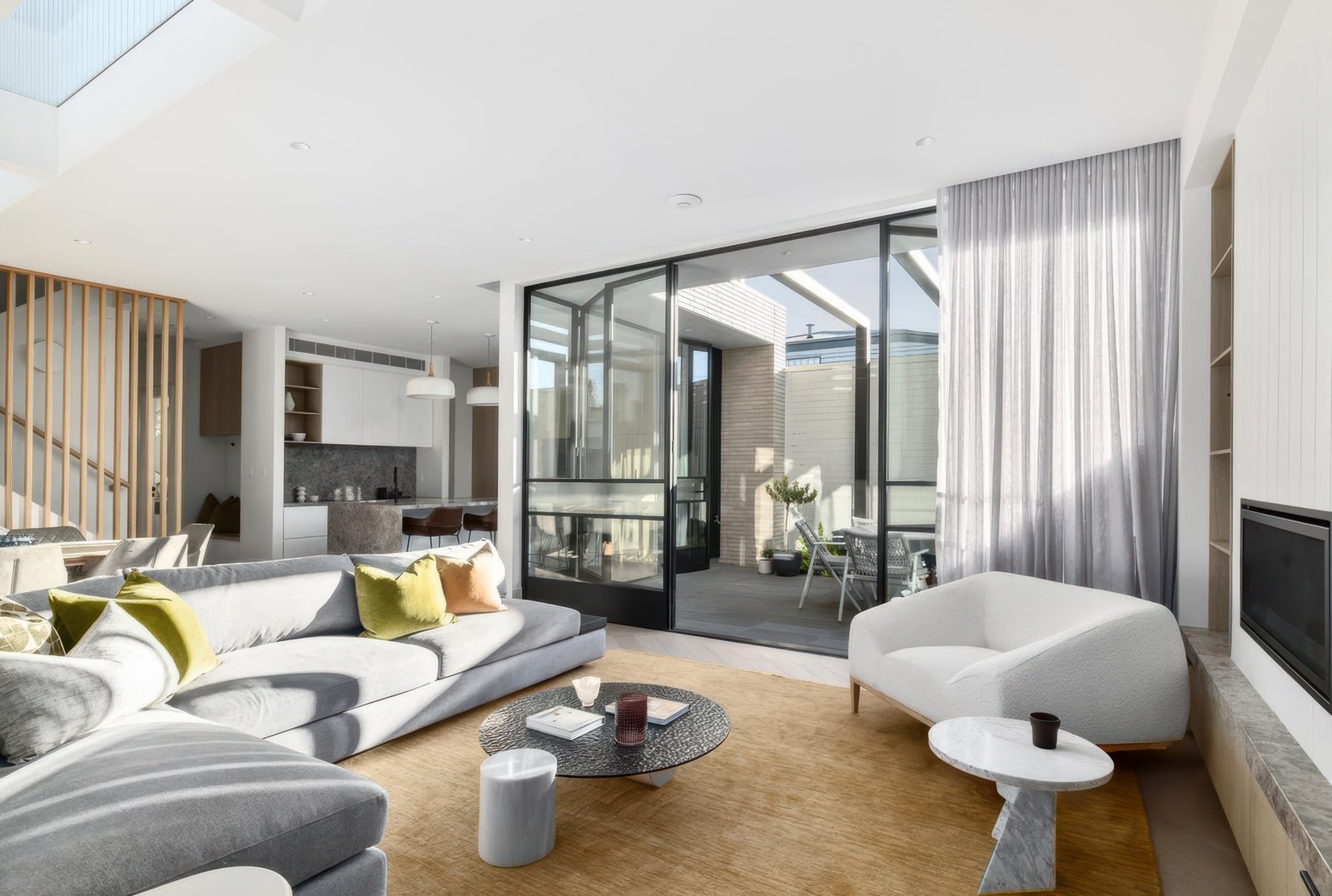 Expansive steel-framed doors connect indoors to a beautifully appointed north-facing bluestone courtyard, complete with built-in timber seating. Every detail has been thoughtfully considered, from designer lighting and double glazing to skylights, a gas fireplace, 5.55kW solar system, and extensive custom cabinetry.