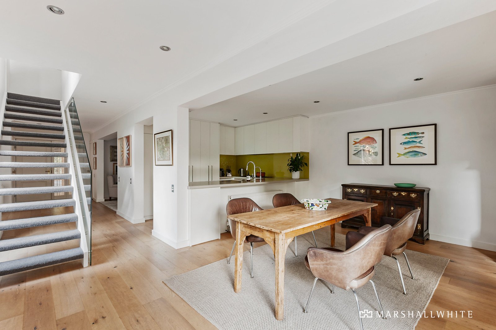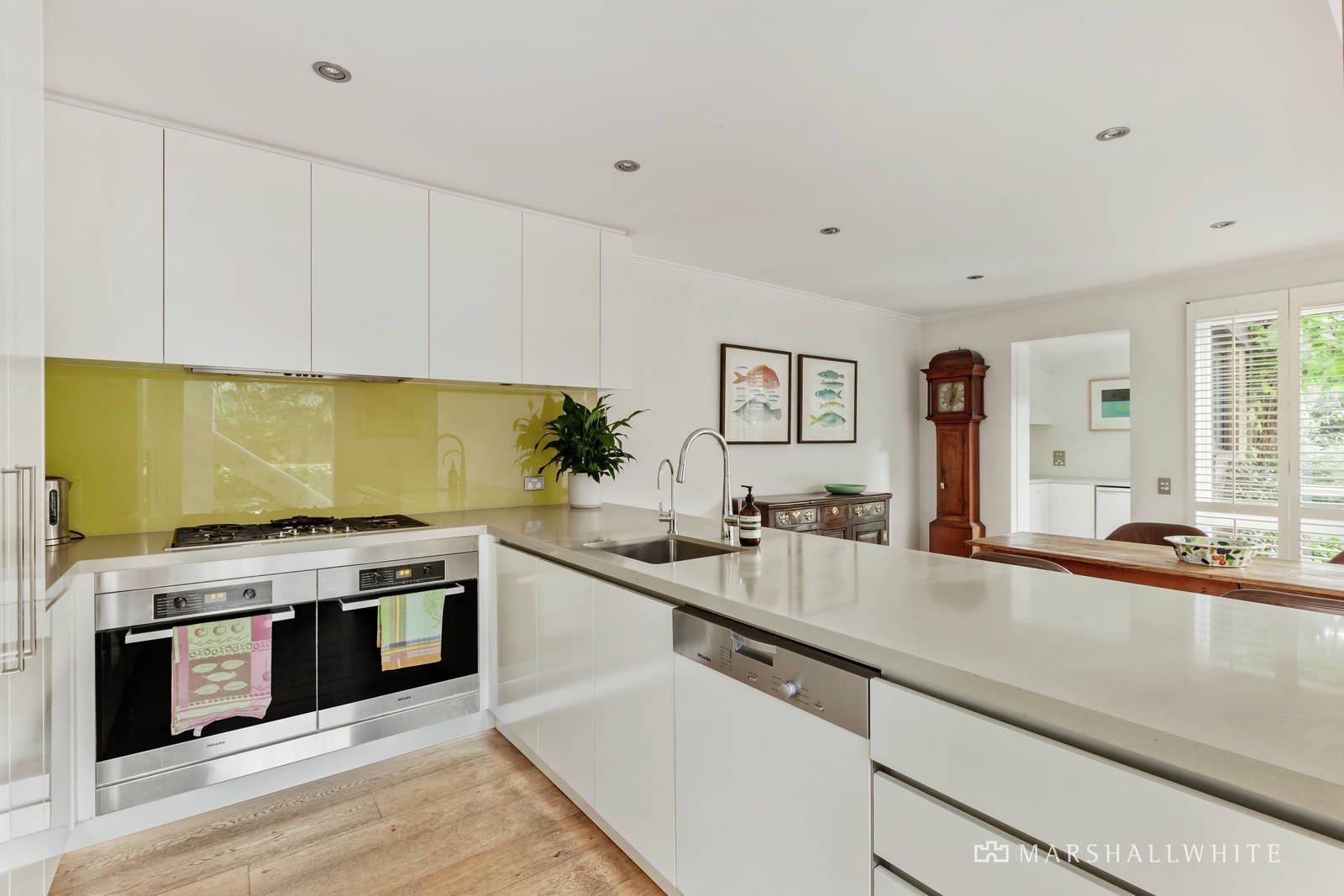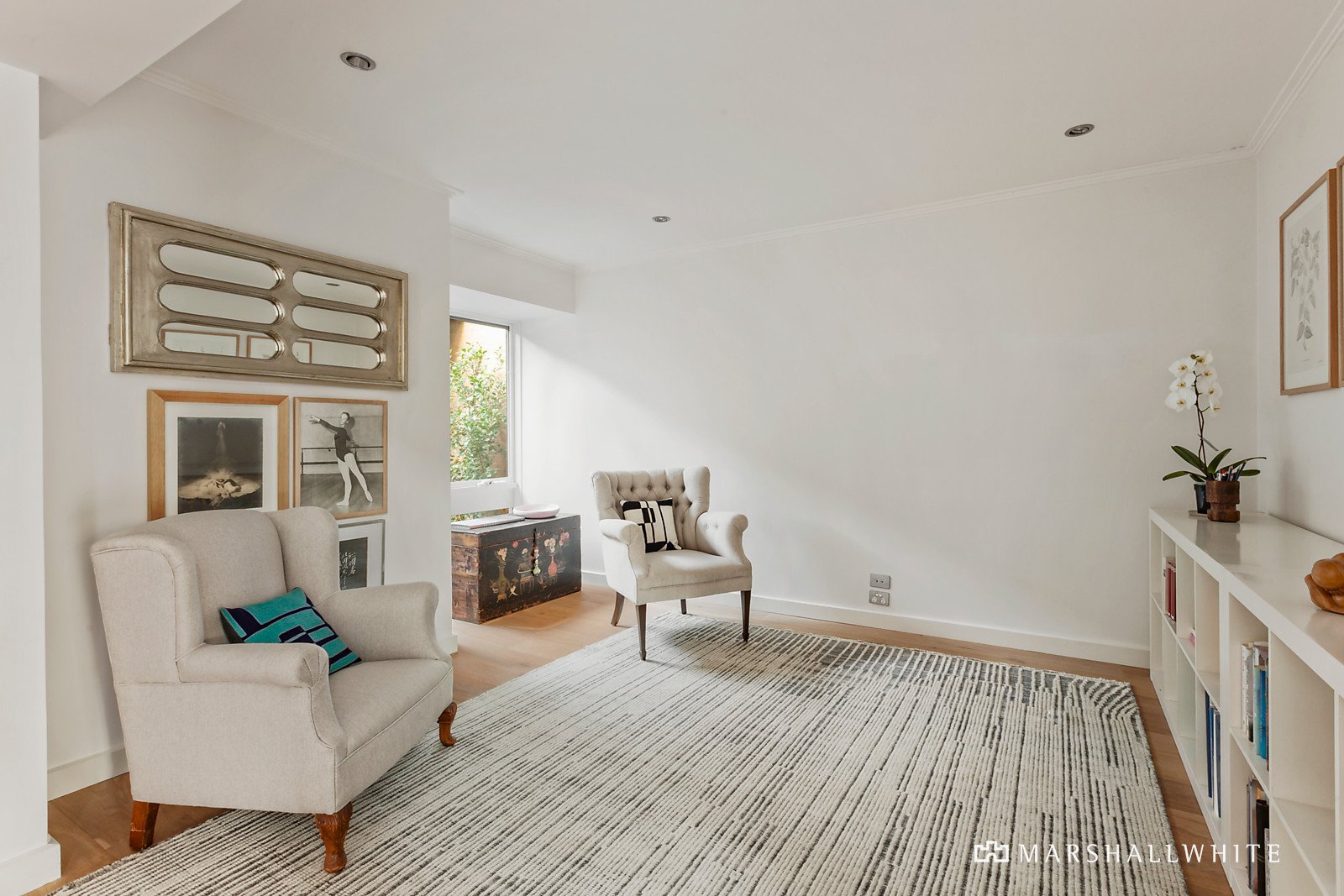 The streamlined and sun-drenched interior dimensions boast wide oak floors in the entrance hall, inviting library or retreat and generous living room opening out to a north-facing garden terrace. The superbly proportioned dining room and gourmet kitchen appointed with stone benches and a full suite of Miele appliances including integrated fridge extends out to the deep private north-facing landscaped garden with a second terrace shaded by a 100 year old Weeping Elm tree. The wonderful sense of light continues upstairs through the beautiful main bedroom with designer en suite and walk in robe, two additional bedrooms with built in robes, a stylish bathroom and spacious fitted home office.