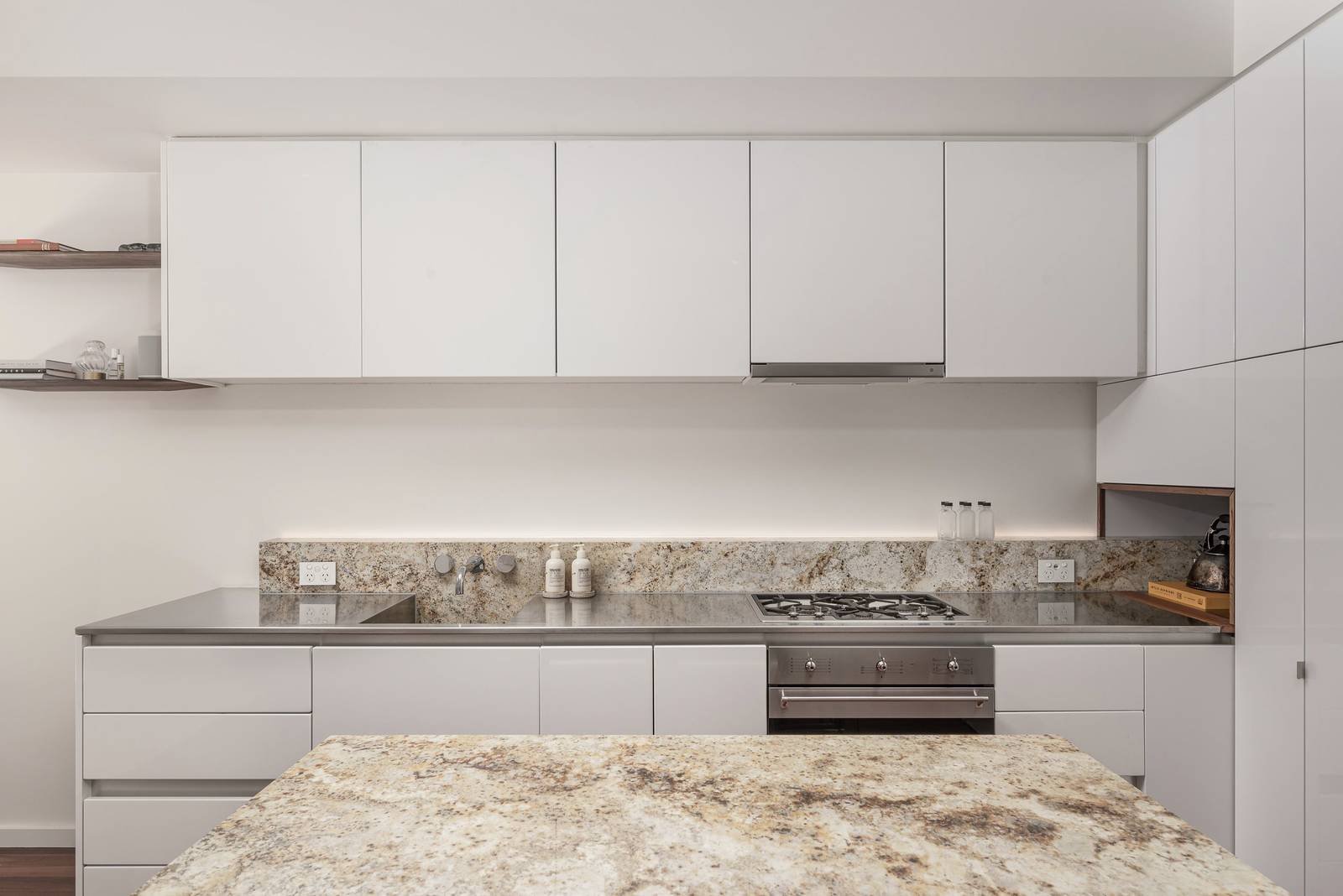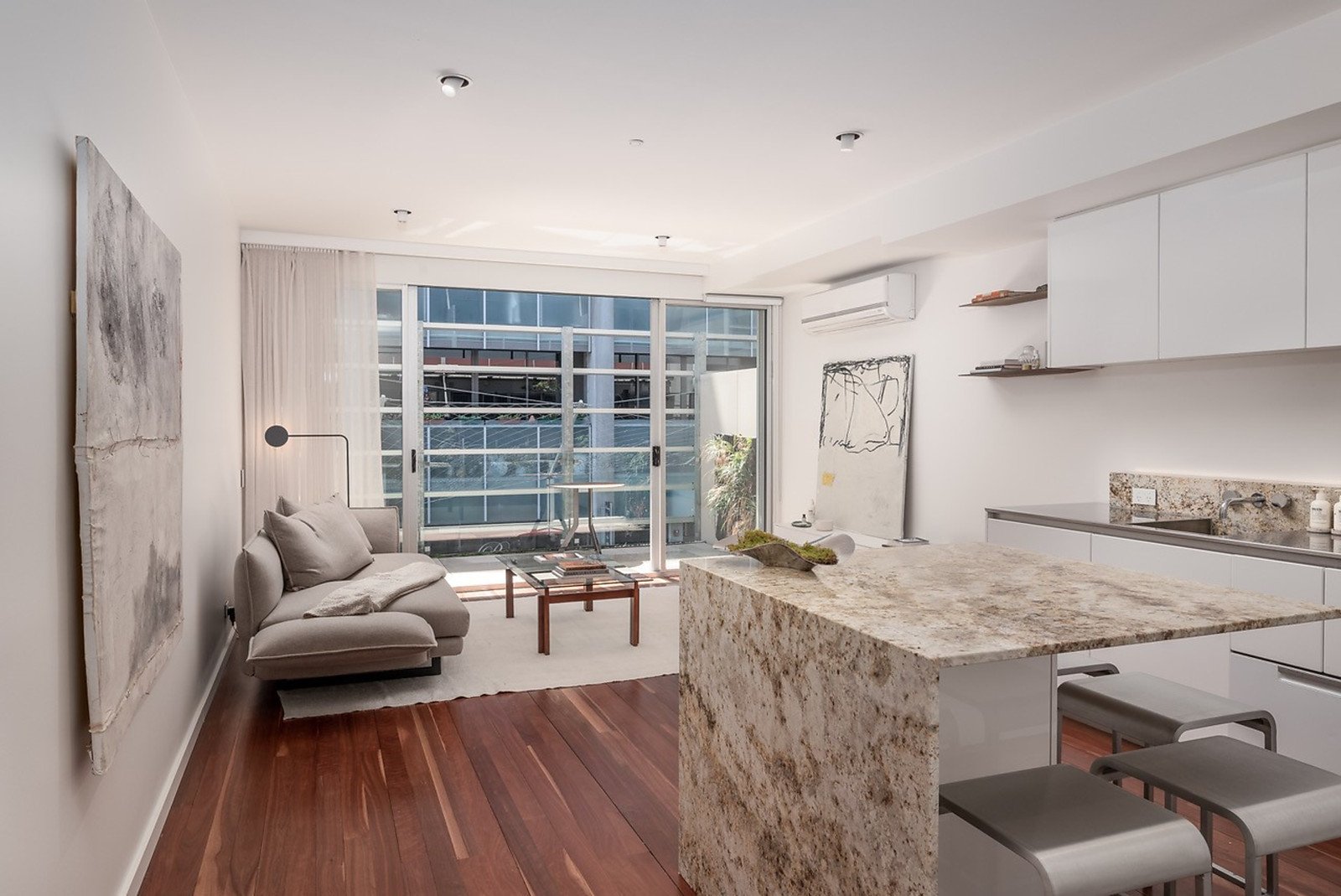 Organised around a visually striking and remarkably versatile, African granite island counter, the kitchen reveals a tastefully integrated stainless steel benchtop and SMEG appliances. The open-plan living spills easily outdoors to a north-facing balcony where the natural sunlight is particularly up-lifting. Leading off the bedroom, a private planted terrace introduces a zen-like serenity. No detail has been overlooked in this home with hardwood Ironbark flooring and ambient dimmable lighting throughout, the flawless limestone-rendered bathroom features a walk-in shower, and the year-round comfort of split system heating and cooling.