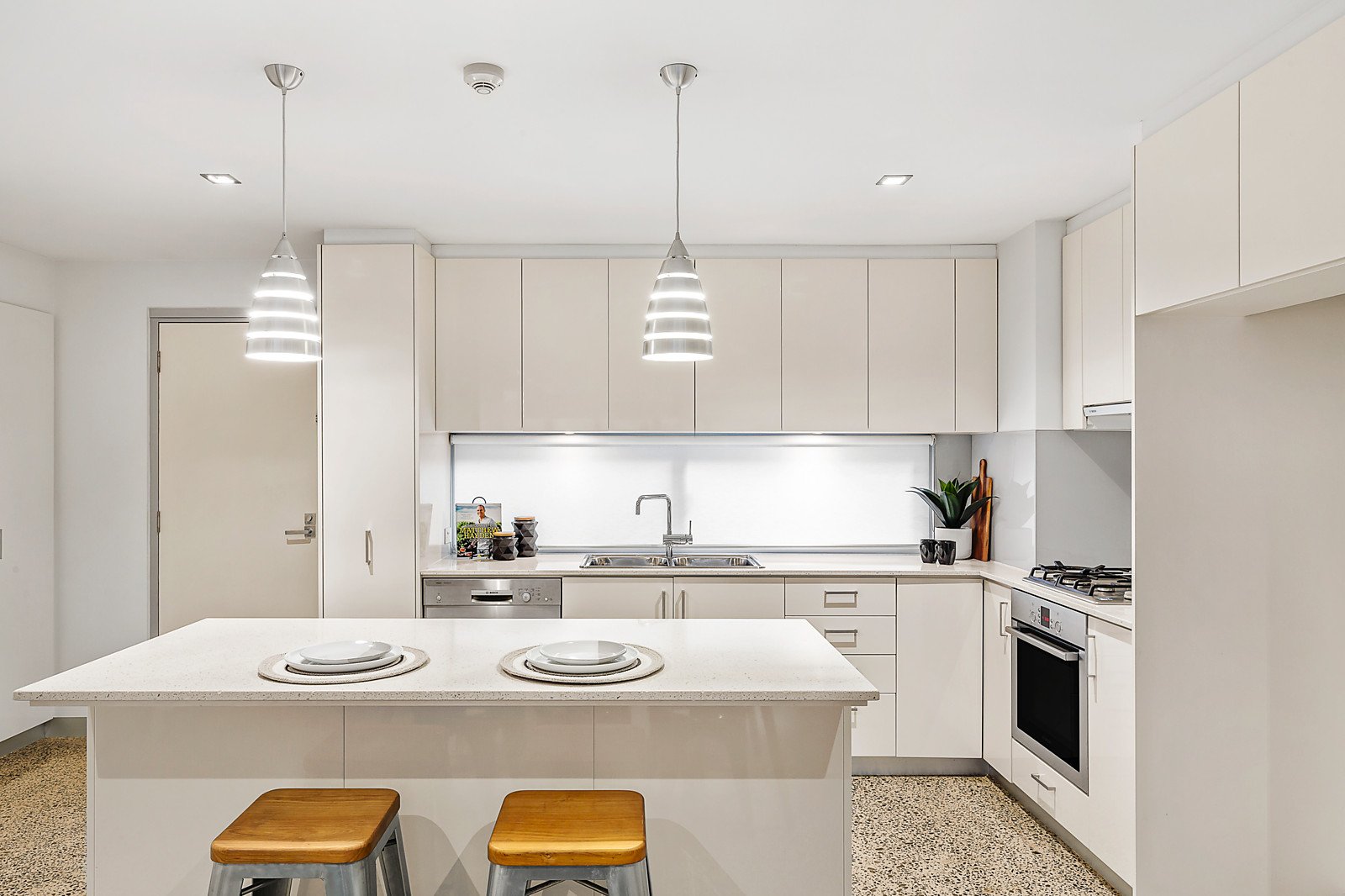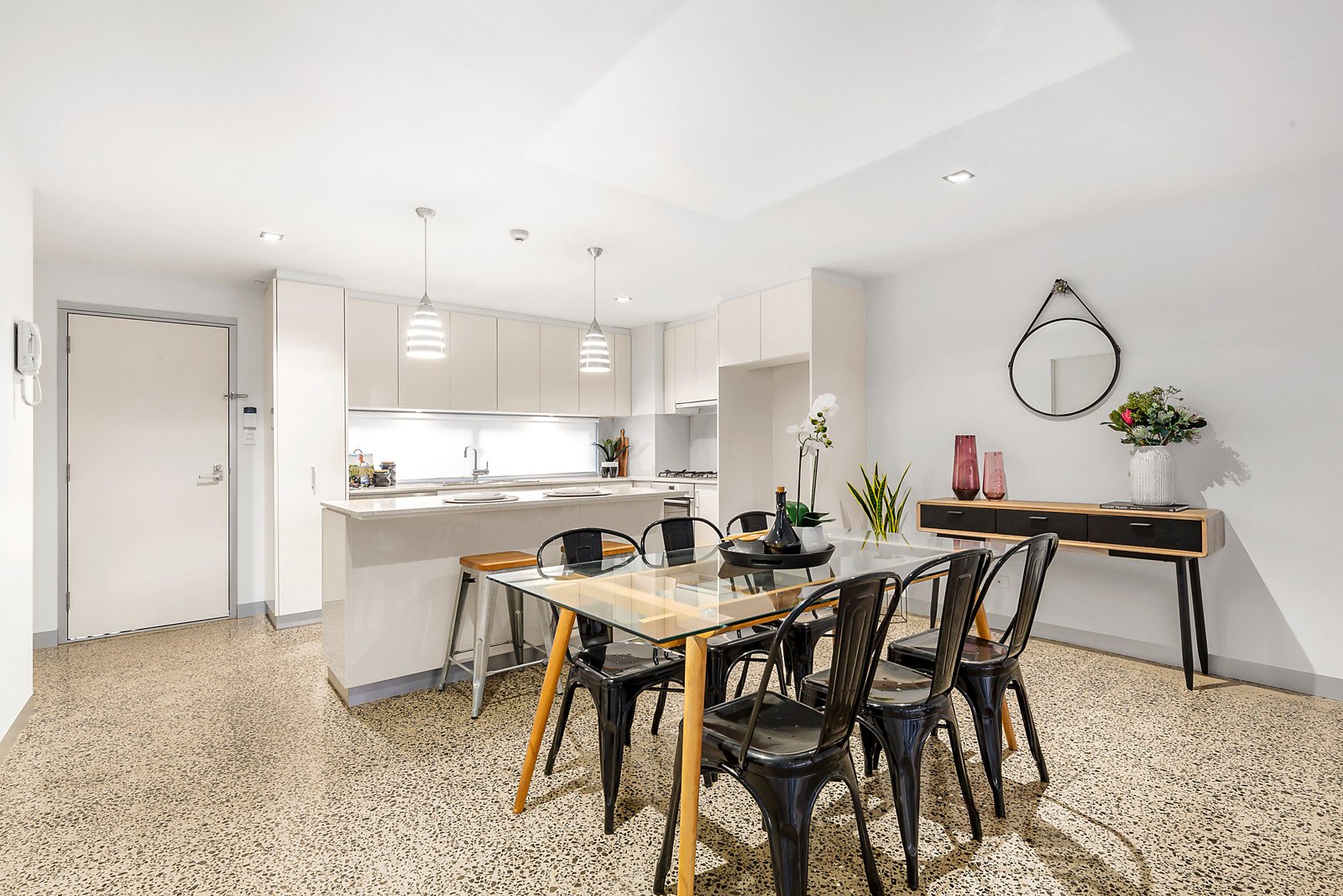 Terrazzo style polished concrete floors add to the light-filled ambience of the expansive open plan living and dining spaces with a gourmet kitchen featuring Bosch appliances and stone benches. Bi-fold doors open the living to a private bluestone paved north-facing courtyard with rear lane access. On the level above, the main bedroom with walk in robe and chic en suite is matched by a second double bedroom with built in robe and a stylish bathroom. A large retreat or 3rd bedroom on the top level opens to a large private north-facing rooftop terrace.