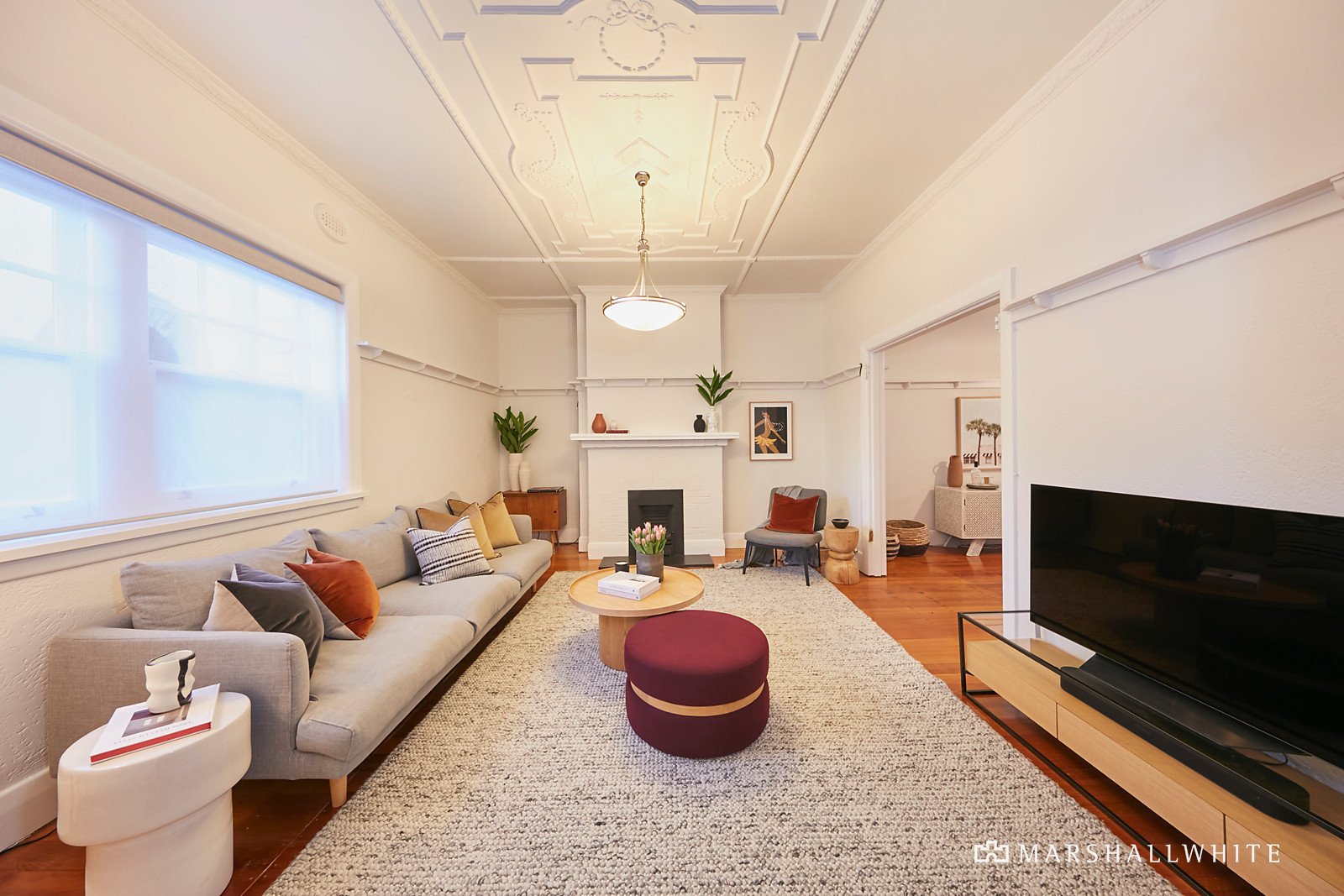 - Spacious lounge with gas fireplace, picture rails, ornate ceilings