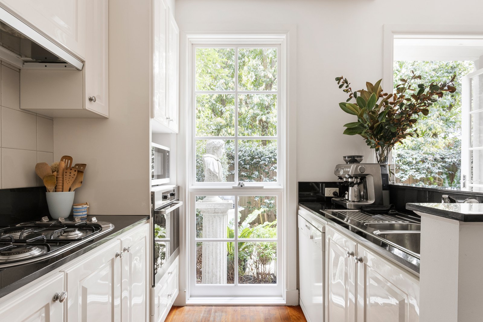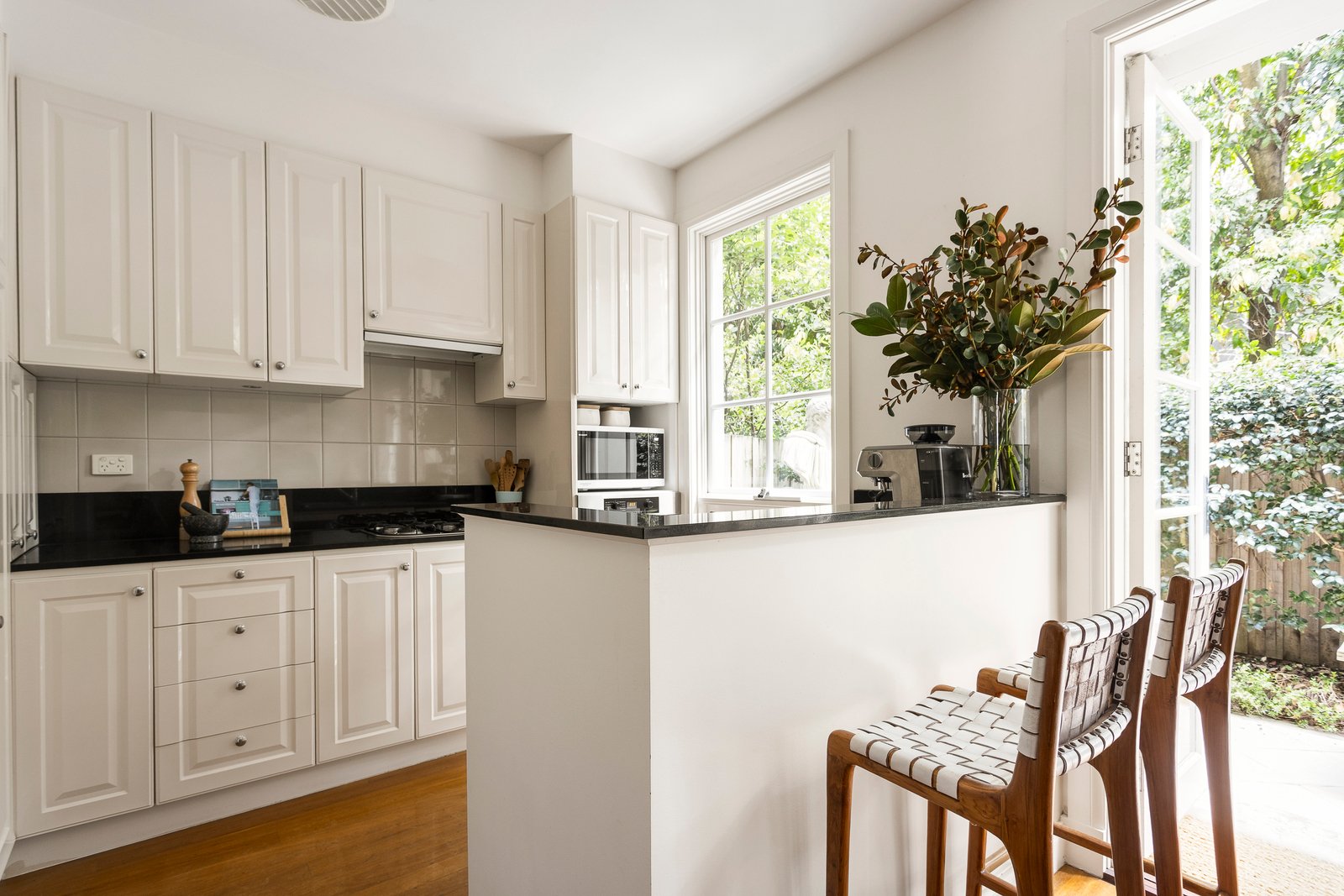 Beyond the auto-gated entry with intercom and alarm system, light-filled interiors unfold across two levels. A formal living space flows into a striking kitchen appointed with Miele and Blanco appliances, stone finishes and abundant storage, while open-plan dining extends through French doors to a private north-facing courtyard framed by lush greenery. The seamless connection between indoor and outdoor spaces creates a tranquil retreat or entertainer’s haven.