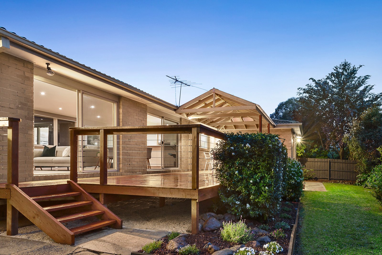 Bathed in year round northern light, the expansive living and dining room featuring timber floors is served by a superbly appointed modern kitchen with Ilve oven. Two sets of glass sliders open out to a large deck with covered section ideal for outdoor entertaining overlooking the private north-facing garden. Also enjoying garden views, the main bedroom with chic en suite and built in robe is accompanied by three additional bedrooms fitted with robes and a central bathroom.